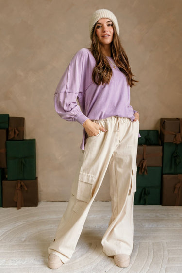 The Carter Washed Lavender Side Slit Tee brings a soft, relaxed vibe to your casual wardrobe. Made from washed mineral lavender knit fabric, this top offers a cozy, lived-in feel with a subtle textured trim for added detail. The round neckline and long sleeves with cuffs provide a comfortable, classic fit, while the side slits offer a modern touch and enhance its laid-back silhouette. Perfect for layering or wearing solo, the Carter tee is a versatile, easy-to-style piece that adds a touch of effortless charm to any outfit.