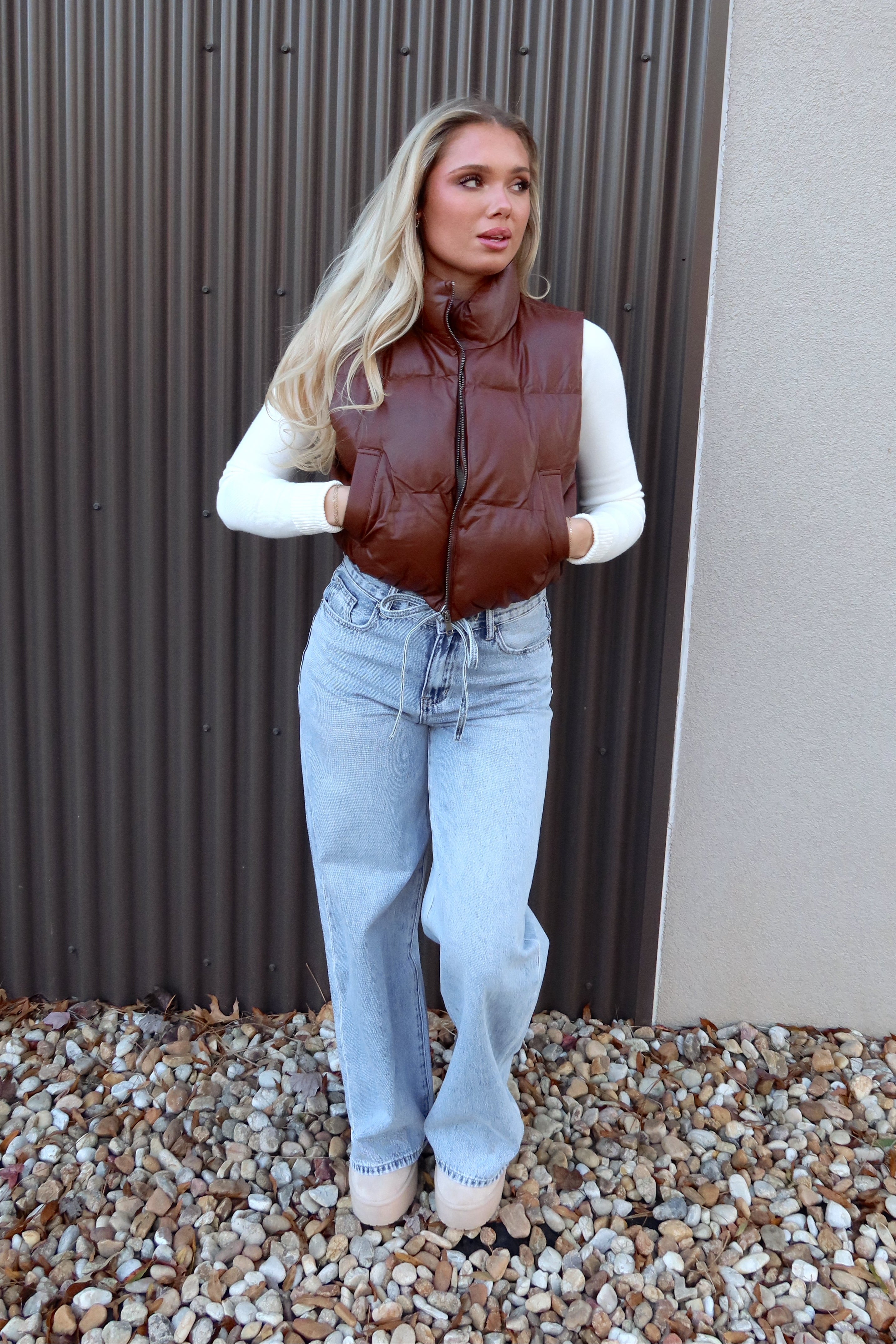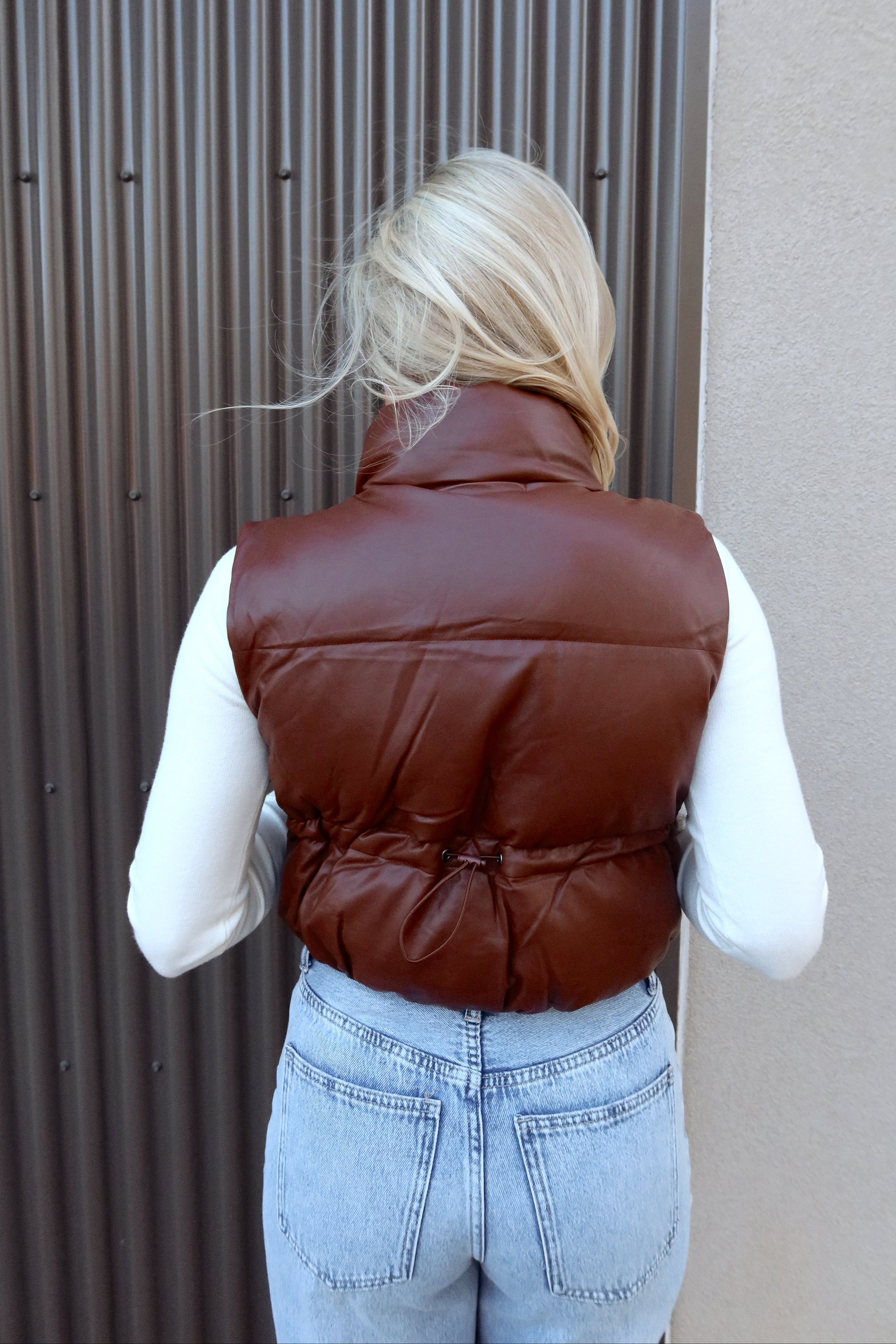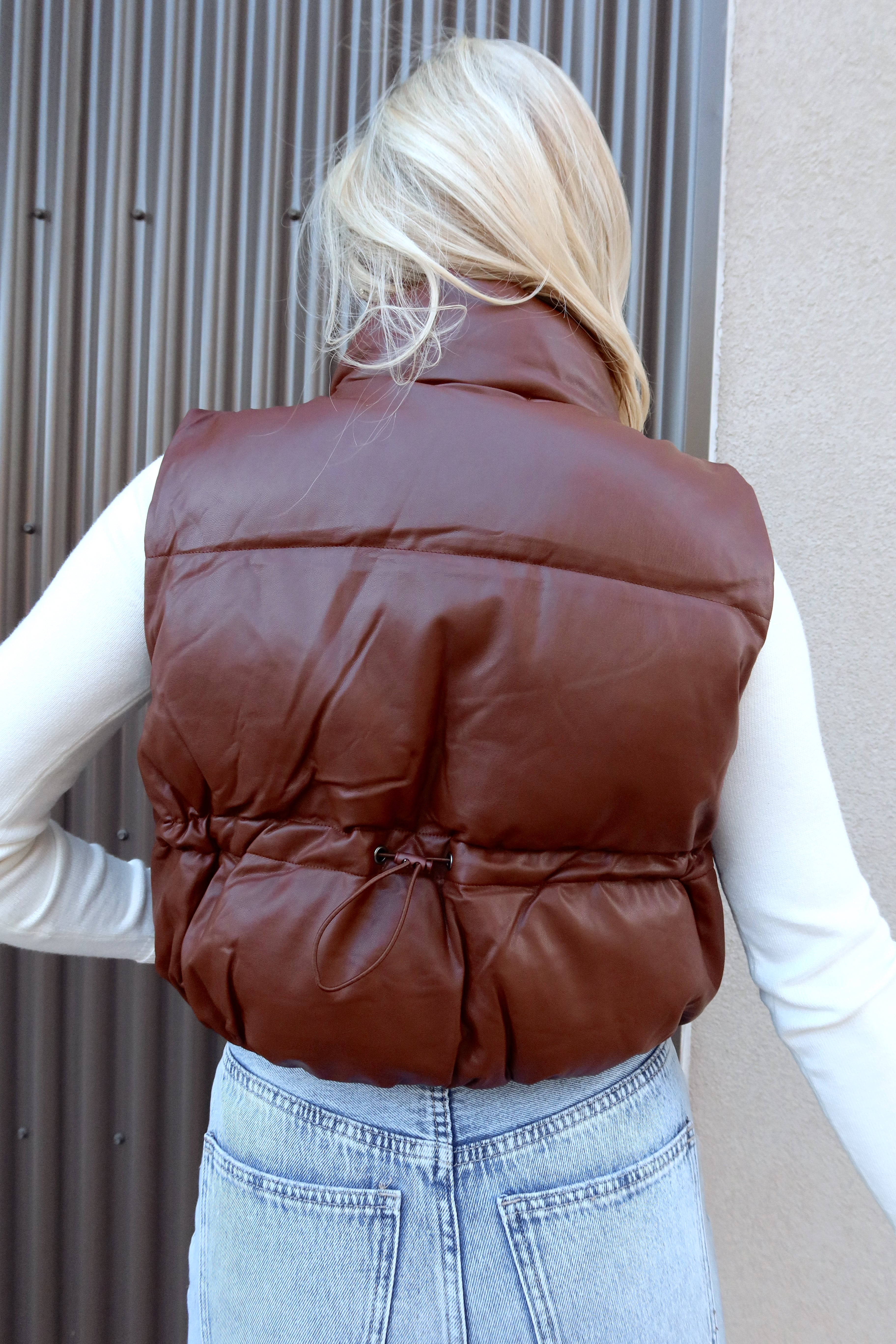 The Chantel Brown Faux-Leather Puffer Vest brings a sleek, modern edge to your outerwear lineup. Made from rich brown faux-leather puffer fabric, this vest instantly elevates casual outfits with its polished texture and structured silhouette. The high neckline and cropped waist add a trend-forward touch, making it perfect for layering over sweaters, long sleeves, or athleisure pieces.