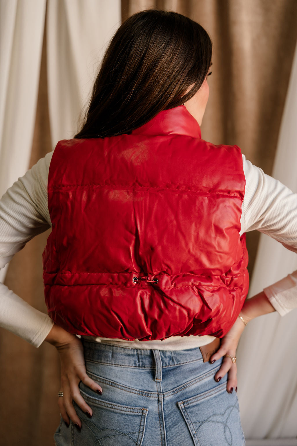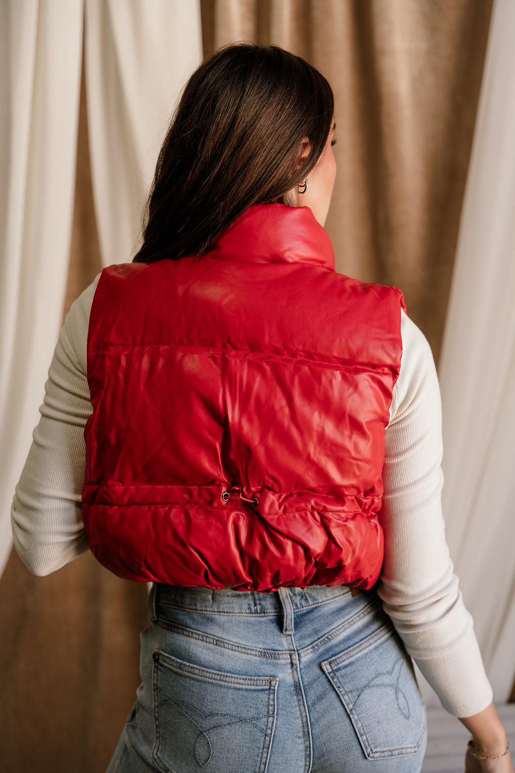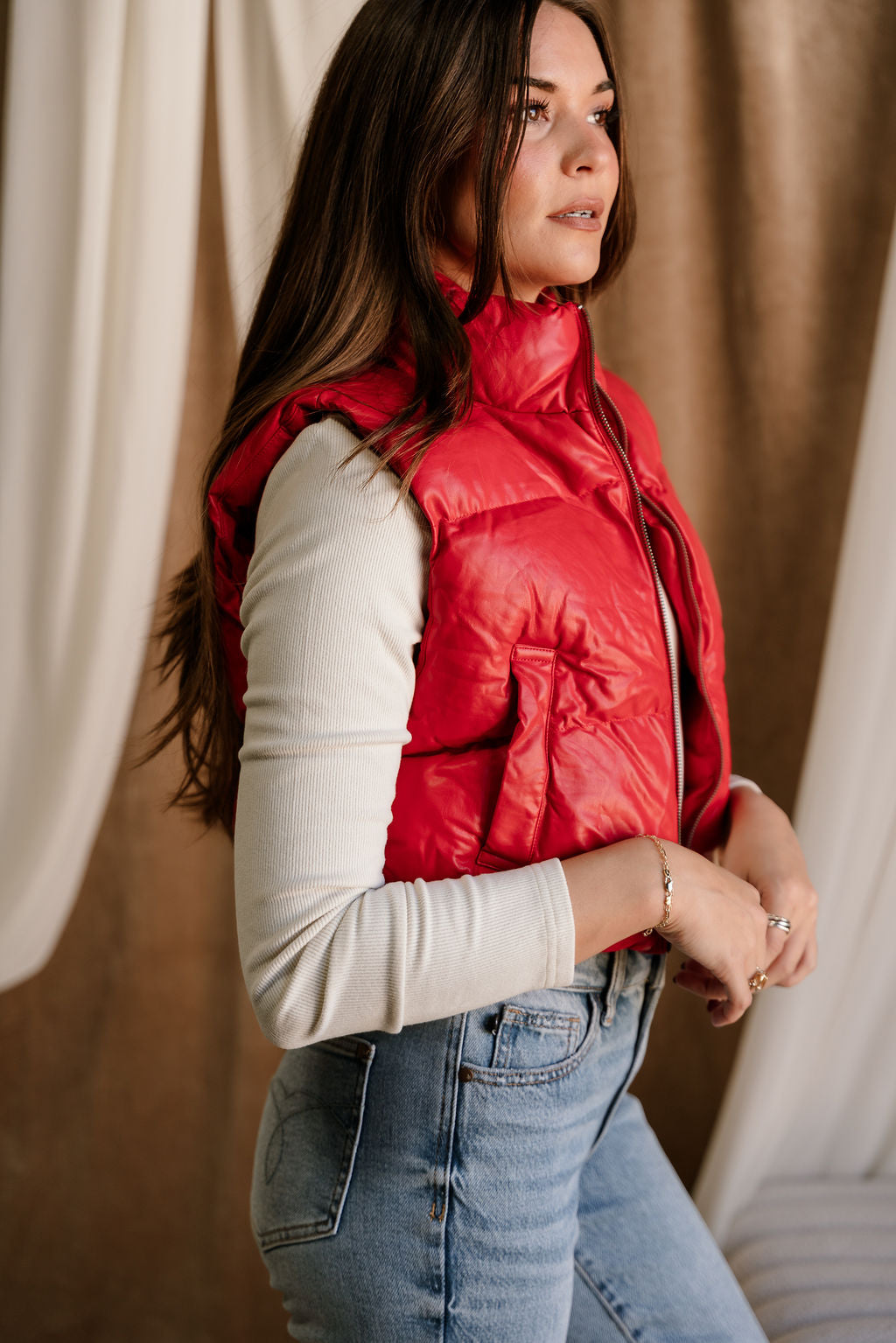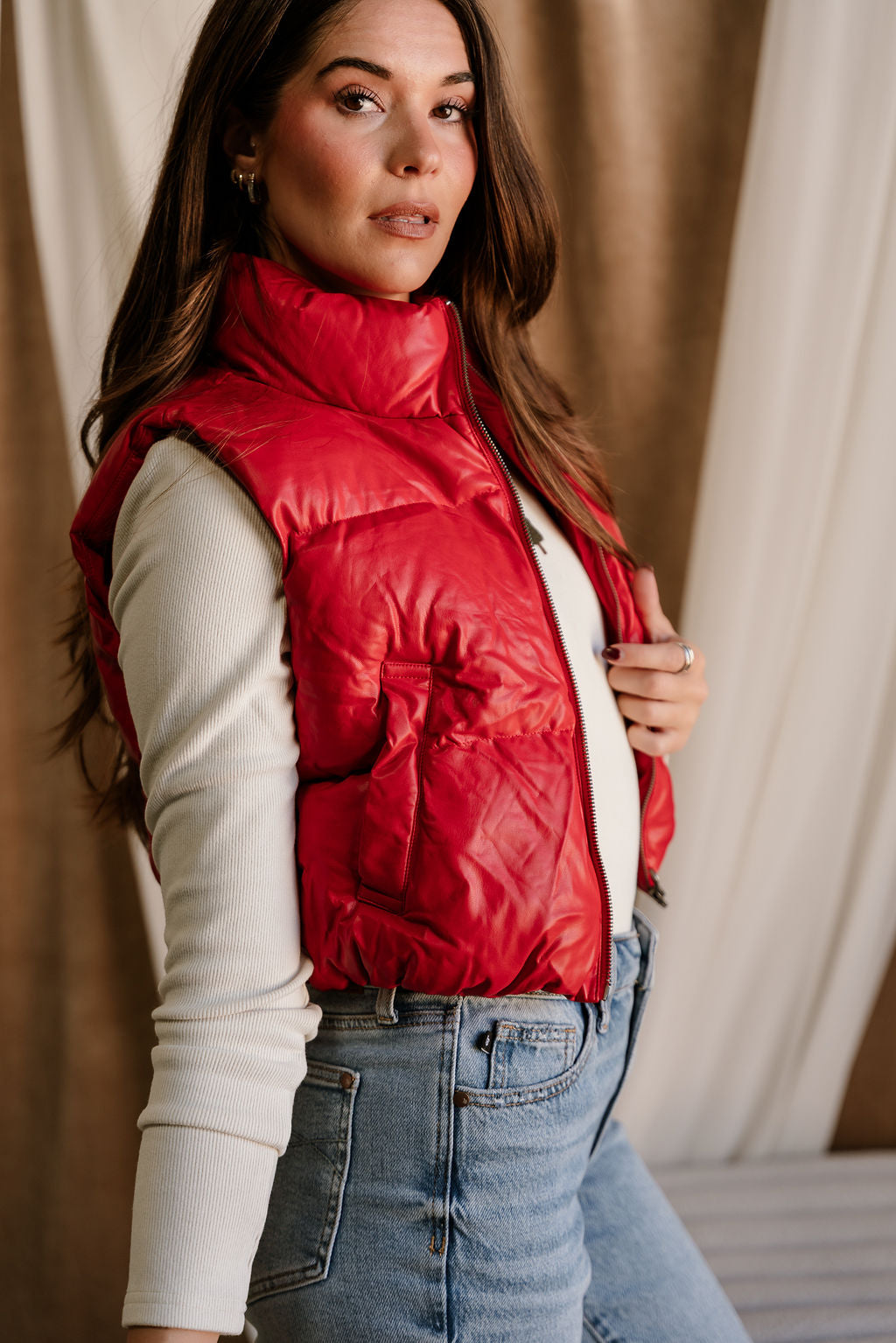 Make a bold, sporty-chic statement with the Chantel Red Faux-Leather Puffer Vest. Designed with vibrant red faux-leather puffer fabric, this vest brings a sleek, modern edge to your cold-weather layering. The high neckline adds extra warmth and structure, while the sleeveless, cropped silhouette creates a flattering, fashion-forward shape. Functional side pockets and a smooth front zip-up closure keep things practical without sacrificing style. Perfect over fitted long sleeves, knits, or hoodies, the Chantel Vest adds an eye-catching pop of color and texture to any casual or street-style look.
