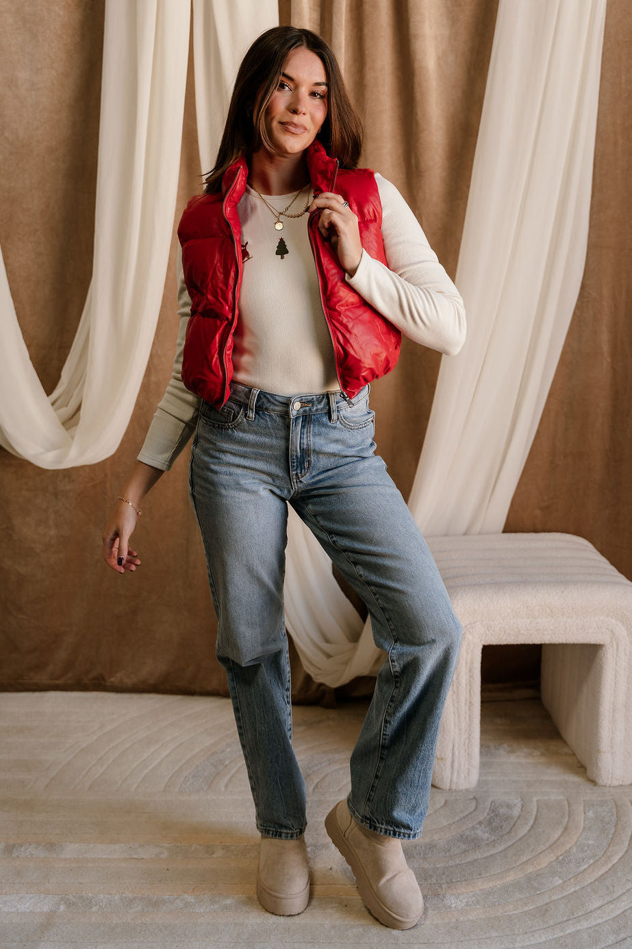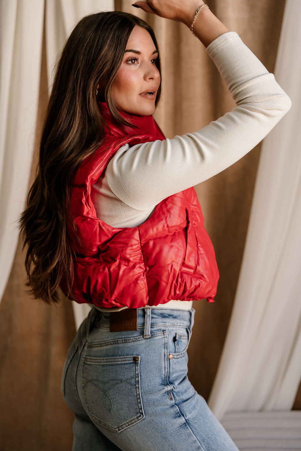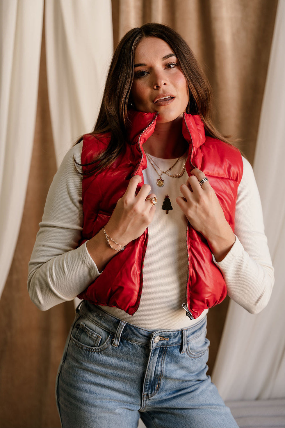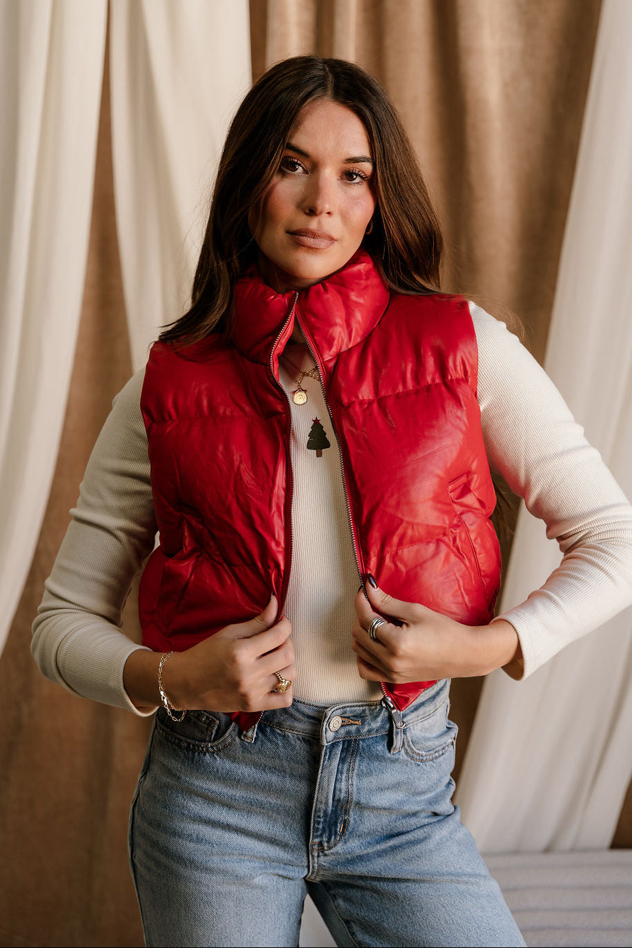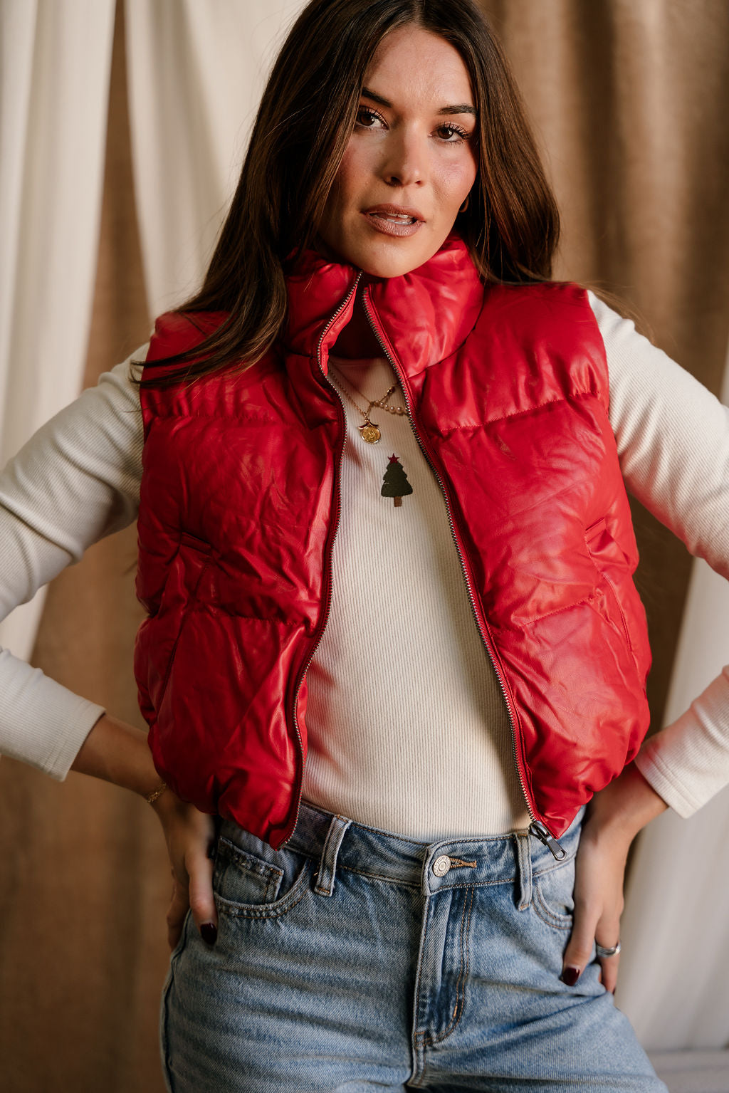 Make a bold, sporty-chic statement with the Chantel Red Faux-Leather Puffer Vest. Designed with vibrant red faux-leather puffer fabric, this vest brings a sleek, modern edge to your cold-weather layering. The high neckline adds extra warmth and structure, while the sleeveless, cropped silhouette creates a flattering, fashion-forward shape. Functional side pockets and a smooth front zip-up closure keep things practical without sacrificing style. Perfect over fitted long sleeves, knits, or hoodies, the Chantel Vest adds an eye-catching pop of color and texture to any casual or street-style look.