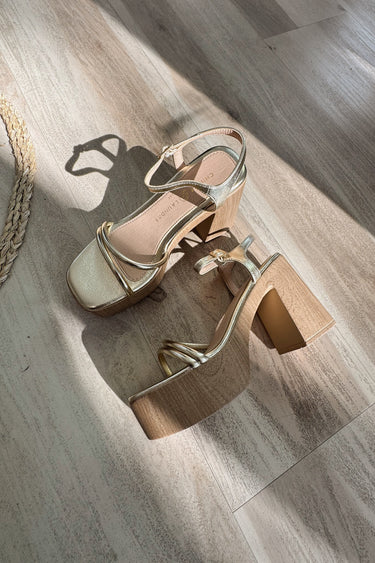 Designed with both style and stability in mind, the Avianna Heel features a standout 4.25-inch block heel paired with a 1.75-inch platform sole. This combination delivers impressive height without compromising comfort, allows you to move with confidence at weddings, parties, or nights out. The faux wooden sole adds an earthy, contrasting element to the glitzy gold upper, creating a modern, balanced look that’s both edgy and elegant.