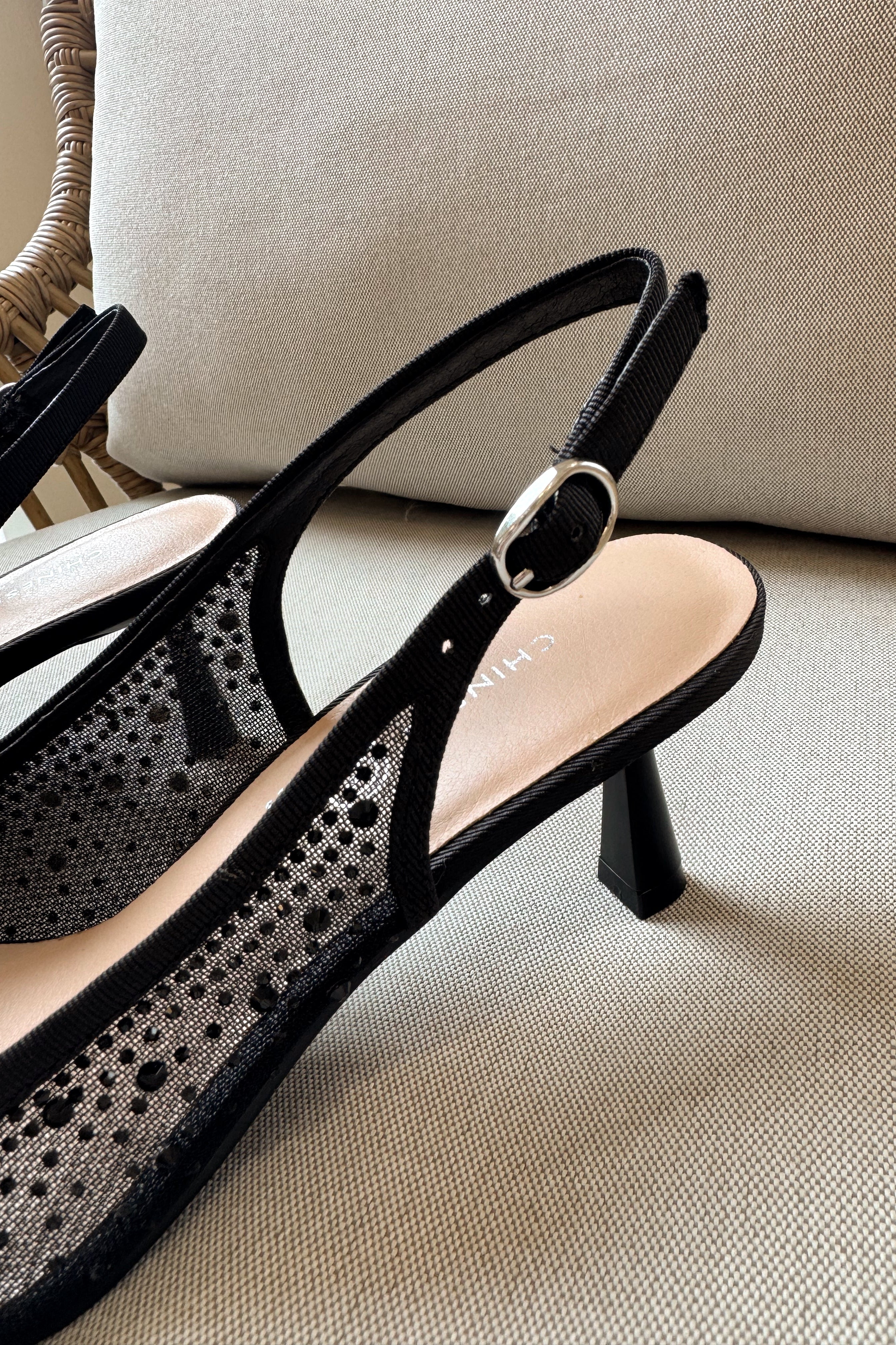 Turn heads with the Chinese Laundry Merry Mesh Slingback Pump, a sophisticated statement piece that blends modern edge with timeless elegance. Crafted with a black mesh upper adorned with sleek black stud detailing, this pump brings a touch of attitude to any outfit. The adjustable slingback strap with buckle closure ensures a secure, comfortable fit, while the pointed toe and 2½-inch heel create a flattering, feminine silhouette.