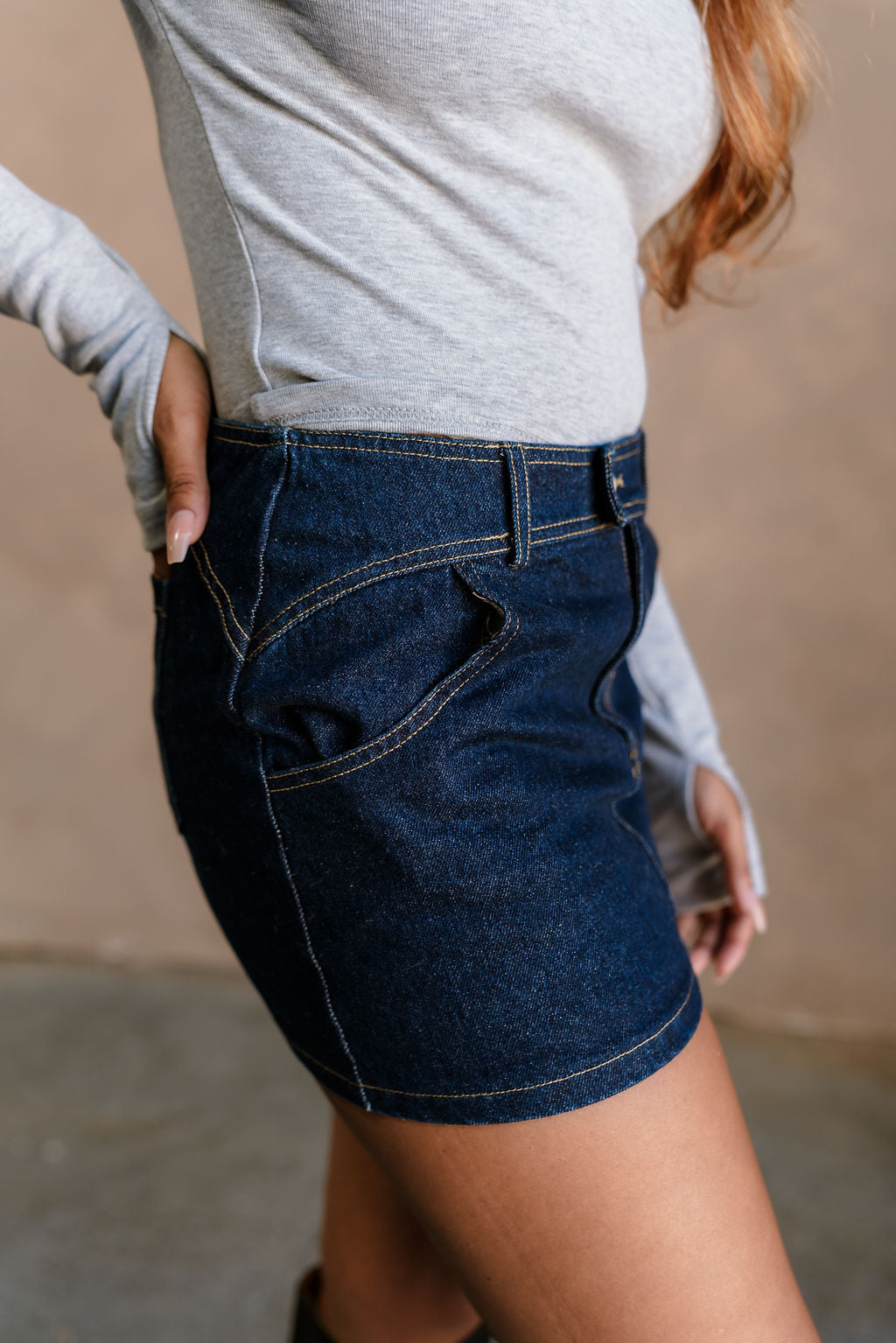 The Colbie Dark Wash Denim Mini Skirt is a classic wardrobe staple with a modern, flattering fit. Crafted from dark wash denim fabric, this mini-length skirt offers a clean, timeless look that pairs effortlessly with everything from sweaters to graphic tees. The structured silhouette is complemented by practical front and back pockets, along with belt loops that let you accessorize and style it your way.