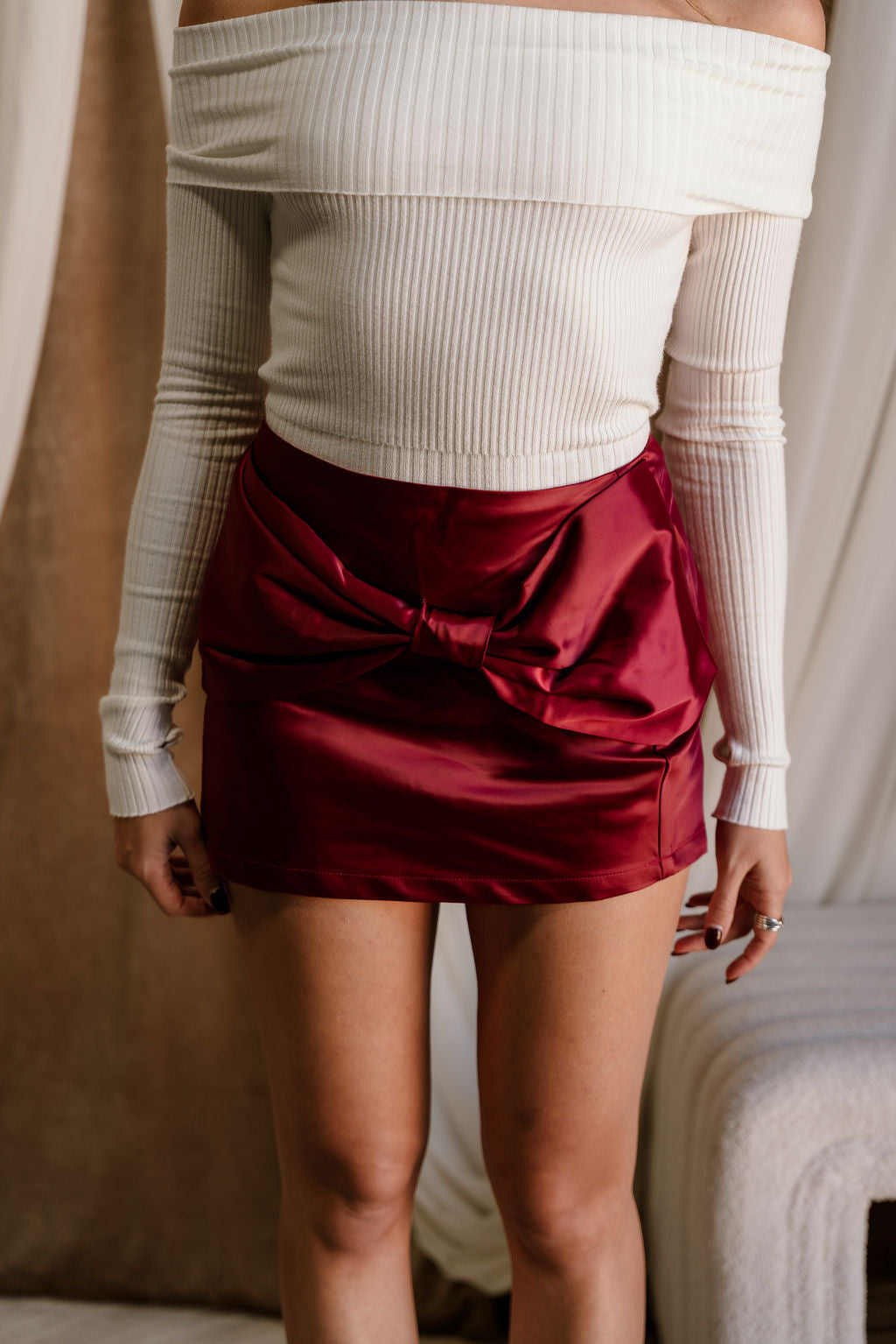 Turn up the charm with the Cora Burgundy Satin Bow Mini Skirt—a flirty, polished piece designed to make every outfit feel special. Crafted from rich burgundy satin fabric, this mini skirt offers a smooth, lustrous finish that catches the light beautifully. The coordinating burgundy lining ensures a comfortable, seamless fit, while the statement upper bow detail adds a playful yet refined touch. Complete with a discreet side zipper closure for easy wear, this skirt pairs effortlessly with fitted tops, cozy knits, or elegant blouses. Whether you're dressing for a holiday event, date night, or a night out, the Cora Mini Skirt brings a perfect blend of sophistication and fun.