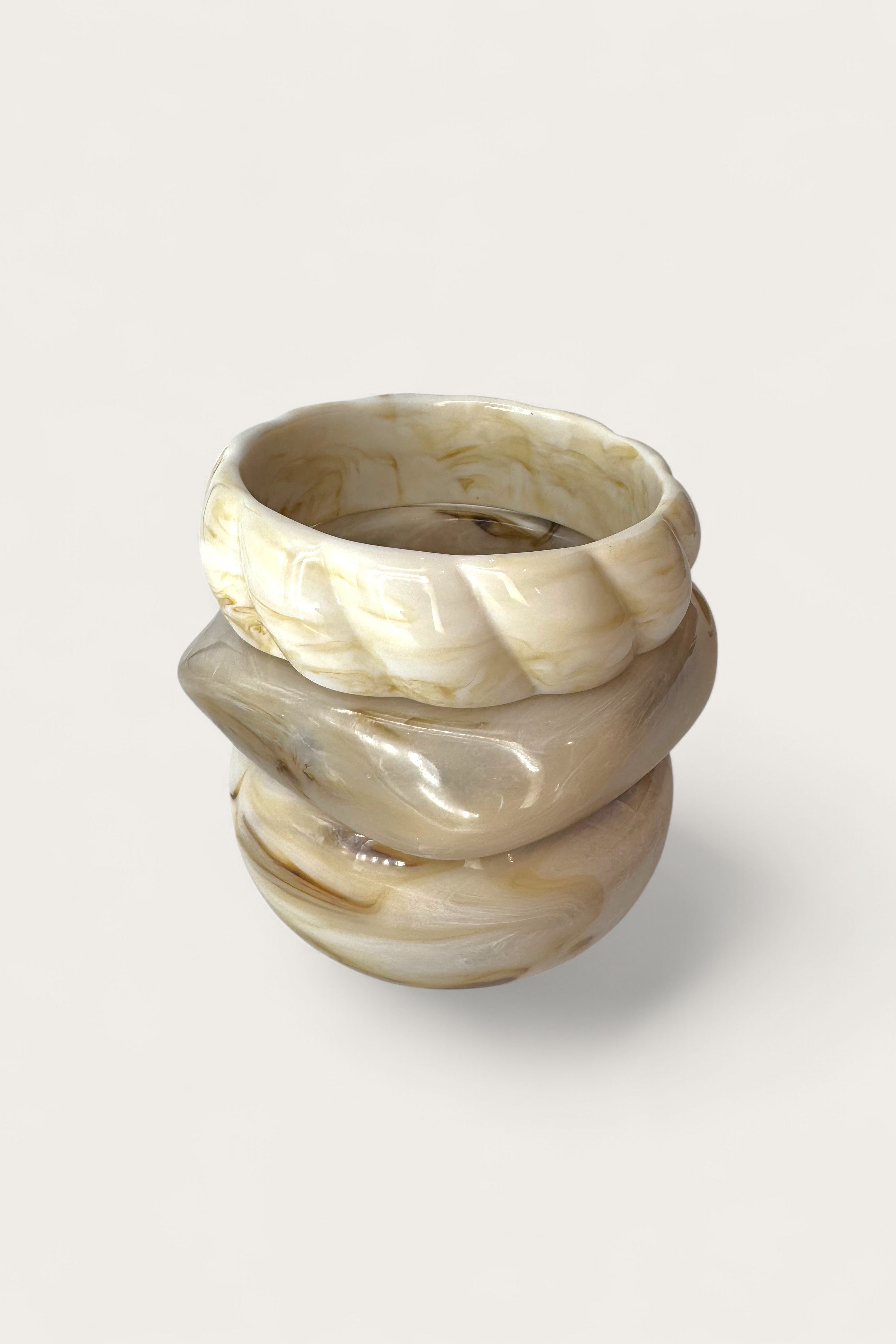 Elegant and versatile, the Cora Natural Marble Bangle Set adds timeless sophistication to any look. This set includes three beige marbled bangles—a thick bangle, a squared bangle, and a roped bangle—each offering unique texture and dimension. Perfect for stacking or wearing individually, Cora brings effortless style and a natural, polished finish to your jewelry collection.