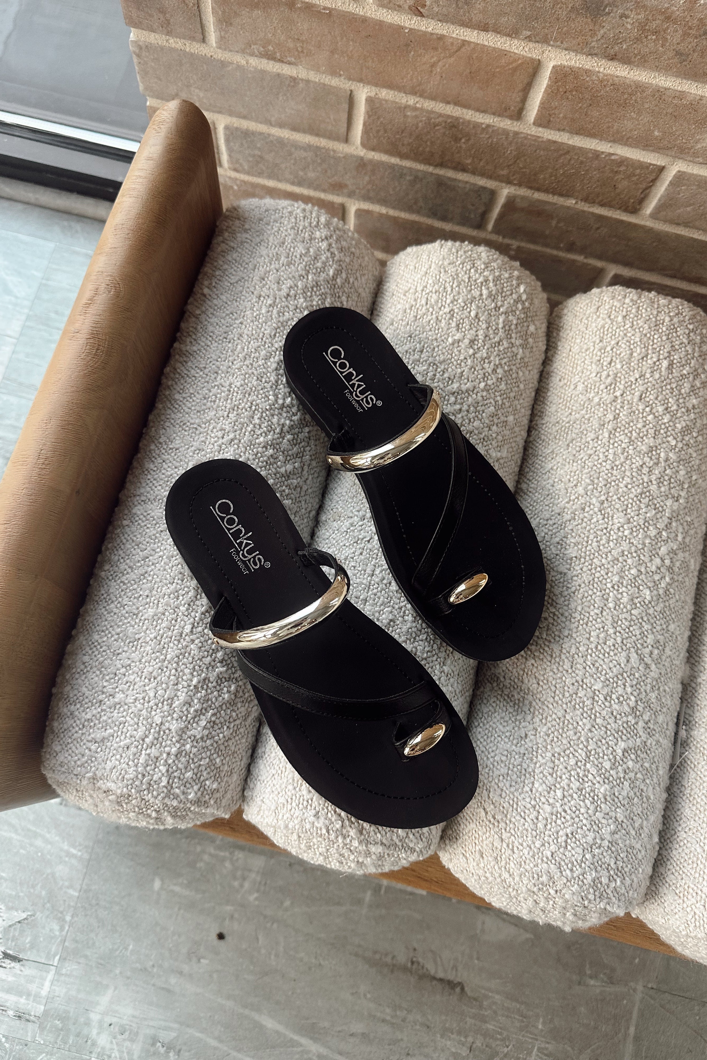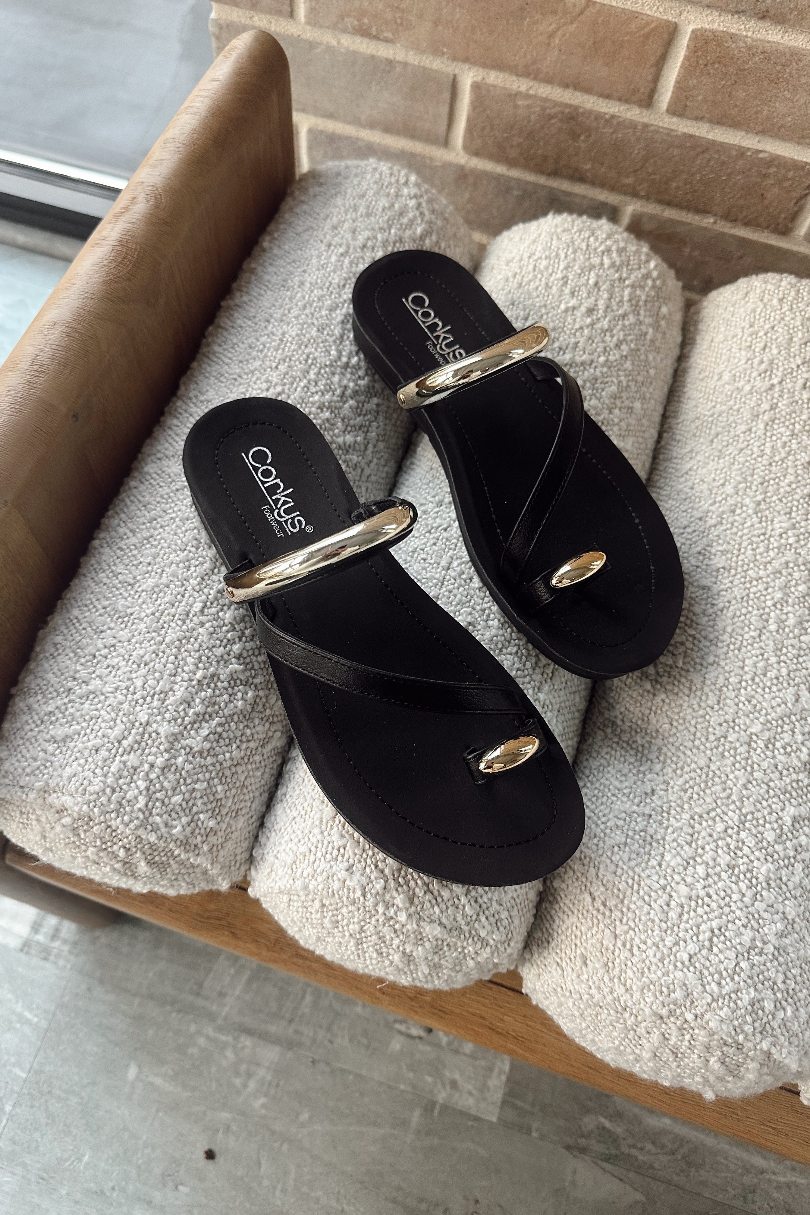 Make a bold statement with the Corkys Hit The Strip Black Sandal, a sleek and edgy take on everyday warm-weather style. Designed with smooth black faux leather straps. This slide-on sandal has an eye-catching silver metal toe ring and cuff details for a modern, fashion forward finish.