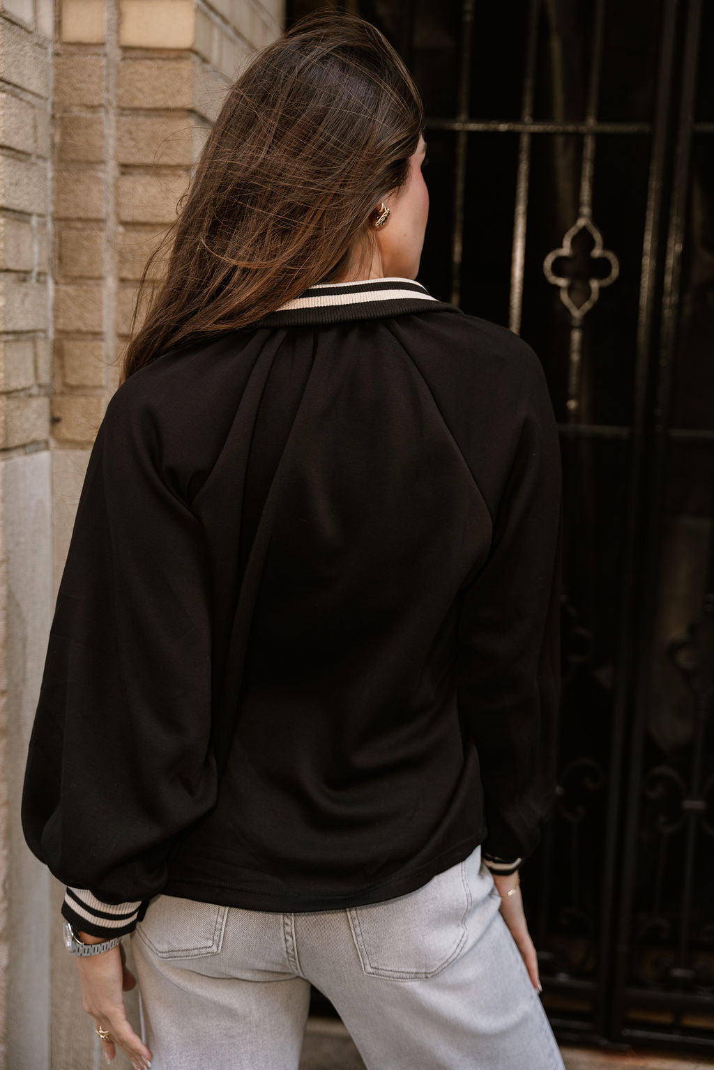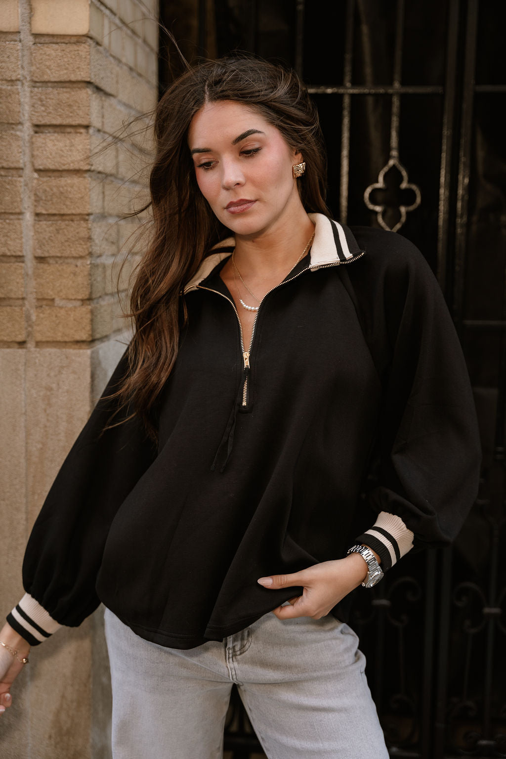 Secondly, one of its signature details is the black and cream striped ribbed hem. Which adds just the right amount of contrast and structure to balance the minimalist design. Long sleeves make it a versatile choice for cooler days, whether you're layering it under a jacket or wearing it solo. The Black Quarter Zip-Up Top moves easily from casual to more dressed up settings with ease.