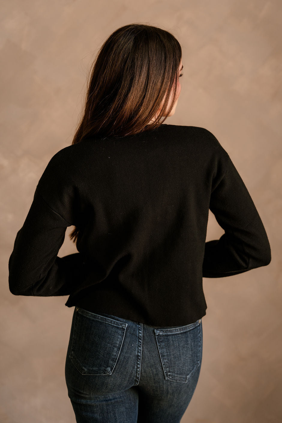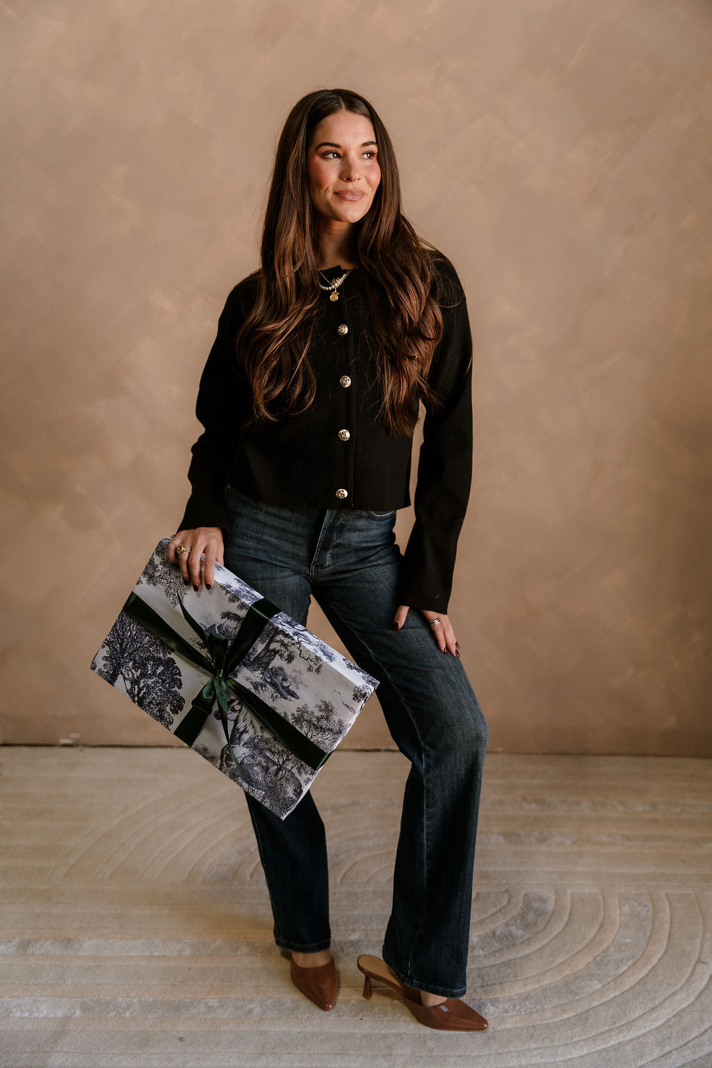 The Delaney Black & Gold Button-Up Pocket Cardigan is a polished staple made from black ribbed knit fabric that feels soft, structured, and perfect for everyday styling. The classic round neckline and long sleeves create a timeless silhouette, making it an easy layer to dress up or down throughout the season. Its comfortable fit and textured knit make it a versatile piece you’ll reach for again and again.