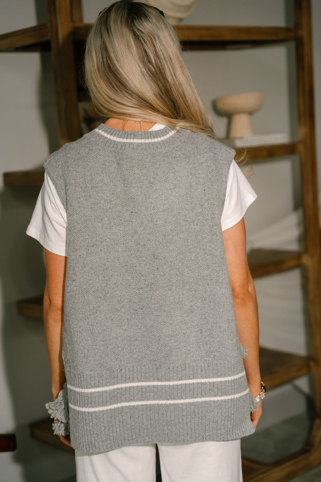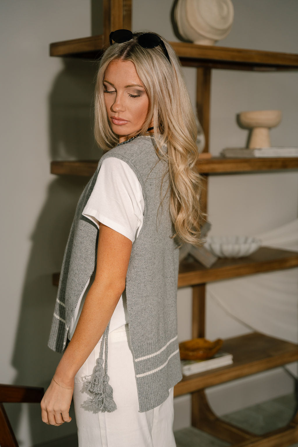 Cozy with a playful twist, the Delaney Grey & Cream Tassels Knit Vest brings texture and charm to your layered looks. Crafted from soft grey knit fabric with cream stripe details, this vest features open sides finished with side ties and tassels for a relaxed, boho-inspired feel. The round neckline and ribbed trim add a polished touch while keeping the silhouette effortlessly wearable.