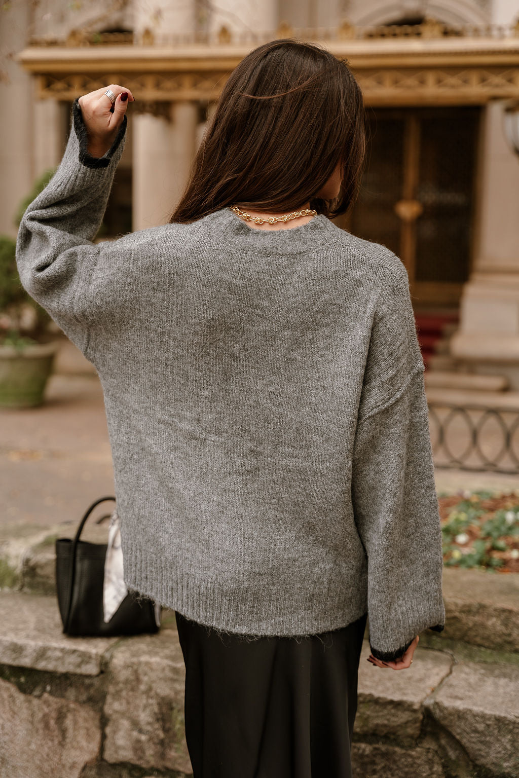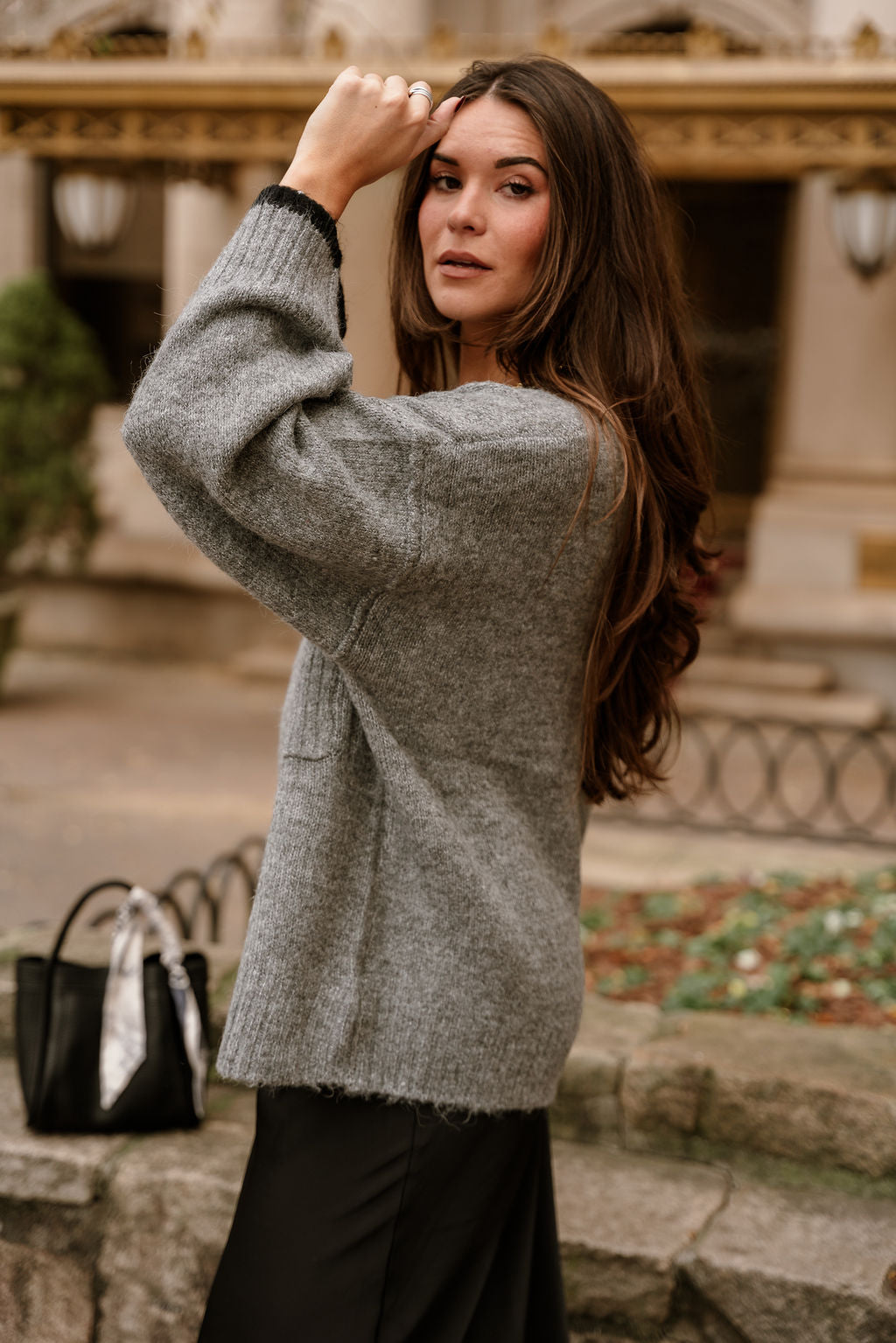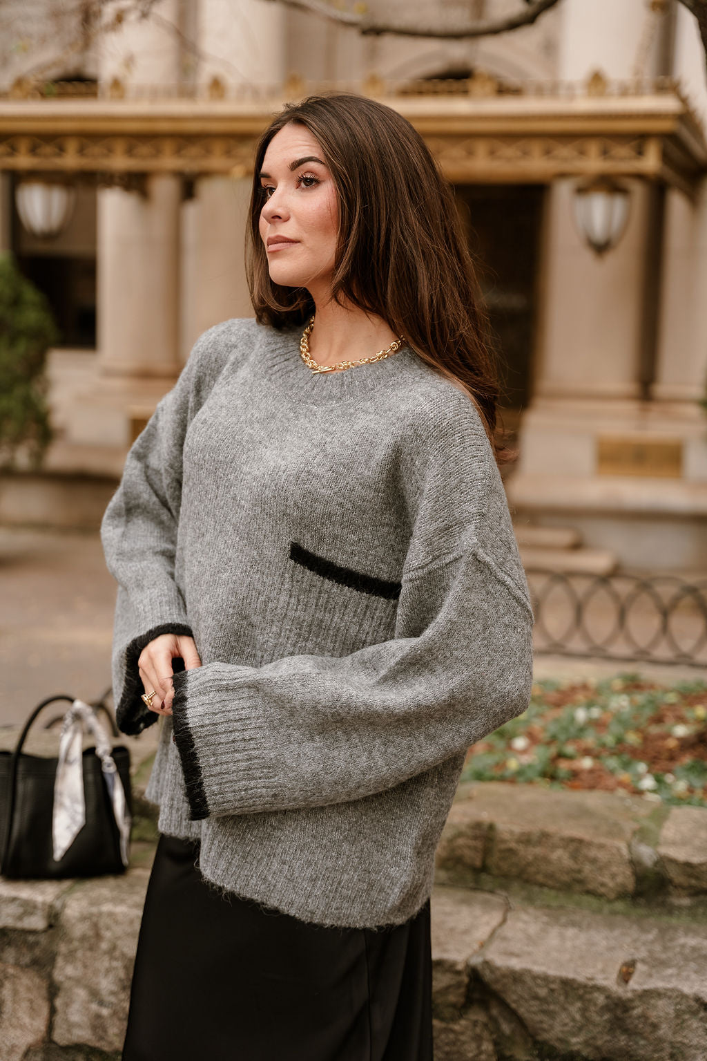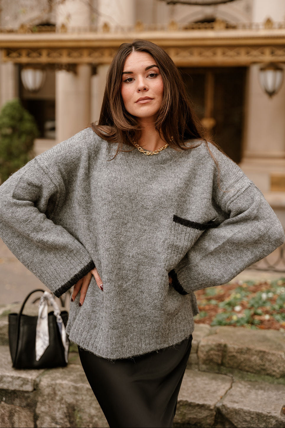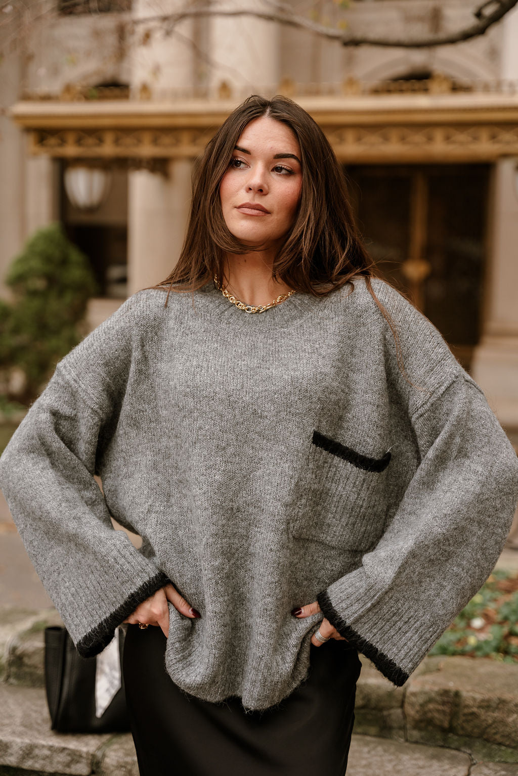 Bring effortless style and everyday comfort to your wardrobe with the Destiny Grey & Black Pocket Sweater. Crafted from soft grey knit fabric, this cozy layer delivers a relaxed, modern feel perfect for transitional seasons and laid-back days. Bold black trim adds crisp contrast, giving the sweater a clean, elevated finish.