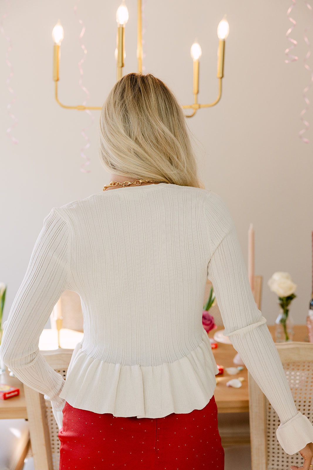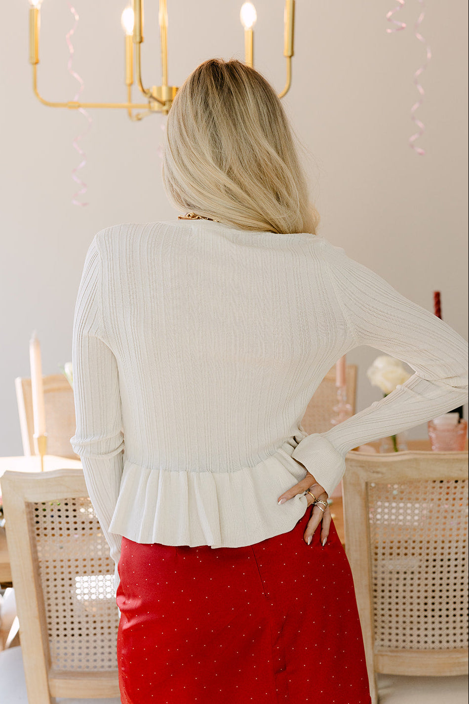 Soft, feminine, and effortlessly flattering, the Destiny Ivory Ribbed Peplum Top is a modern essential with romantic detailing. Crafted from ivory ribbed knit fabric, this top offers a comfortable, form-fitting feel that enhances the body while it allows easy movement.