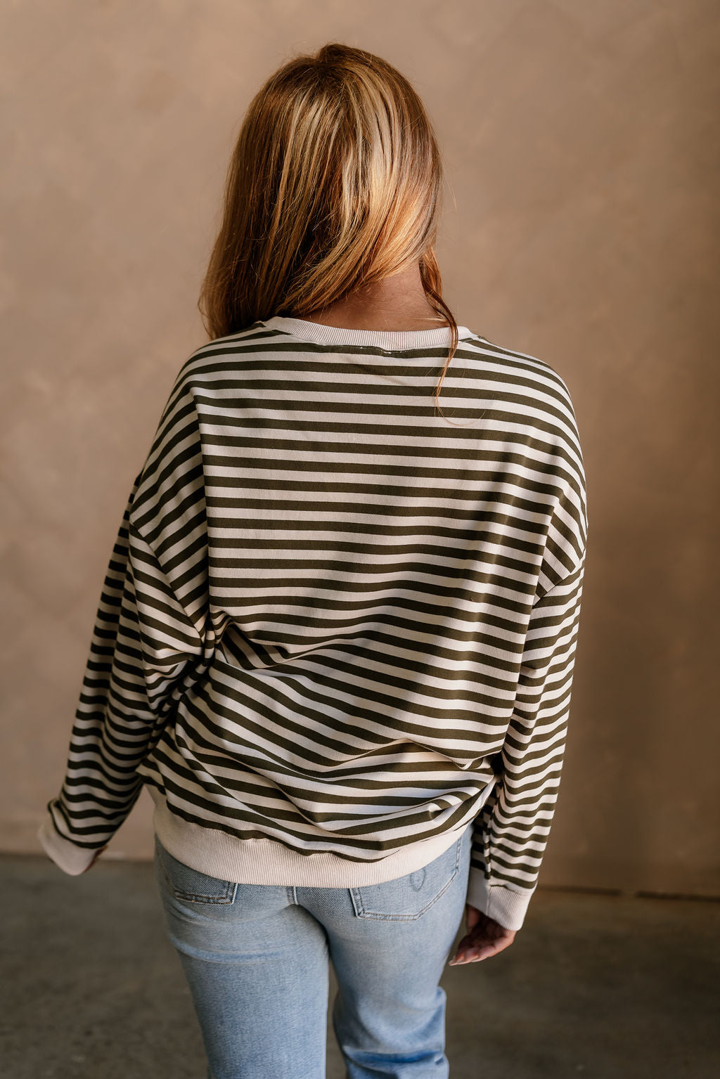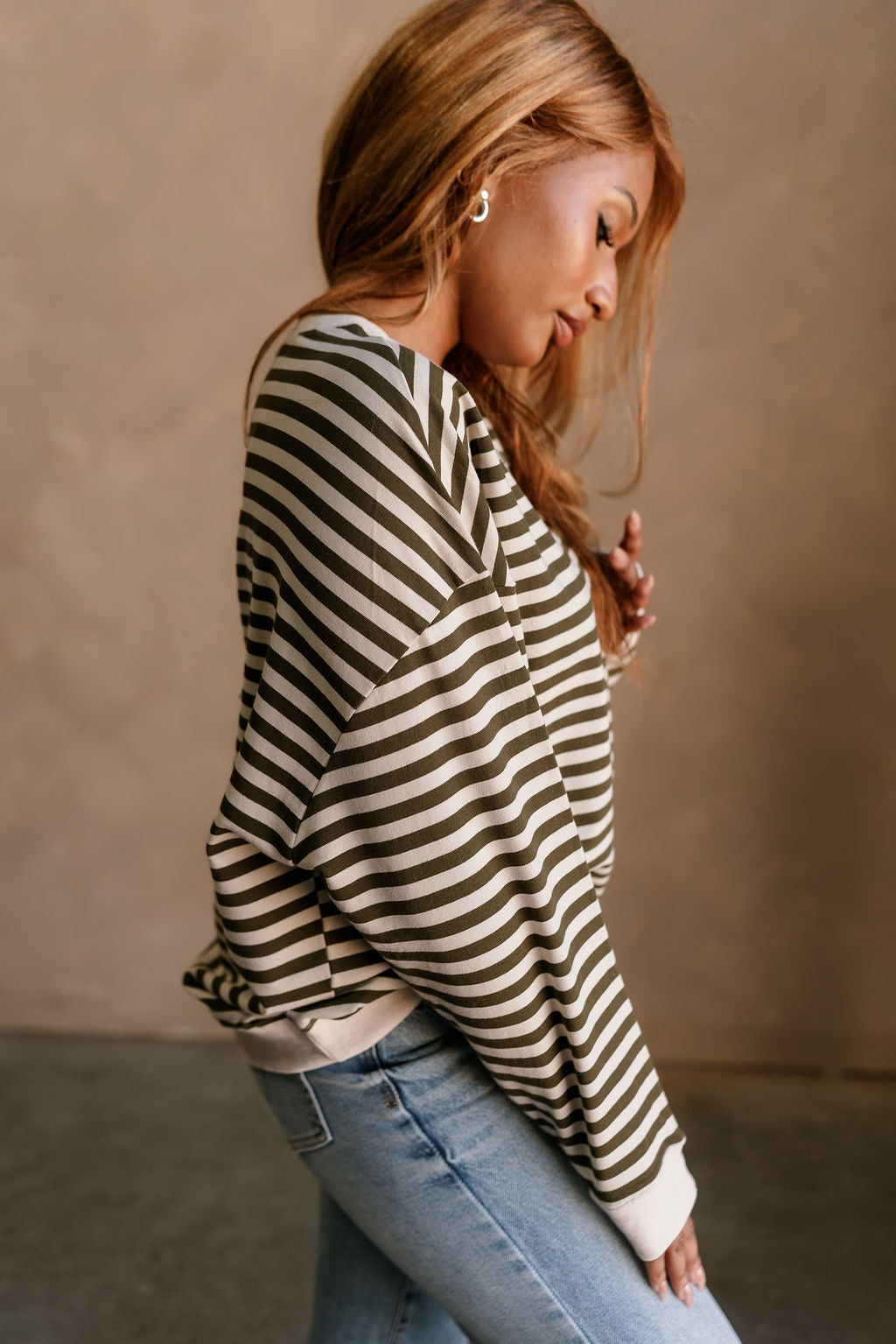 Embrace casual comfort with the Diana Olive & Ivory Stripe Sweatshirt — a lightweight, versatile layer designed for effortless style. Crafted from soft olive and cream fabric, the subtle stripe print adds a fresh, relaxed vibe to your everyday wardrobe.