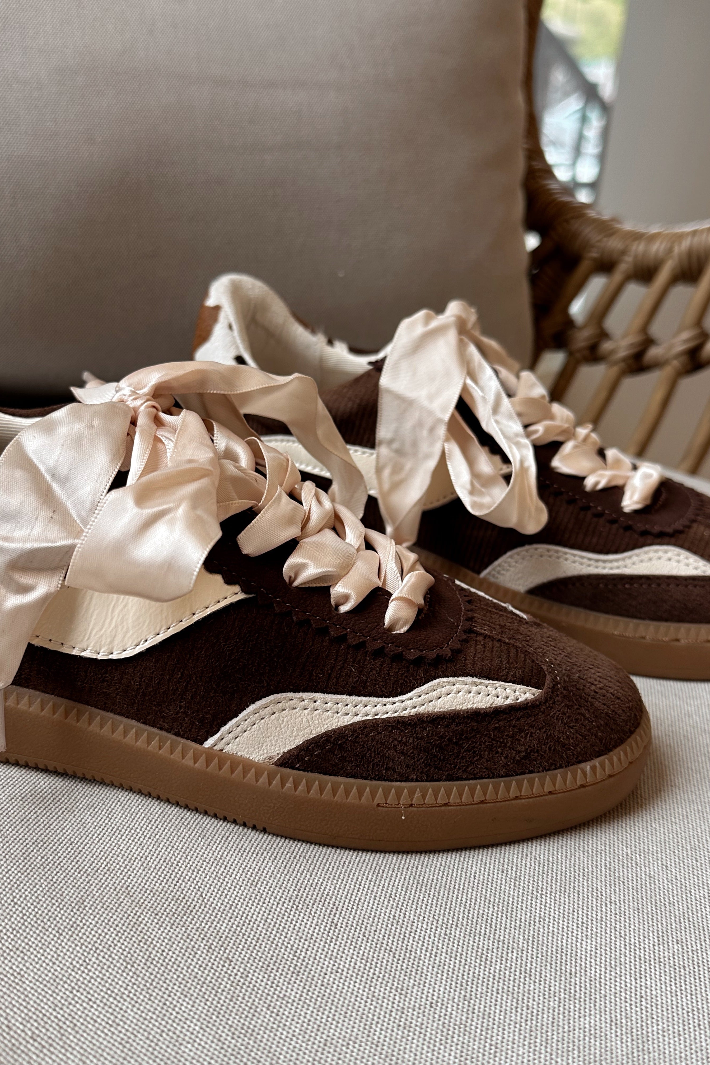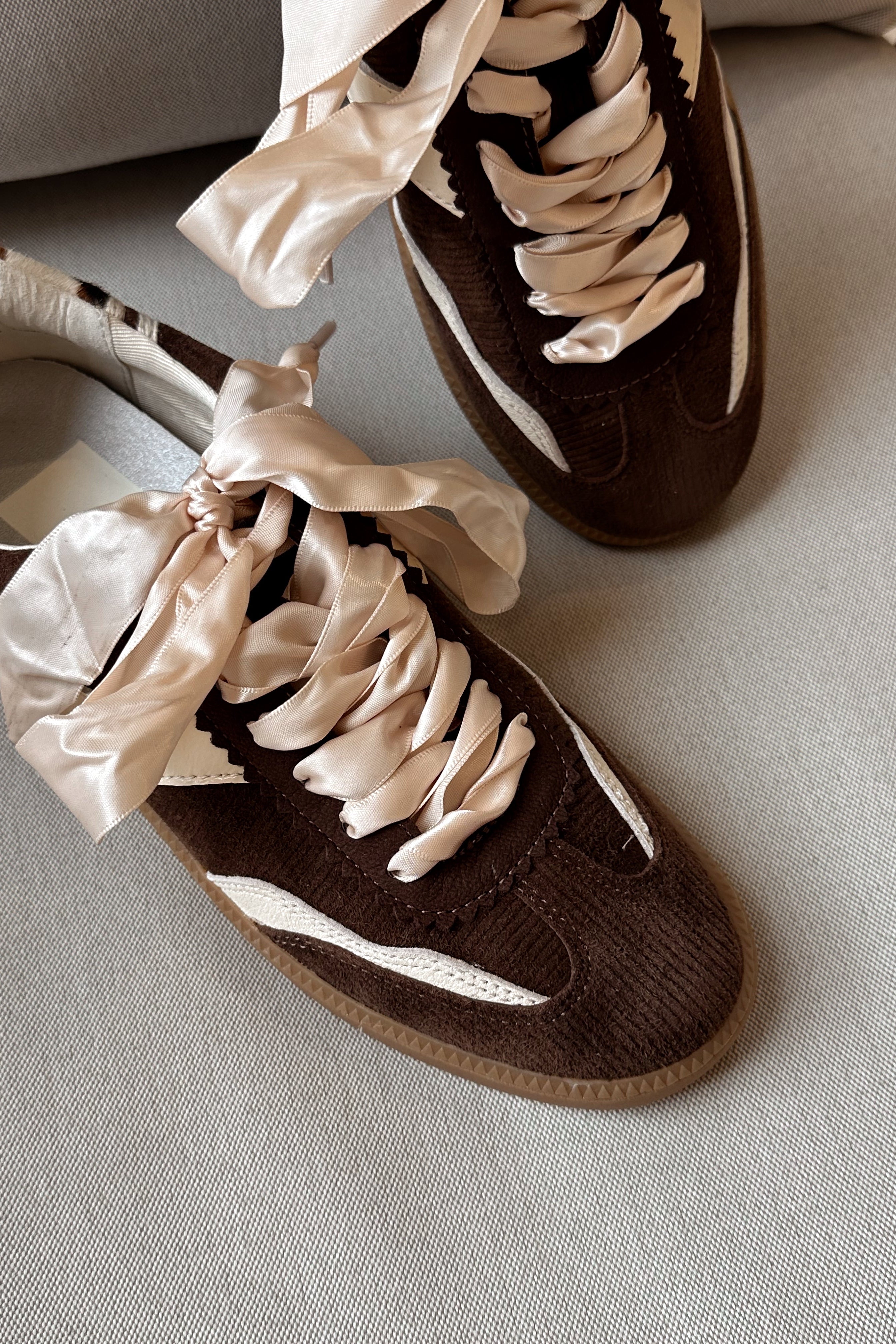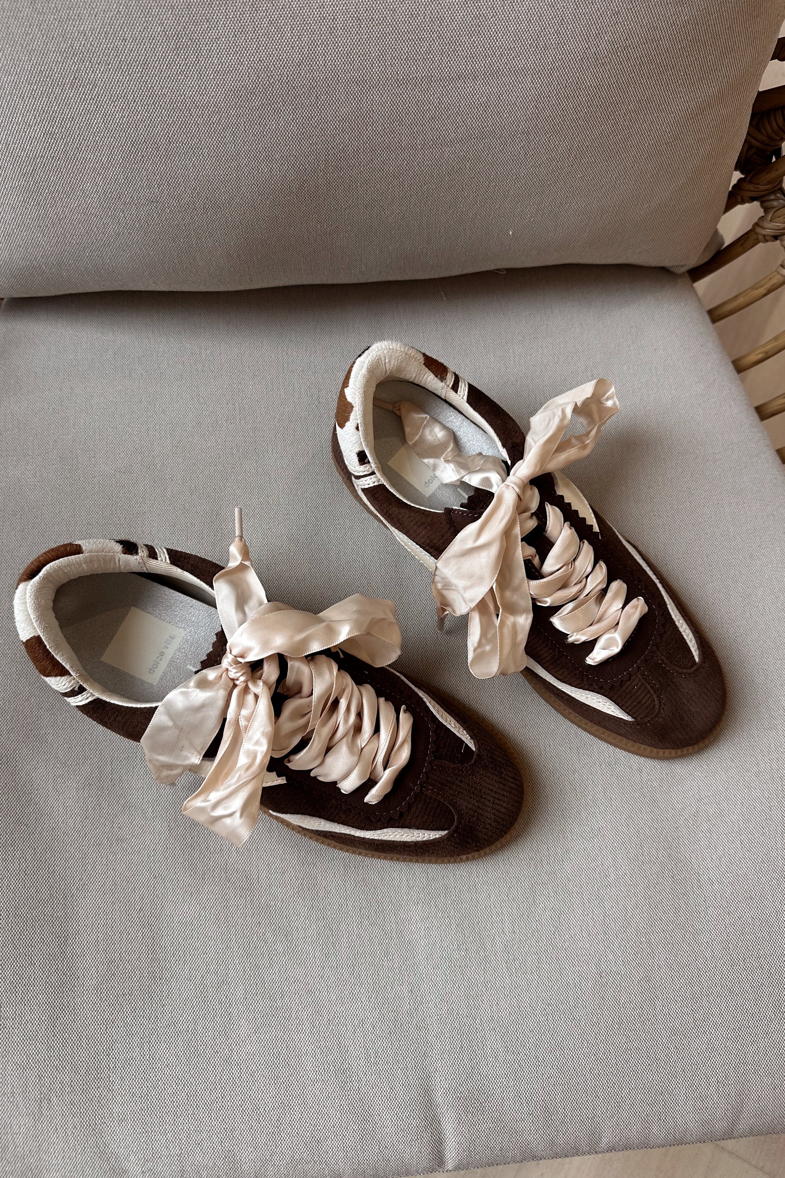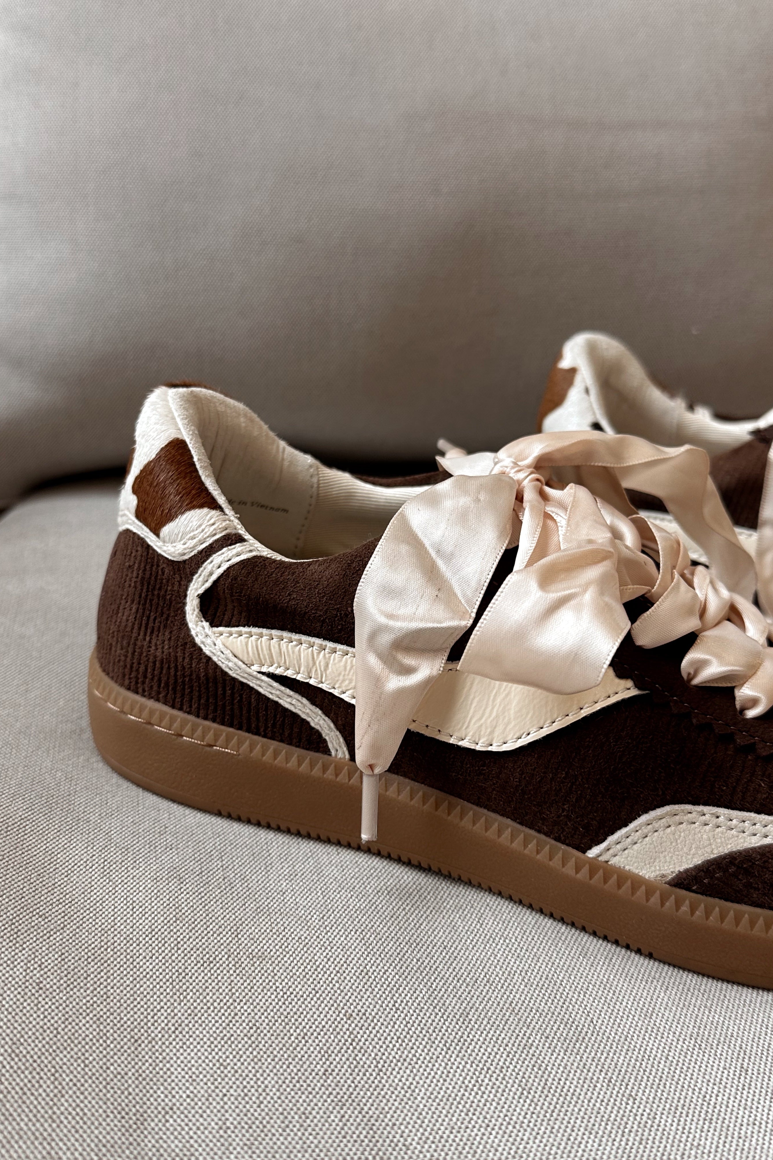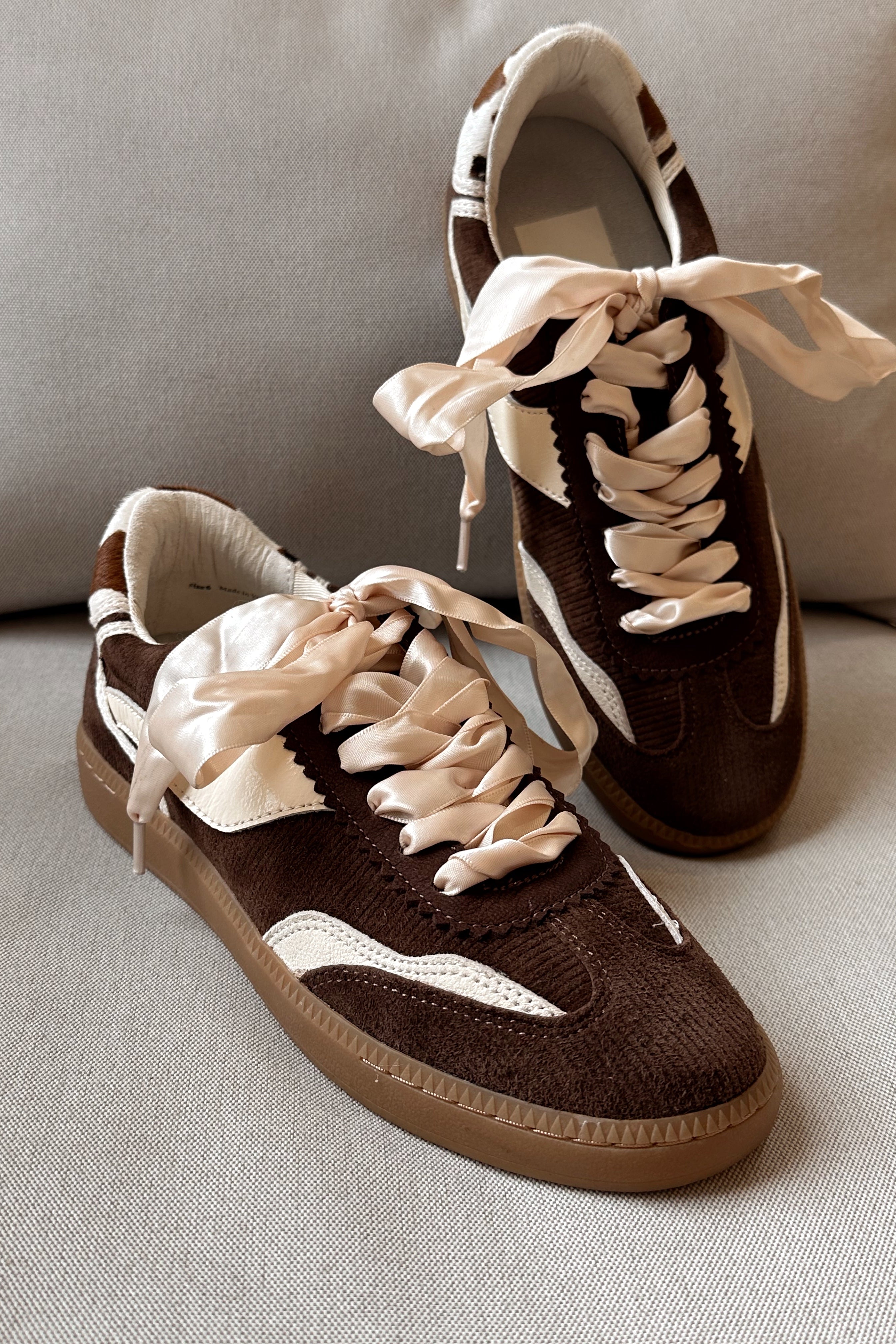 A fresh take on casual cool, the Dolce Vita Notice Sneaker blends texture and detail for everyday style. Designed in rich chocolate brown corduroy with cream leather accents, this sneaker features a unique cowhide heel tab and luxe satin laces for a touch of contrast. A classic round toe and gum rubber sole keep the look grounded while ensuring all-day comfort. Effortlessly versatile, it’s the pair you’ll reach for to elevate laid-back outfits.