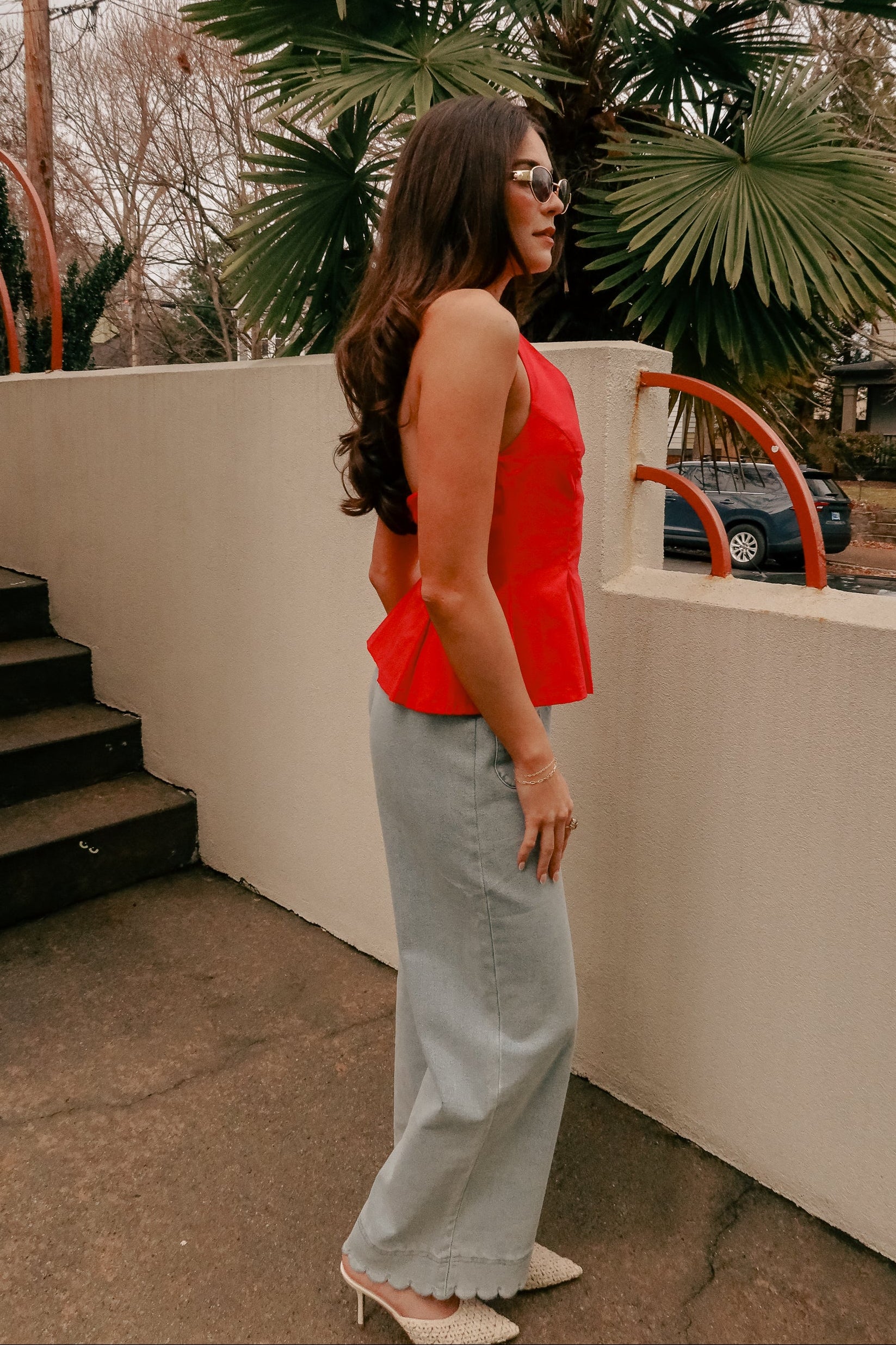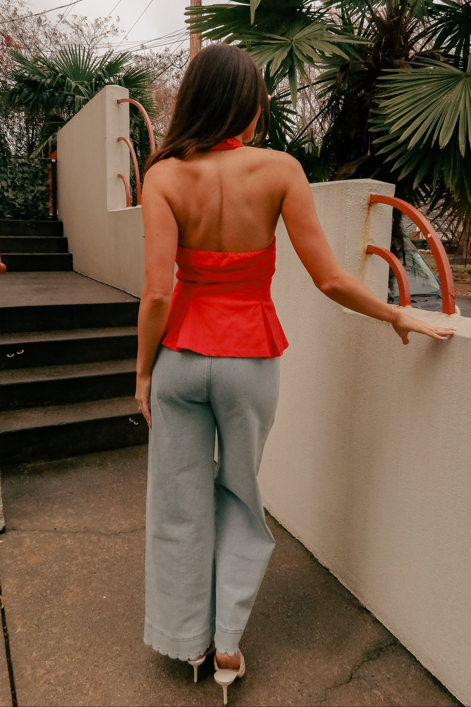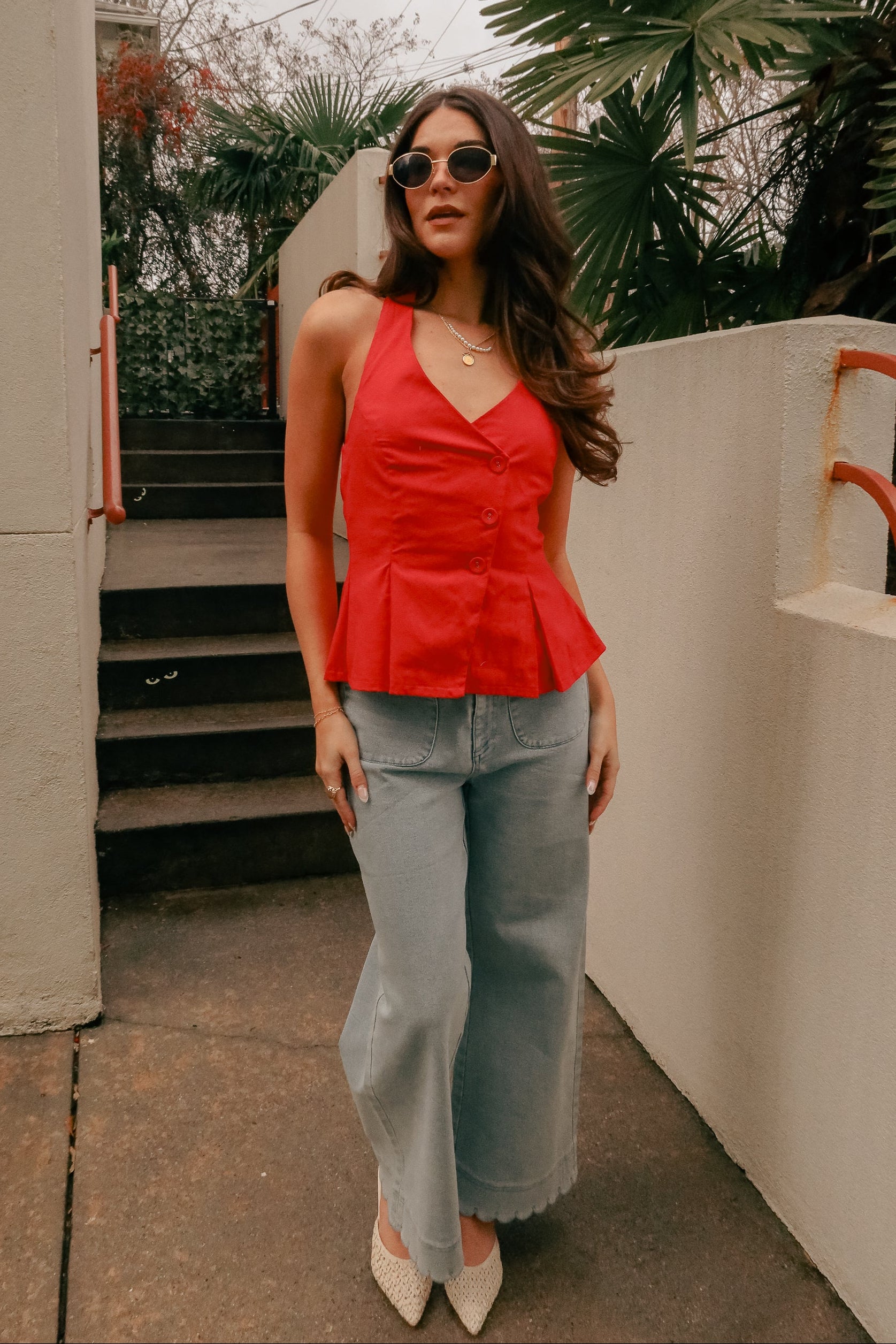Bold, breezy, and effortlessly striking — the Elani Red Flare Halter Tank is your statement piece of the season. Crafted from lightweight red linen with a matching red lining, this tank delivers breathable comfort with a vibrant monochrome finish.