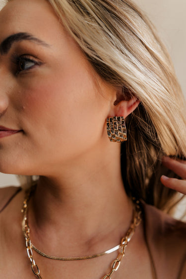 The woven texture adds a touch of dimension and visual interest to the sleek rectangular design, creating a unique and eye-catching aesthetic. Whether worn with a casual daytime ensemble or paired with a sleek evening outfit, the Eliana Gold Woven Stud Earrings are sure to make a statement with their versatile and stylish design.