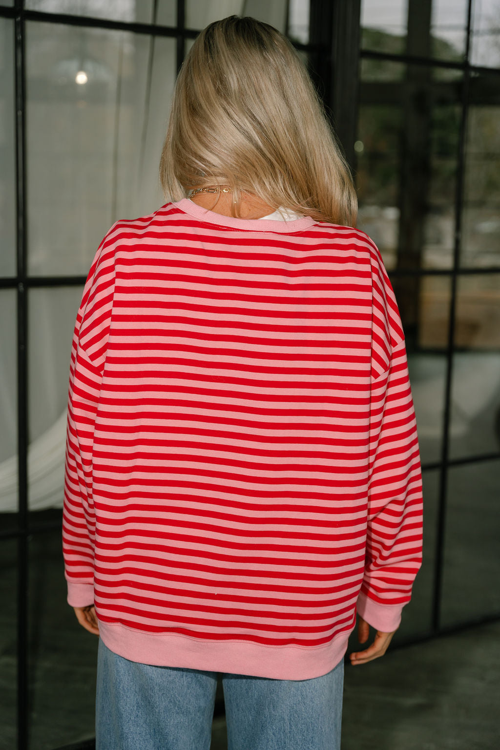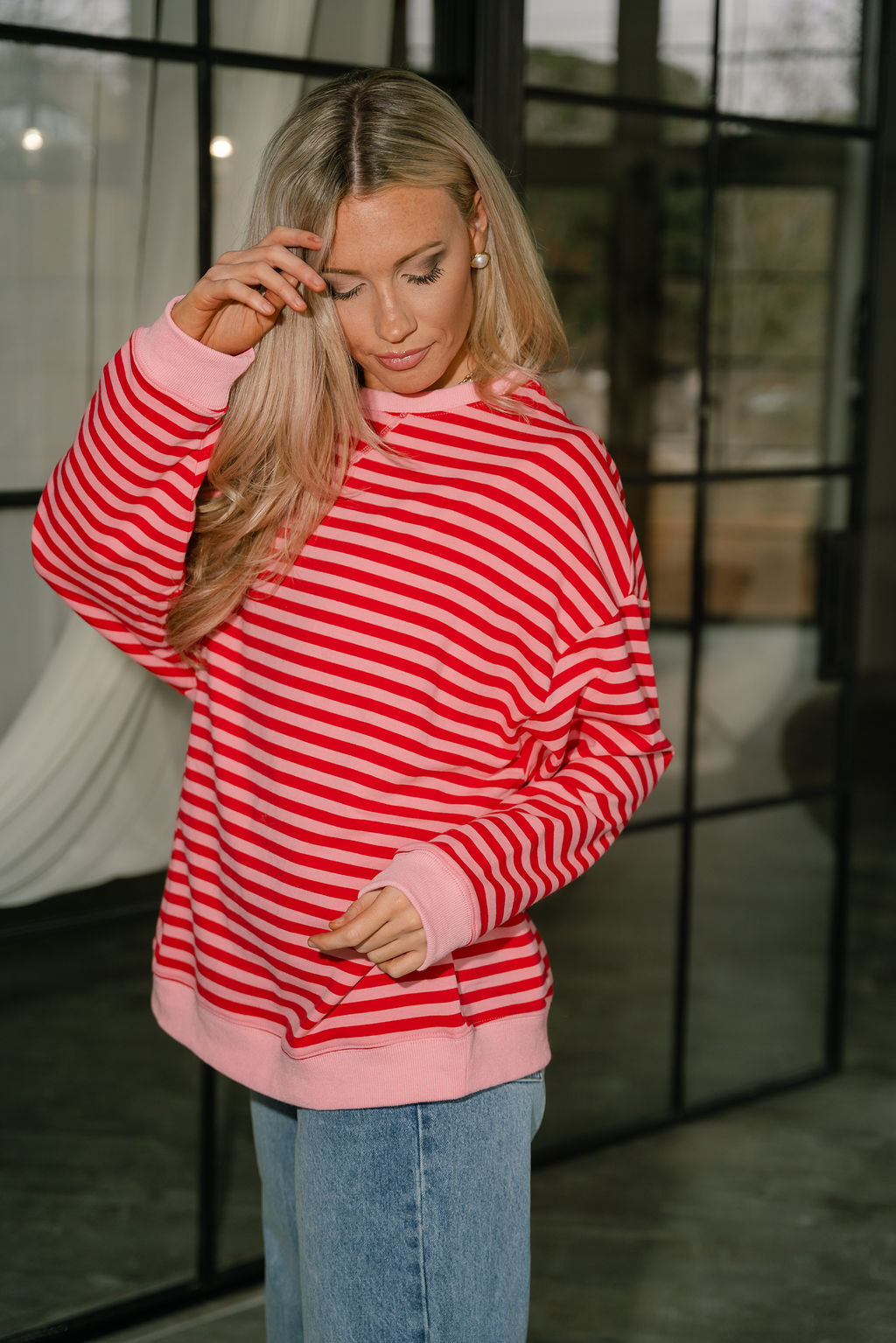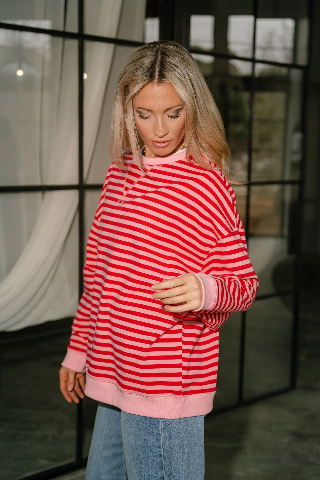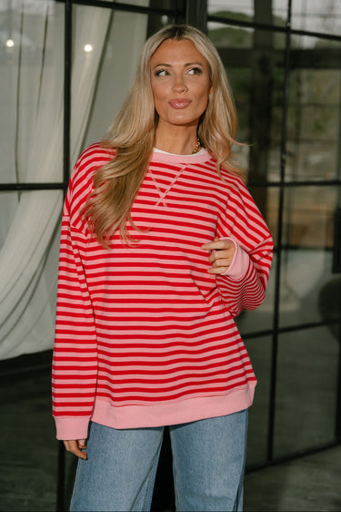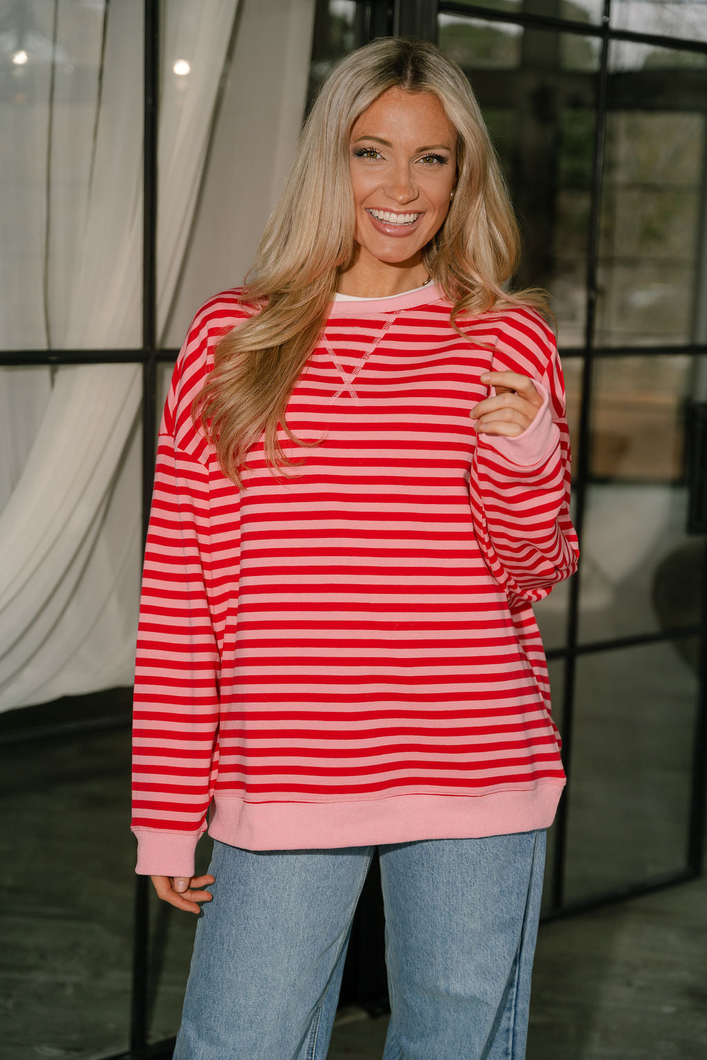 Cozy with a bold pop of color, the Elle Pink & Red Stripe Pullover is an effortless statement piece for everyday wear. Featuring a playful pink and red stripe print, this pullover is designed with a classic round neckline, dropped shoulders, and long sleeves for a relaxed, comfortable fit. A ribbed hem adds subtle structure and polish.