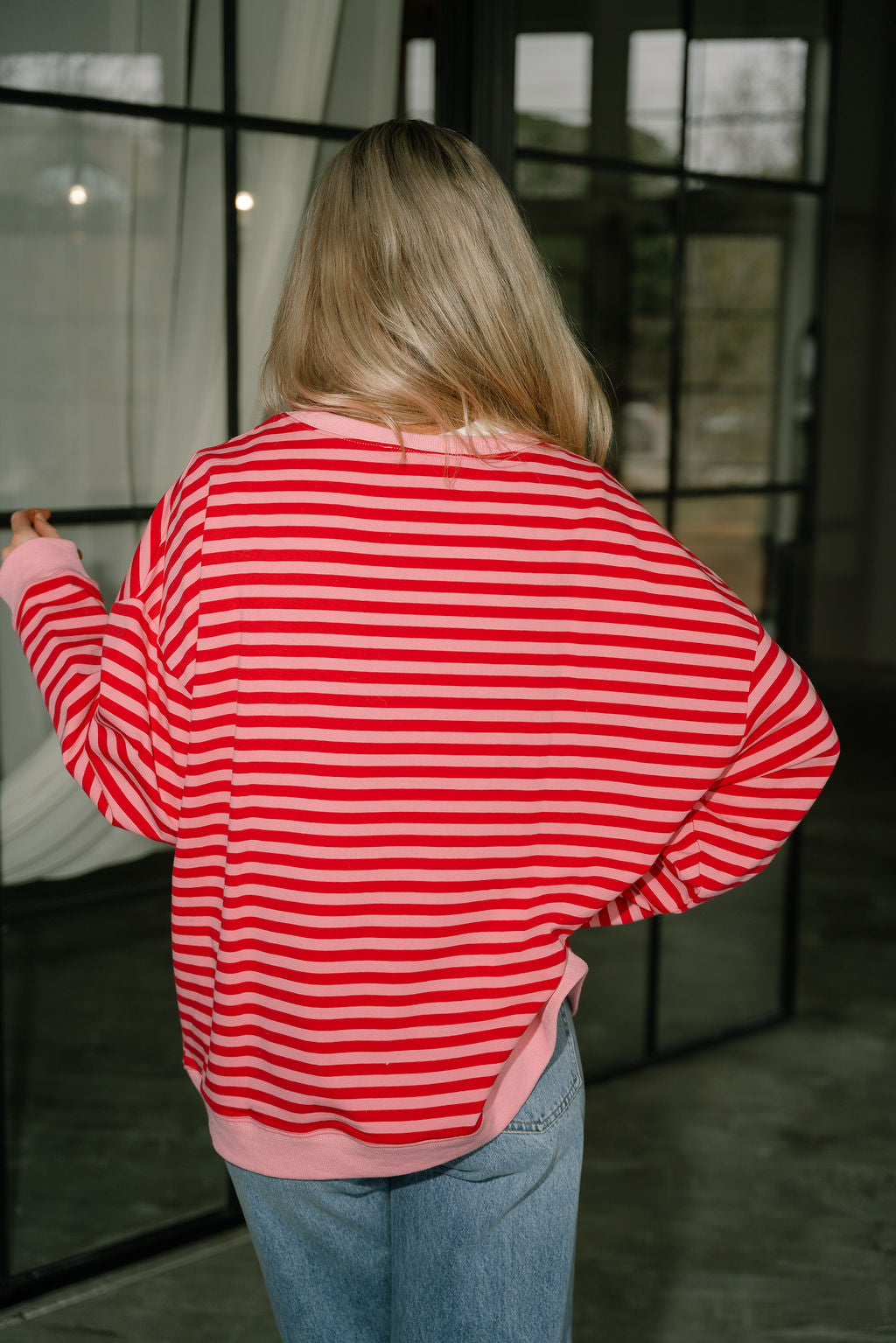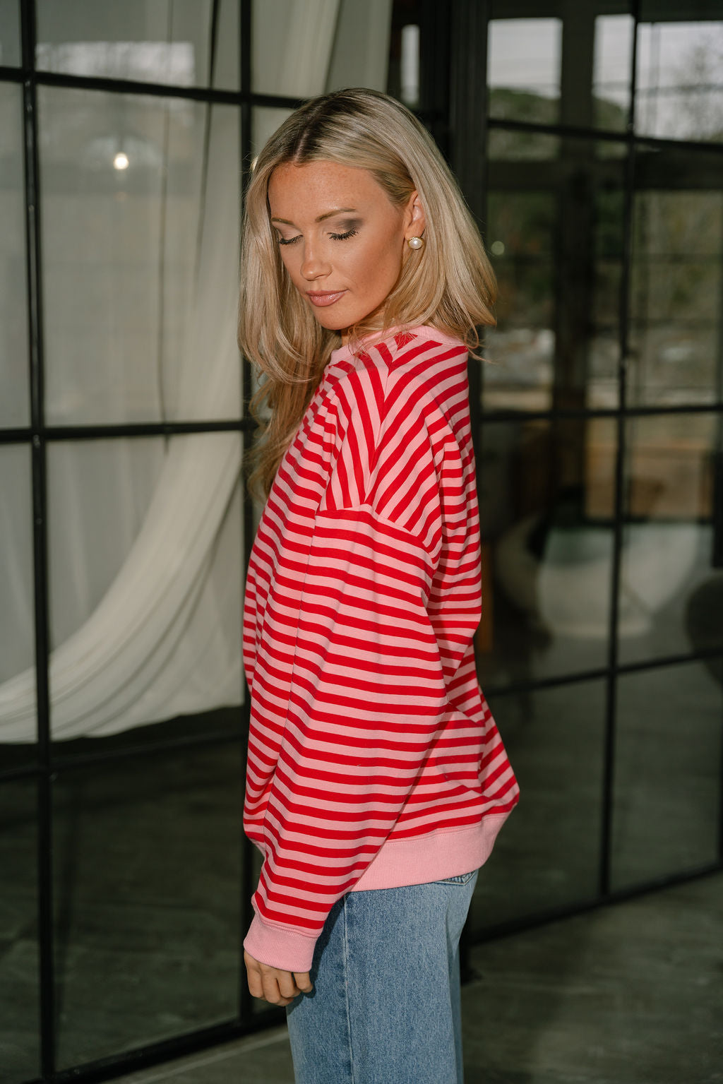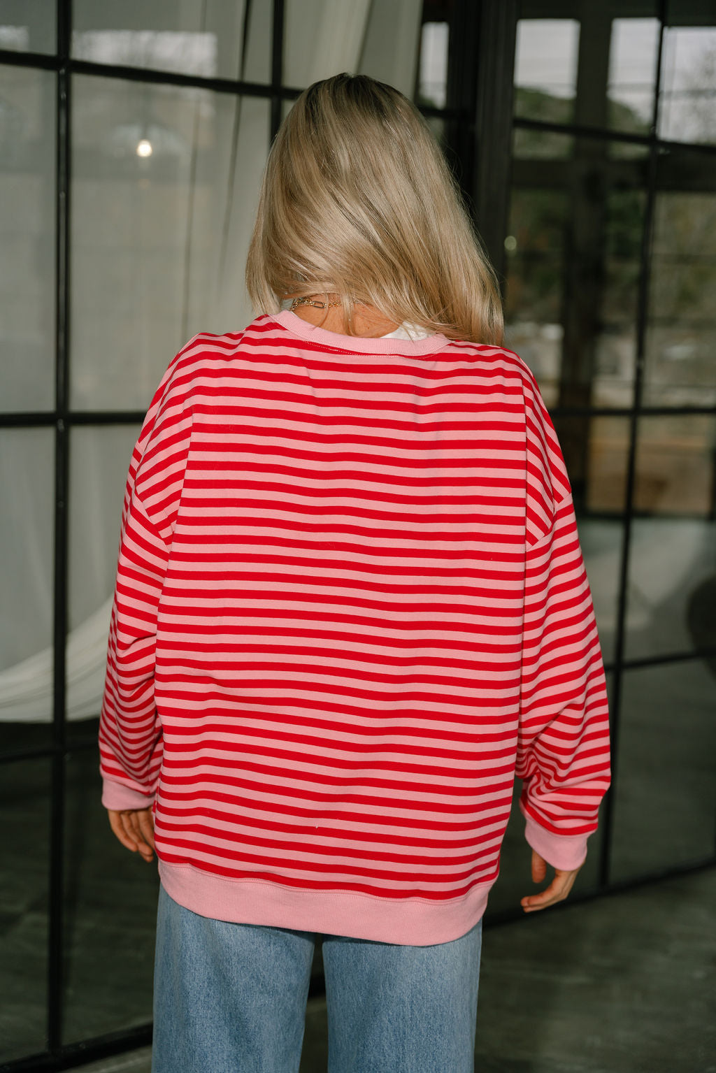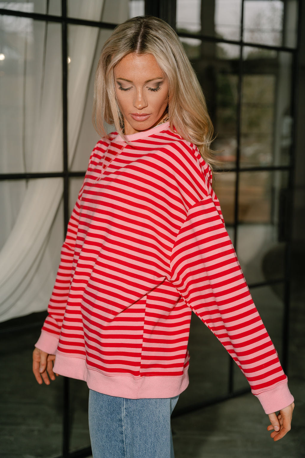 Cozy with a bold pop of color, the Elle Pink & Red Stripe Pullover is an effortless statement piece for everyday wear. Featuring a playful pink and red stripe print, this pullover is designed with a classic round neckline, dropped shoulders, and long sleeves for a relaxed, comfortable fit. A ribbed hem adds subtle structure and polish.