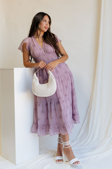 Whether you're wandering through sunlit gardens or sipping champagne under the stars, the Ellie Dusty Purple Floral Midi Dress promises to enchant with its timeless charm and effortless grace.