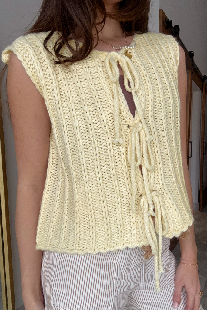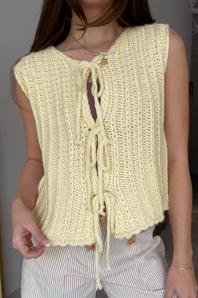 Brighten up your wardrobe with the Ellie Pale Yellow Front Tie Knit Tank — the perfect blend of sweet and stylish. Crafted from soft pale yellow cable knit fabric, this tank adds subtle texture and charm to any outfit. The delicate front tie details create a flattering, feminine touch, while the classic round neckline keeps the look timeless and easy to style. Designed with a sleeveless silhouette, it’s perfect for warm days or effortless layering.