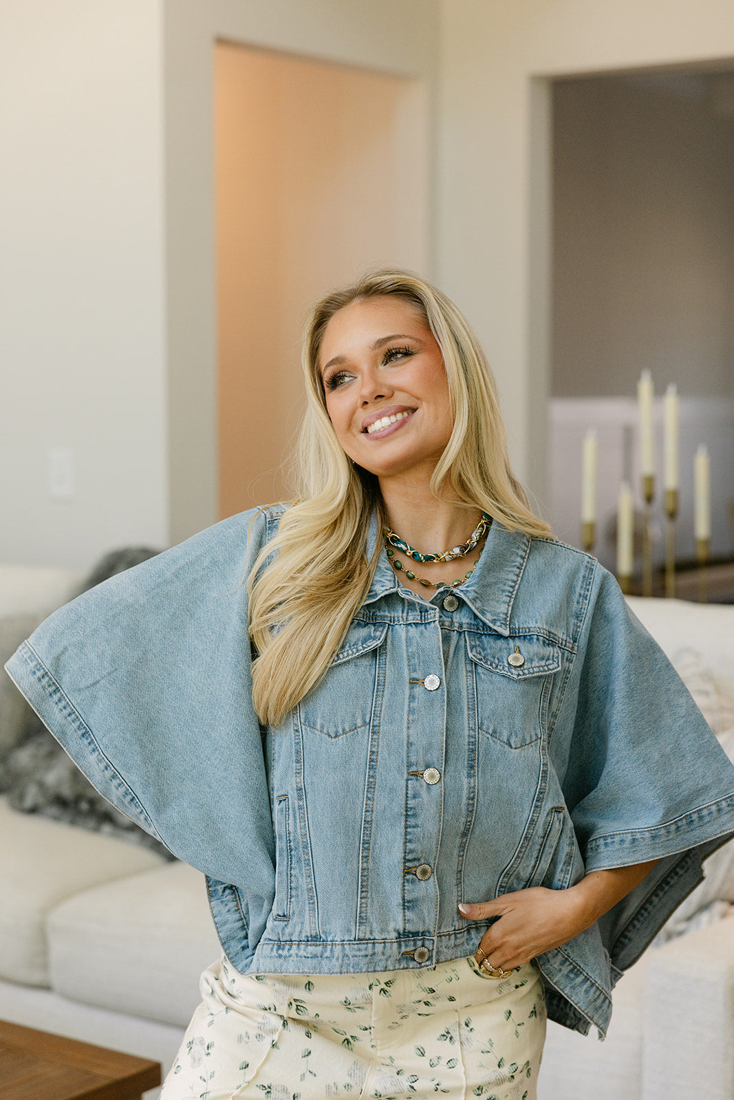 Designed with side button closures, the Elodie Cape Jacket offers subtle detail and a tailored finish, perfect for layering over dresses, tops, or lightweight sweaters. Its cape-inspired silhouette brings effortless movement and dimension, making it a standout piece for transitional seasons or casual-chic looks.