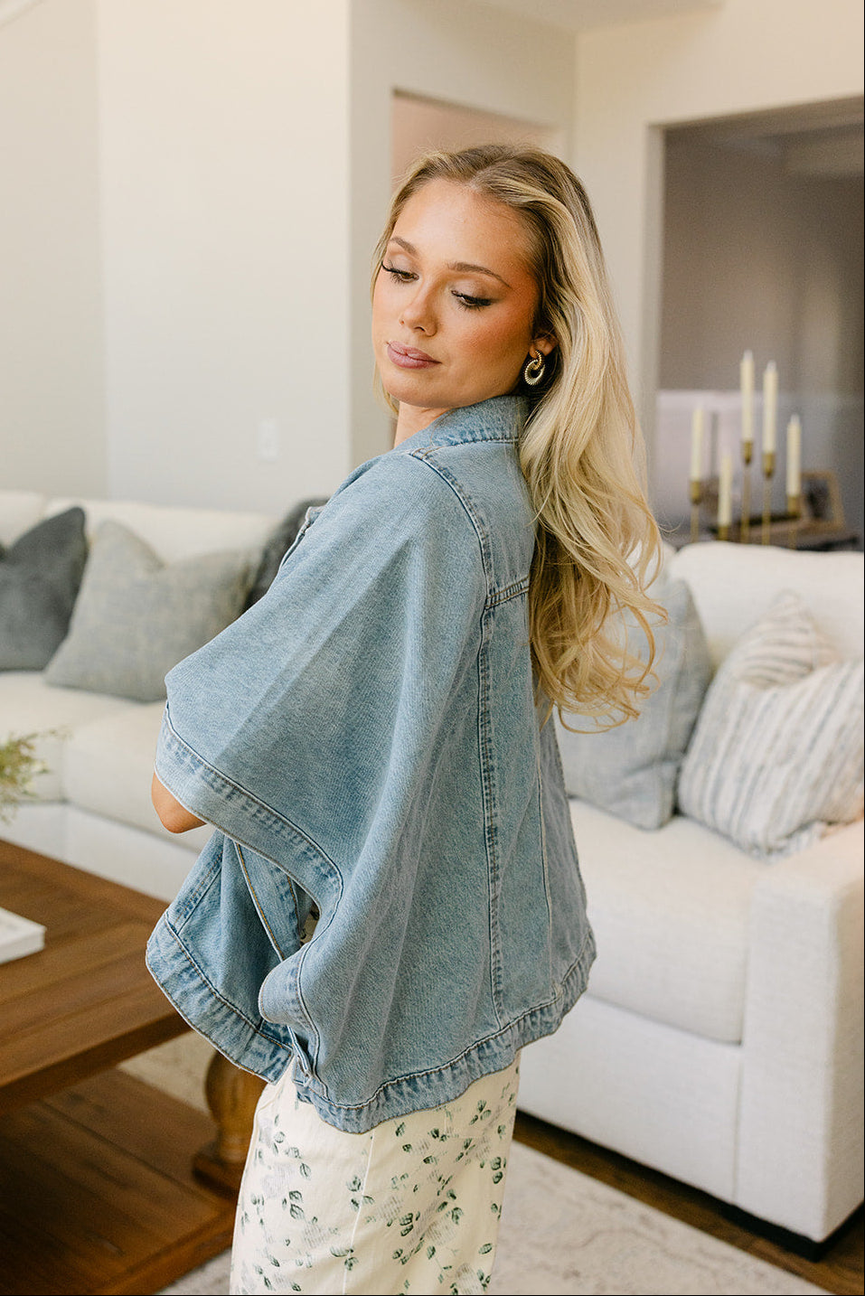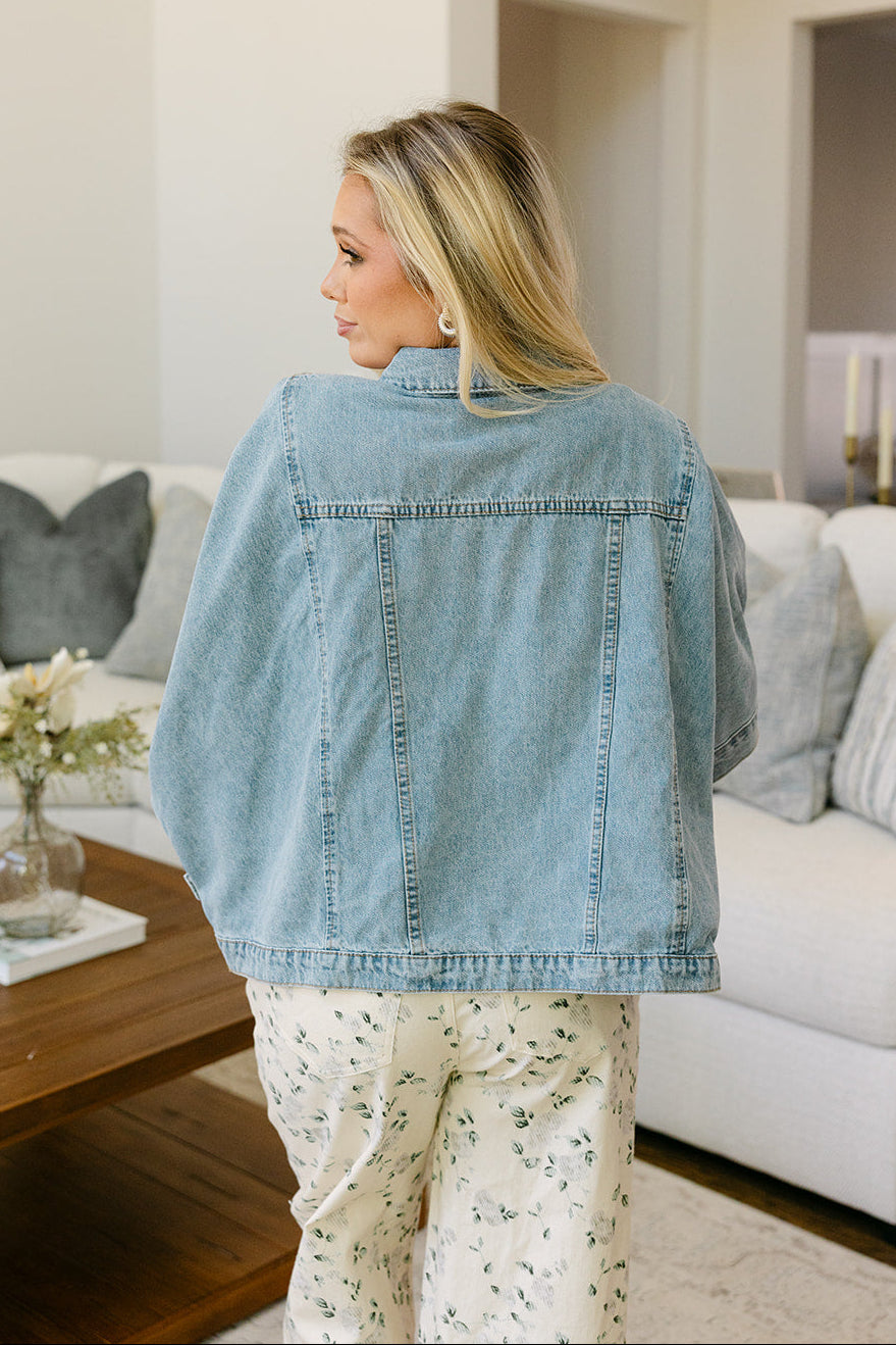 The Elodie Denim Cape Jacket is a chic, layered piece that adds modern edge to any outfit. Crafted from medium wash denim, this sleeveless jacket features a classic collar neckline and a front button-up closure for timeless appeal. Functional front chest pockets and side pockets combine practicality with style, making it both fashionable and versatile.