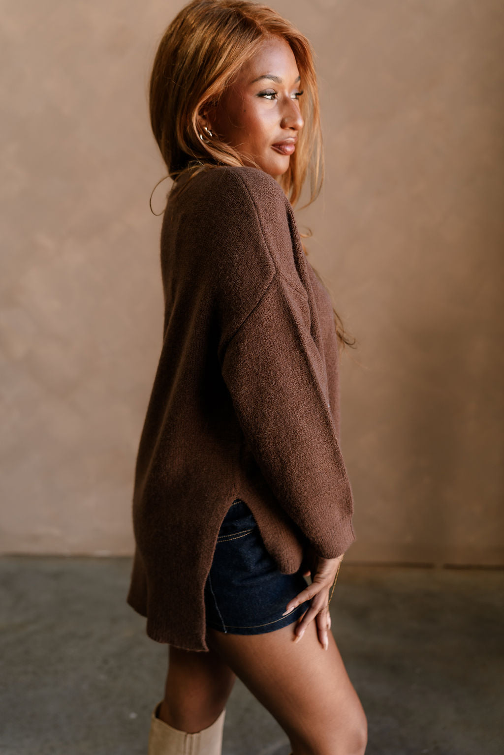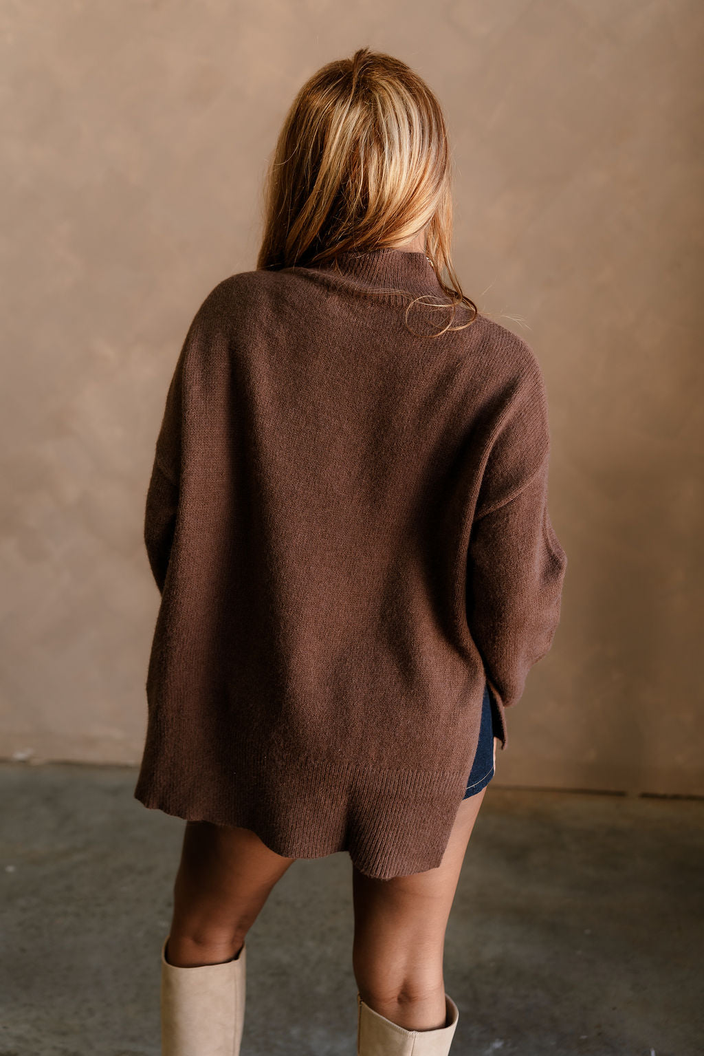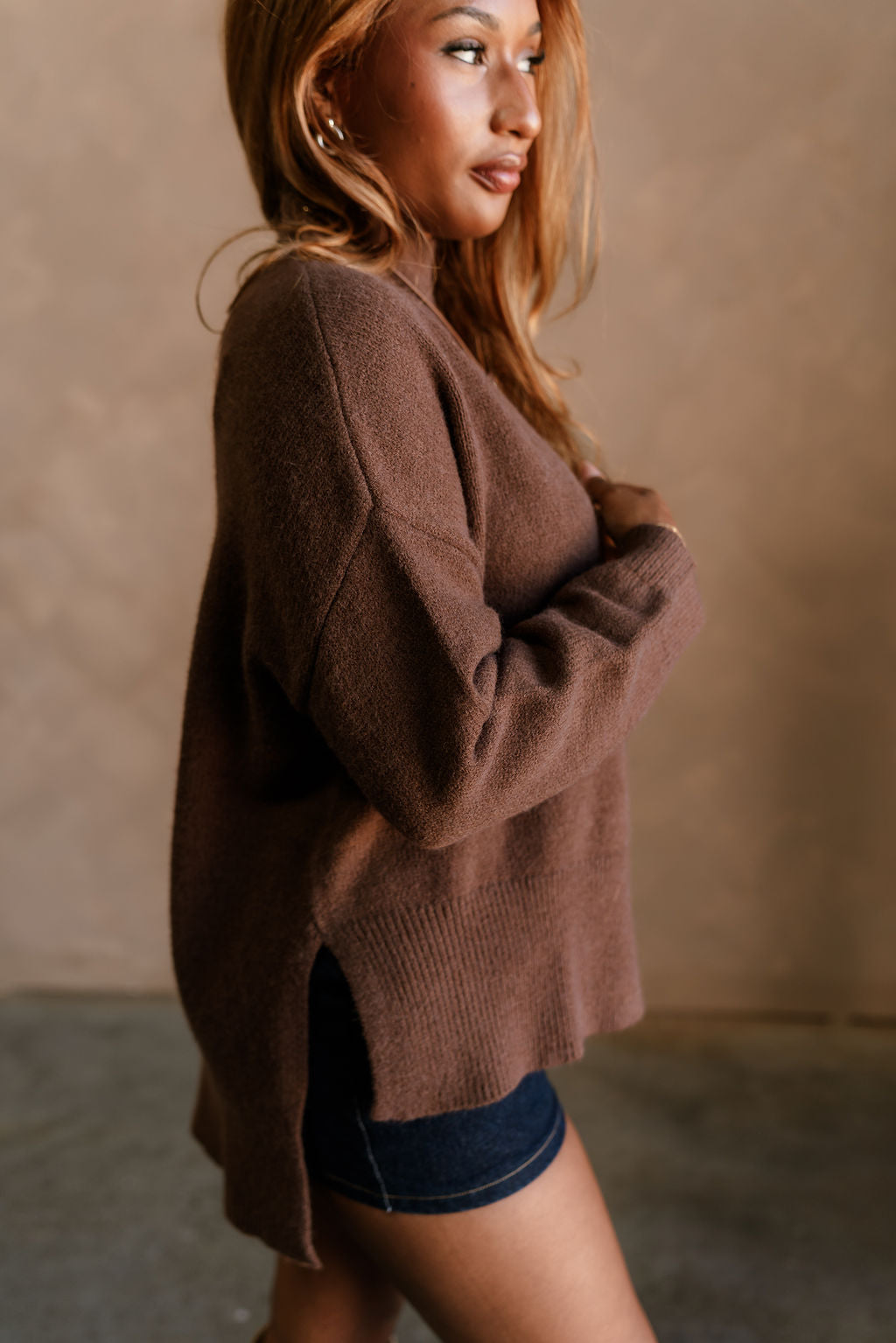 The Elody Dark Brown Mock Neck Sweater brings warm, polished simplicity to your cool-weather wardrobe. Crafted from soft dark brown knit fabric, this sweater features a high mock neckline that adds a refined touch while keeping you cozy. Dropped shoulders and long sleeves create a relaxed, easy fit, and the ribbed hem with subtle side slits gives the silhouette movement and comfort without losing its clean shape.