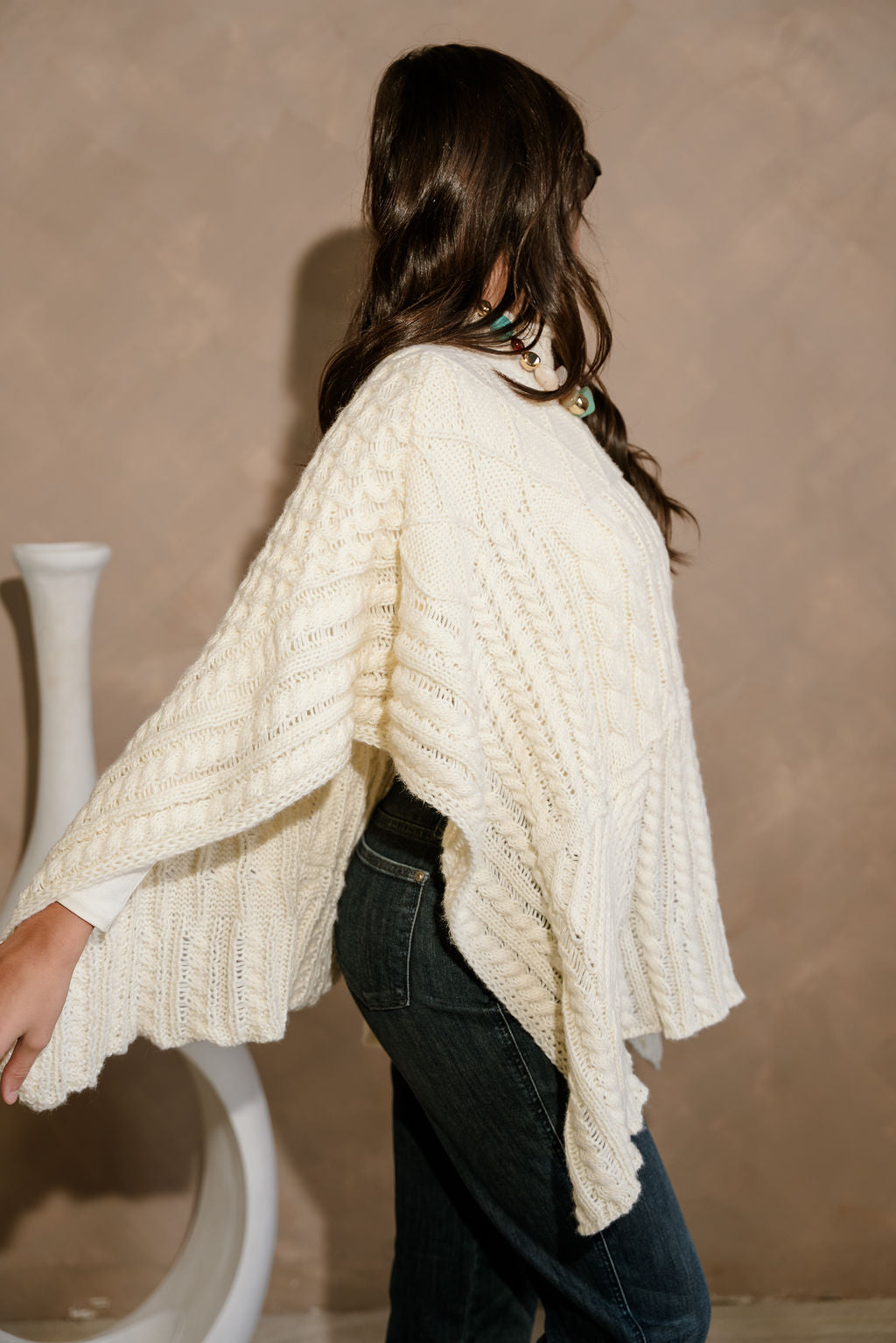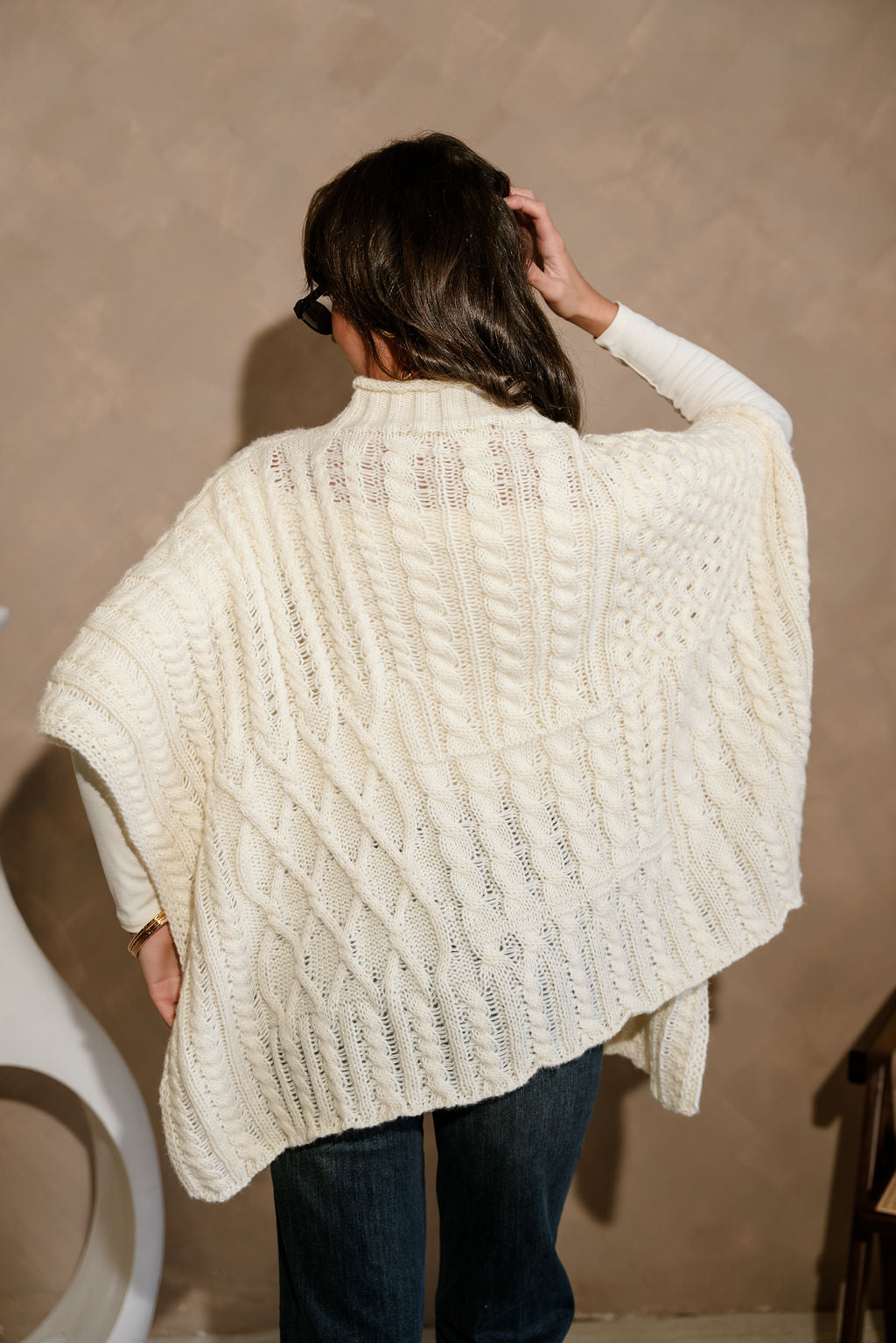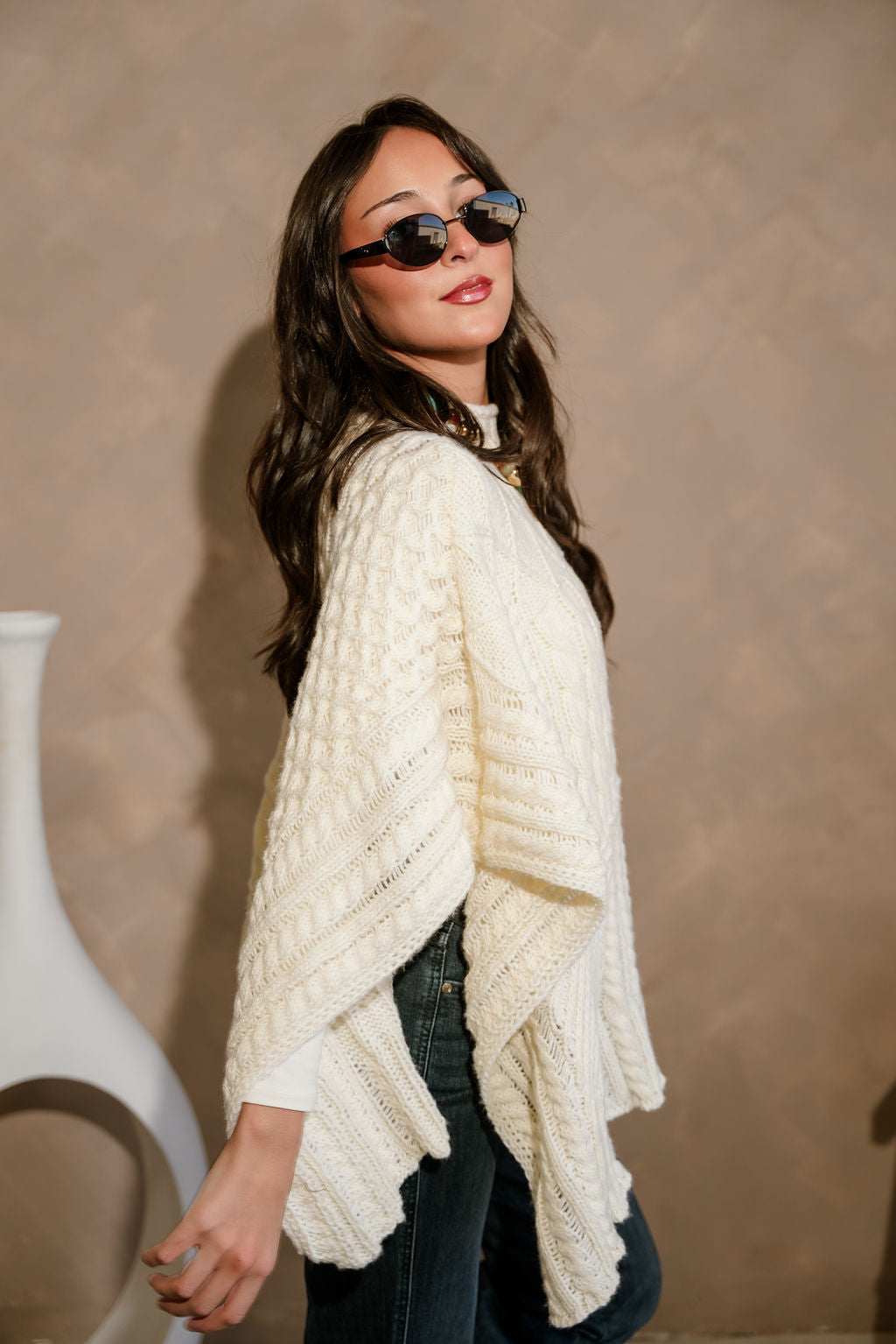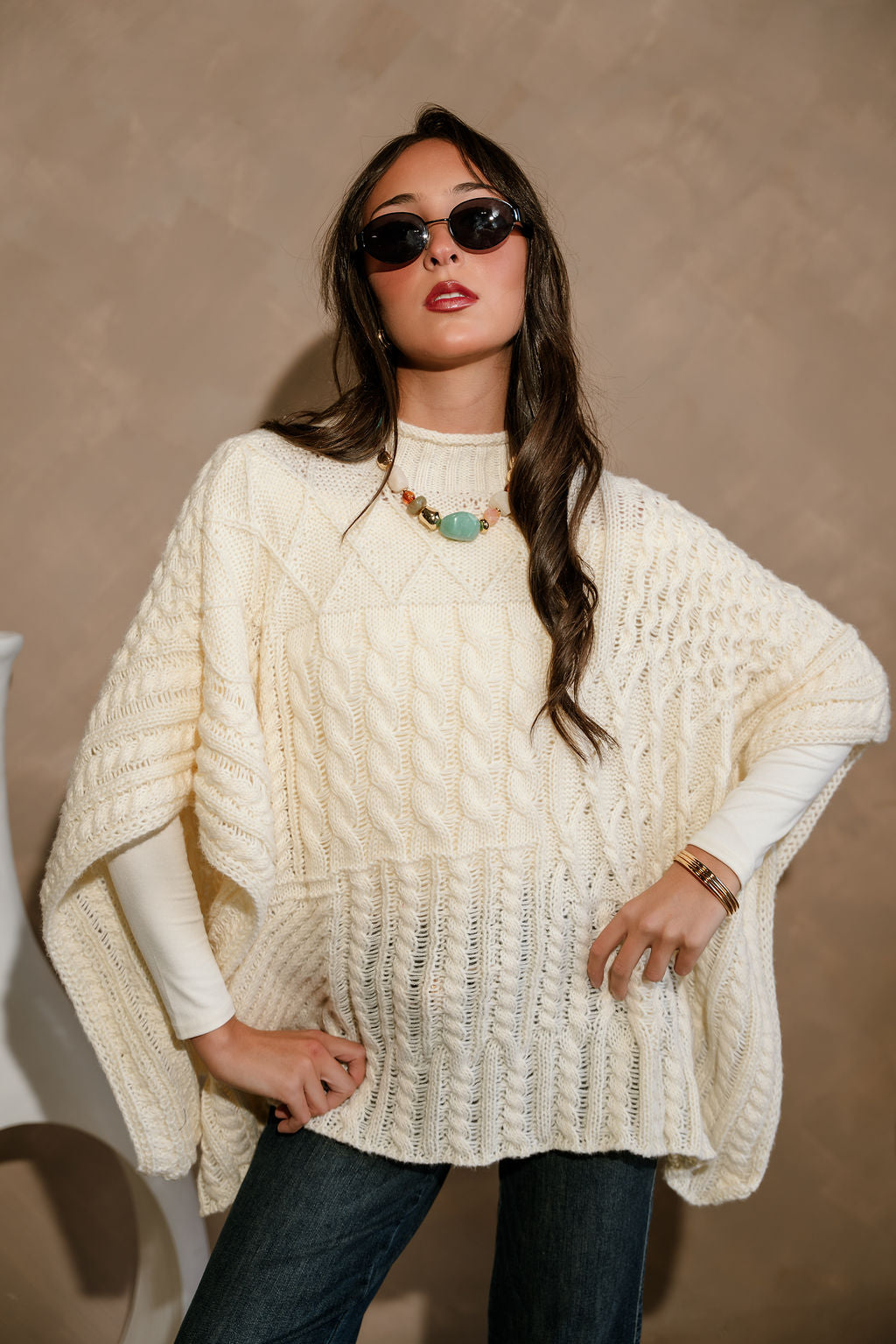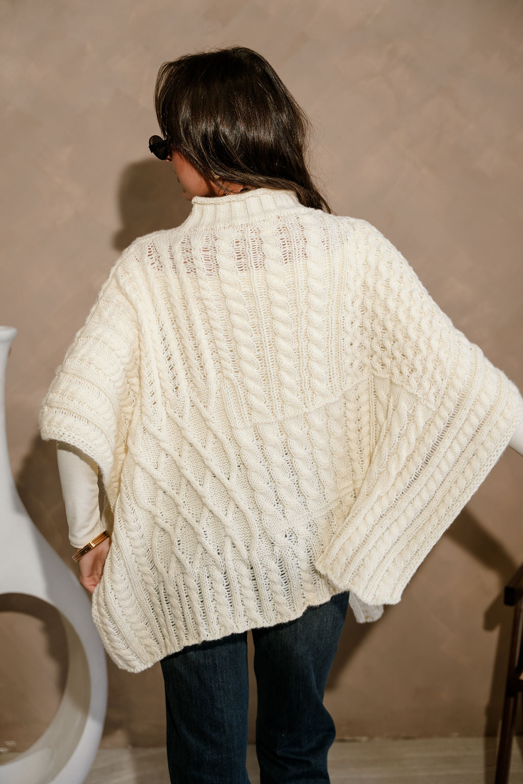 The Elouise Cream Cable Knit Poncho Sweater brings effortless coziness with a chic, elevated feel. Made from soft cream cable knit fabric, this poncho-style sweater drapes beautifully for a relaxed, comfortable silhouette. The mock neckline adds a touch of structure and warmth, while the open sides create easy movement and a flowy, laid-back fit that layers seamlessly over long sleeves or fitted tops.