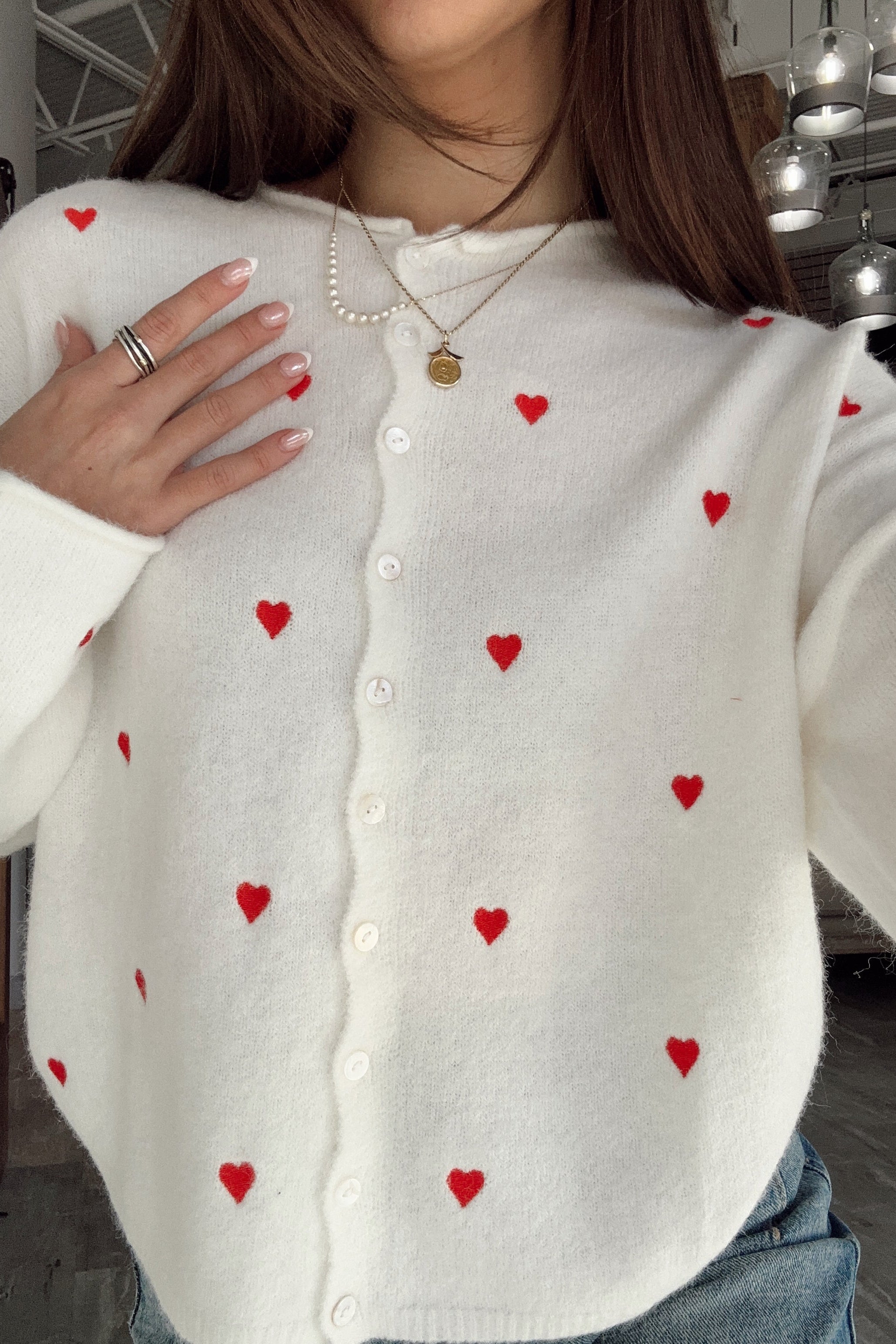 Pair it with denim, skirts, or tailored bottoms for an effortlessly cute outfit. The Emilia White & Red Hearts Cardigan blends comfort, charm, and classic style in one standout piece.