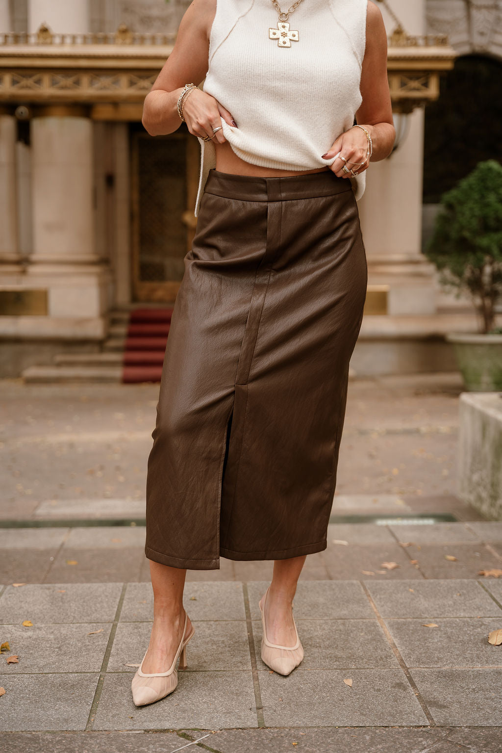 Meet your new wardrobe staple: the Emma Brown Faux Leather Midi Skirt. Made from rich, supple faux leather in a warm brown tone, this midi-length silhouette offers a timeless yet modern feel. The eye-catching front slit adds just the right amount of drama and ease of movement, while the discreet back zipper closure creates a smooth, flattering finish. Dress it up with heels and a sleek blouse or style it casually with boots and a cozy knit—this skirt is effortlessly versatile and endlessly chic.
