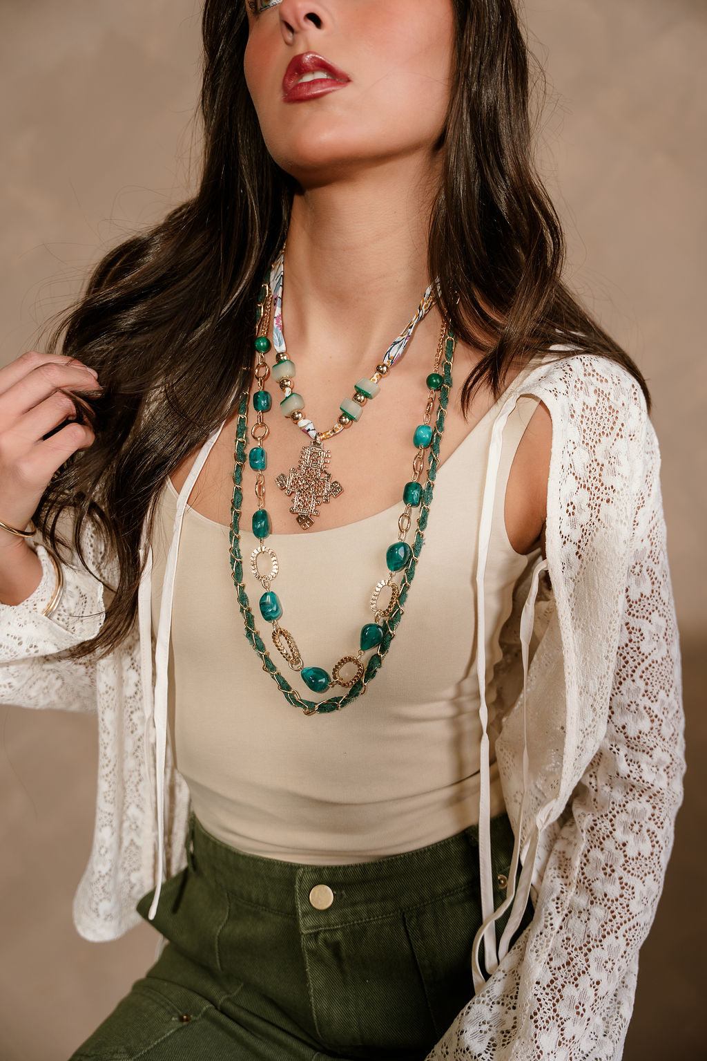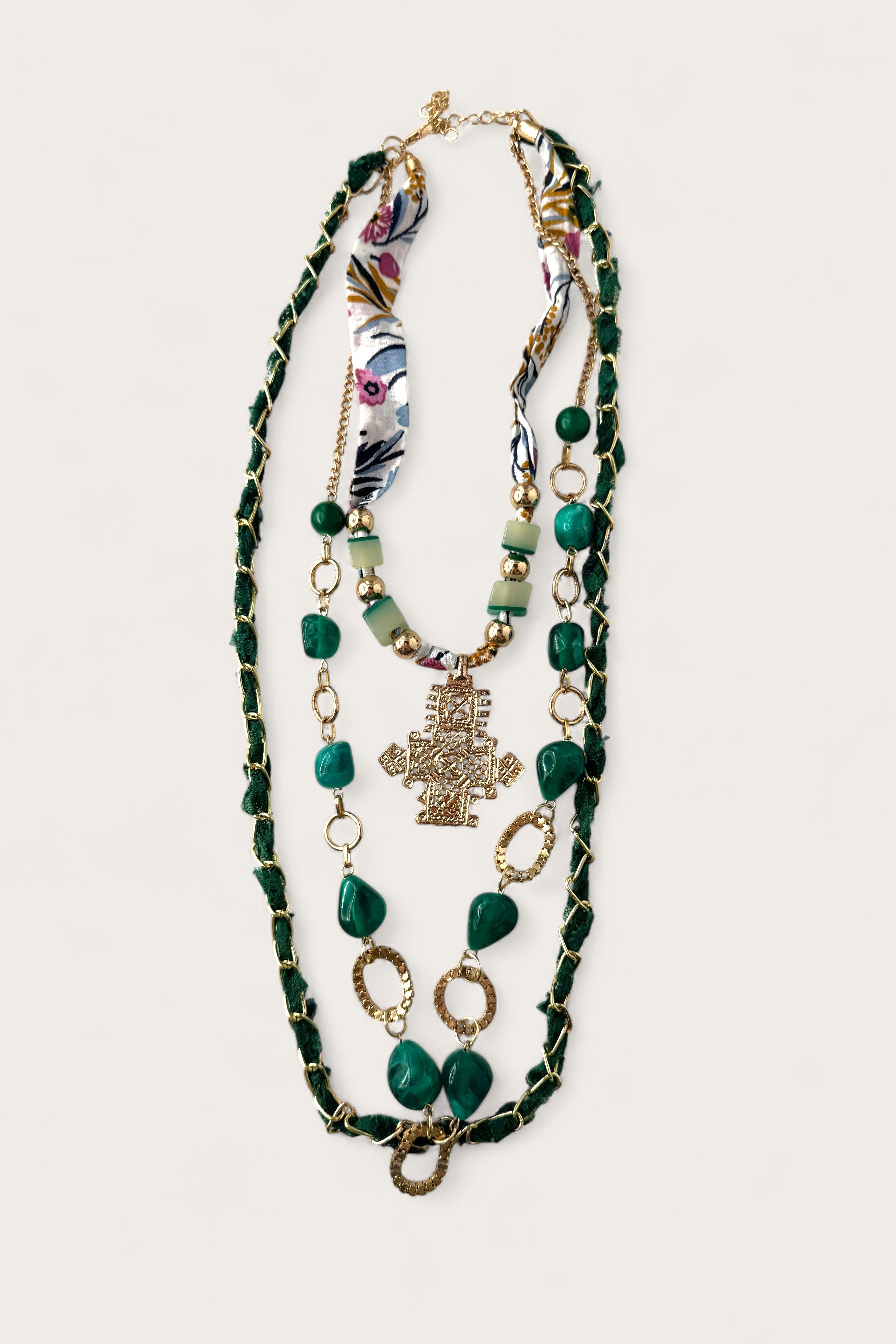 The shortest layer is finished with a large gold cross pendant accented by multicolored scarf chain details and green stone beads, creating a striking focal point. Perfect for elevating simple tops, dresses, or sweaters, the Esmeralda Necklace adds personality and a unique touch whether styled casually or dressed up.