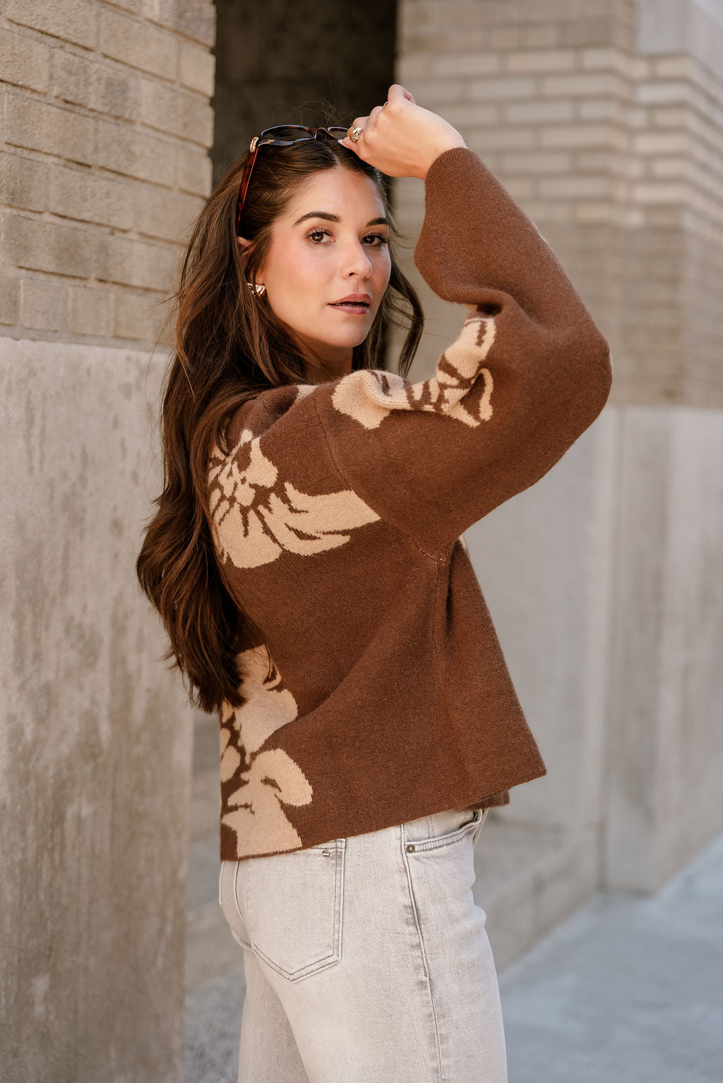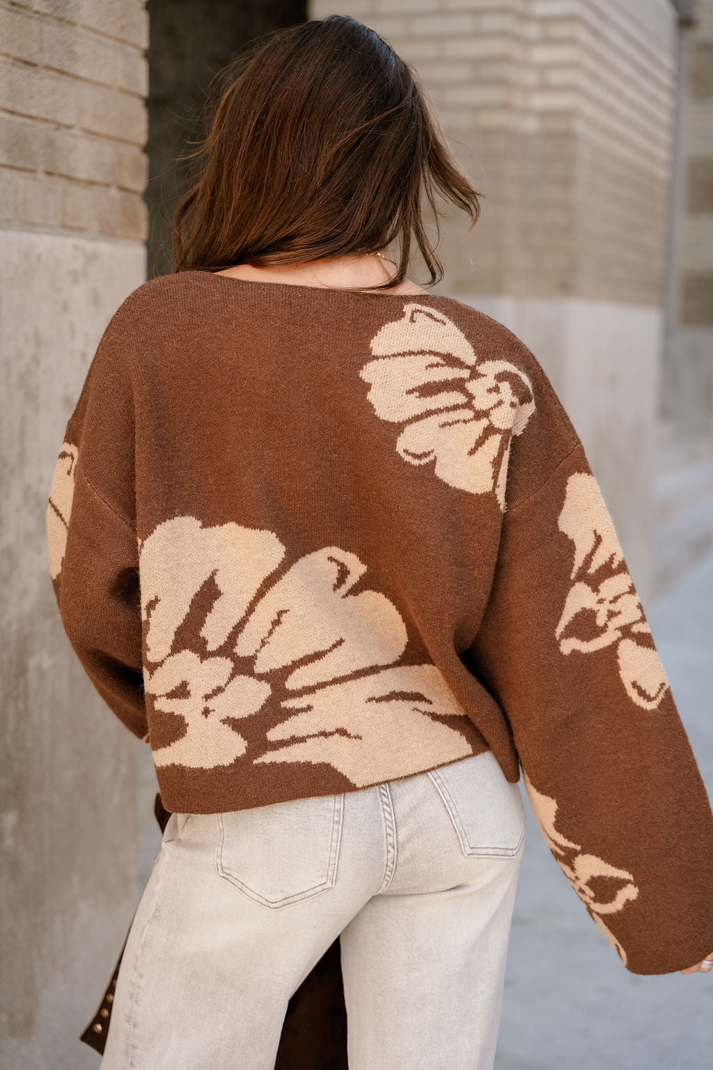 Charming, timeless, and easy to wear, the Estelle Brown & Beige Floral Knit Sweater is the perfect addition to any cool-weather wardrobe—offering just the right blend of everyday ease and understated sophistication.