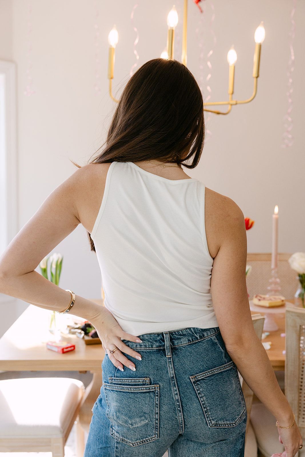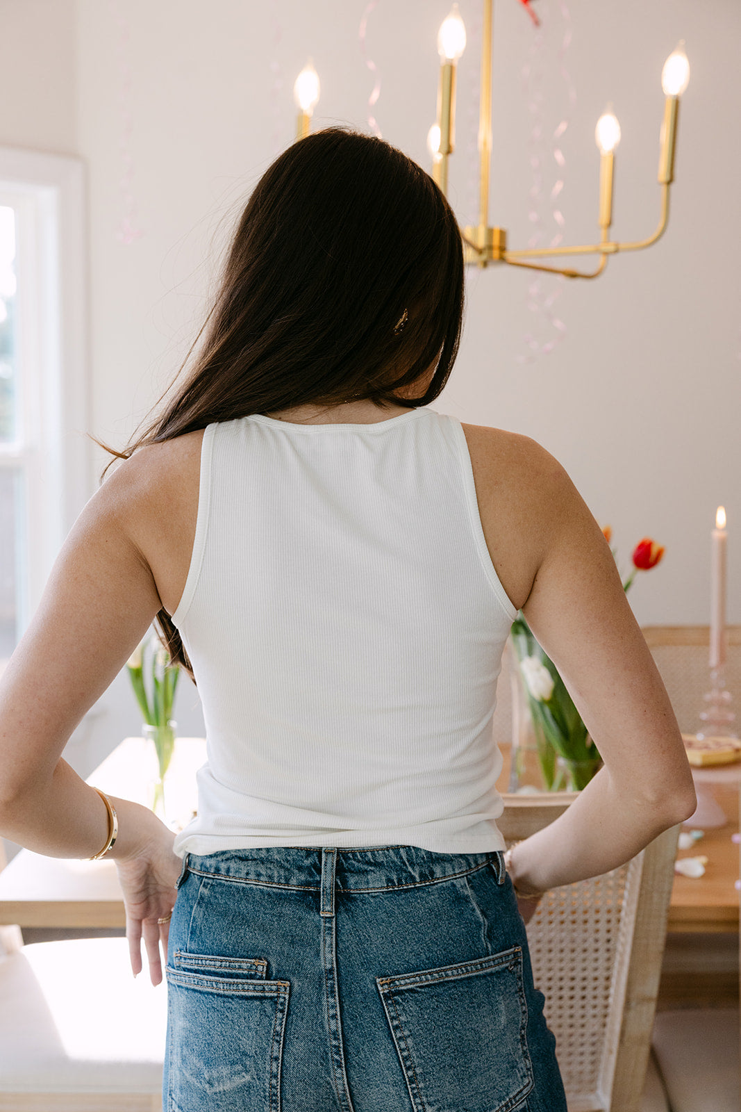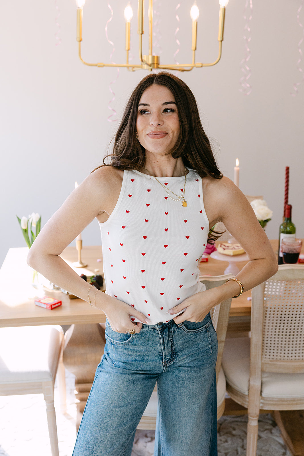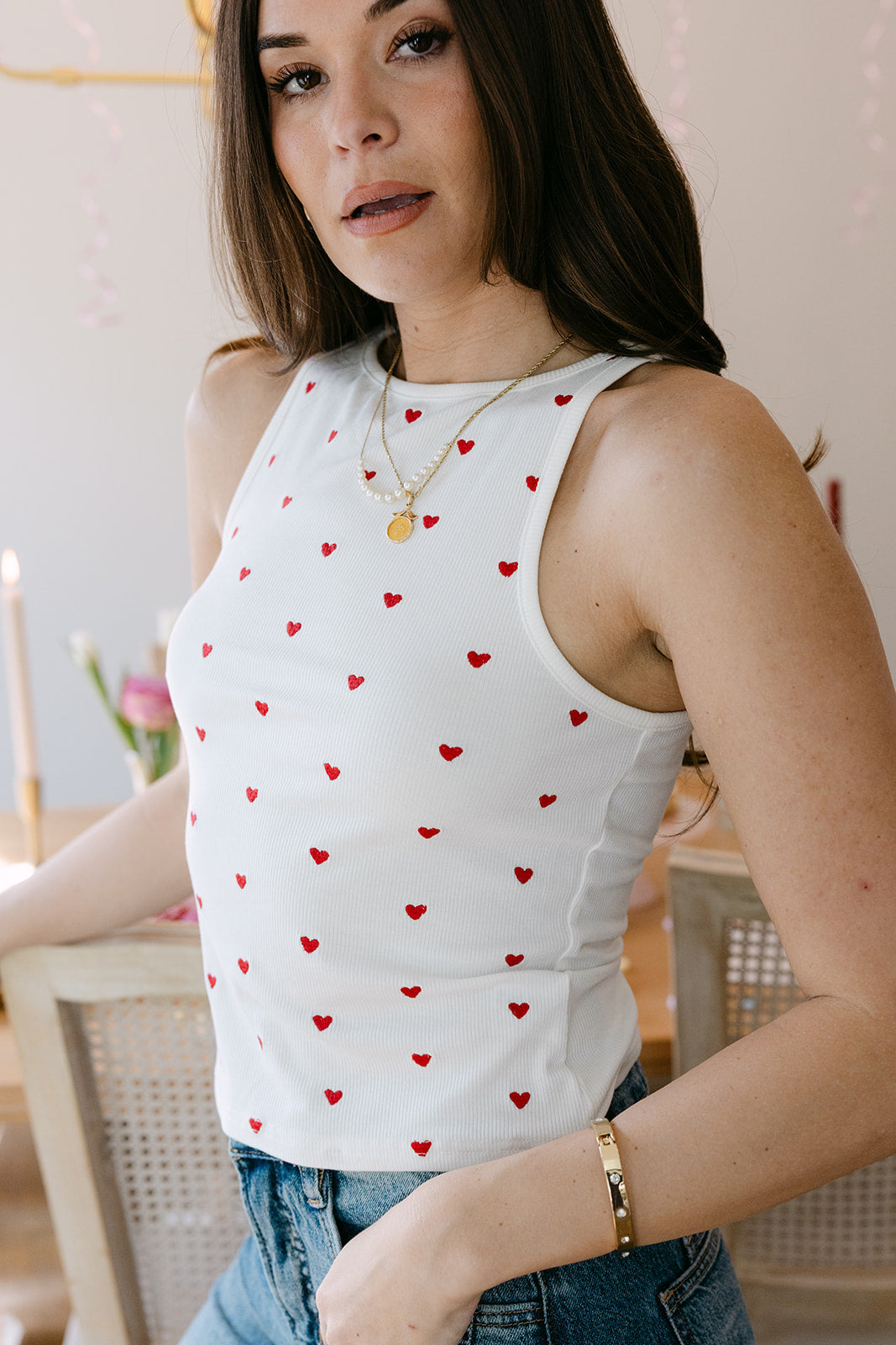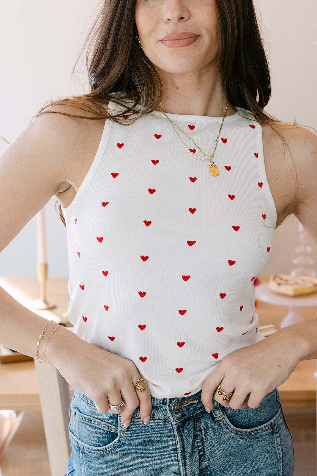 Playful and effortlessly feminine, the Estelle White & Red Hearts Ribbed Tank is a charming wardrobe essential with a sweet, modern twist. Crafted from soft white ribbed fabric, this tank offers a comfortable, figure-flattering fit that moves with ease.