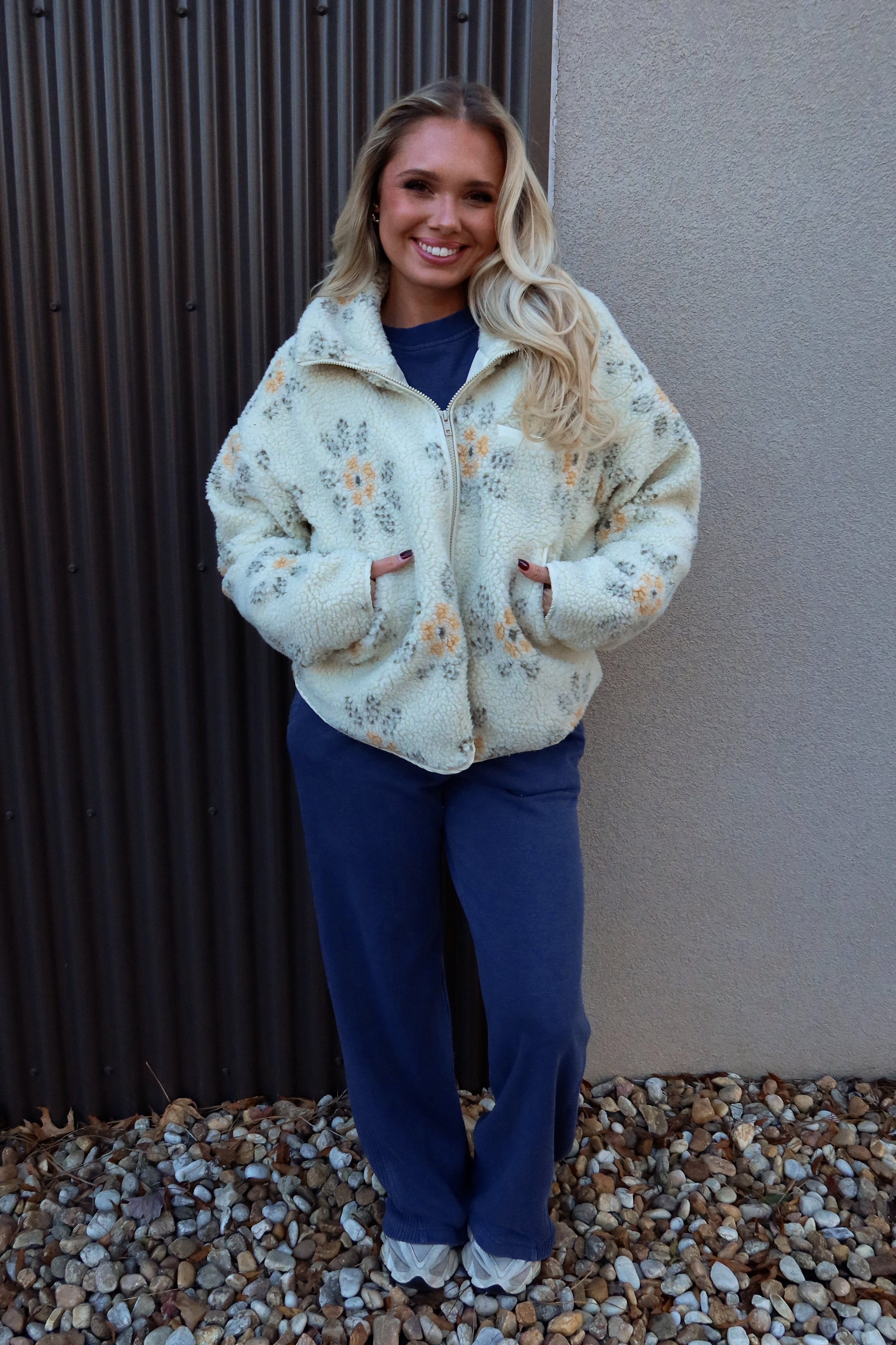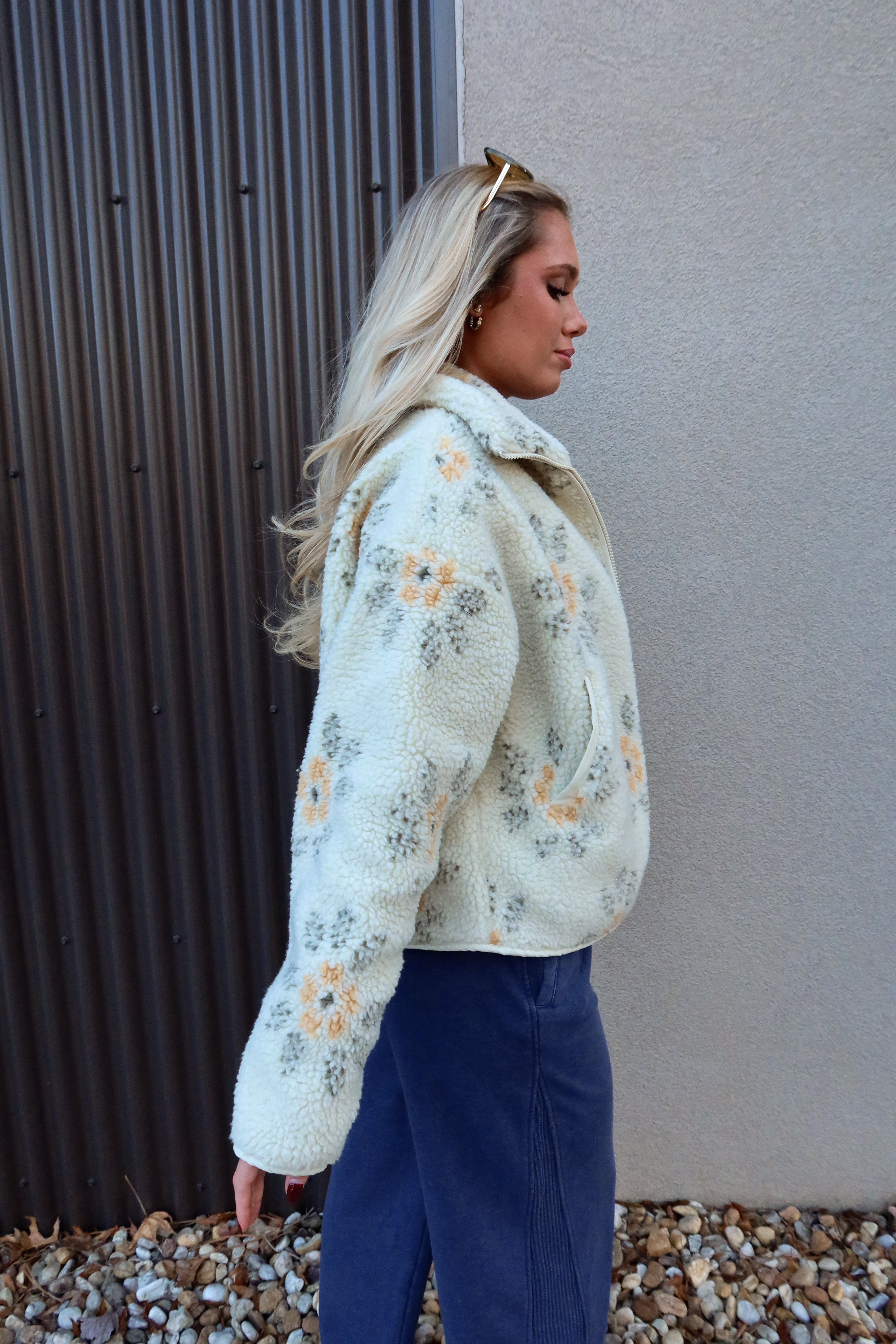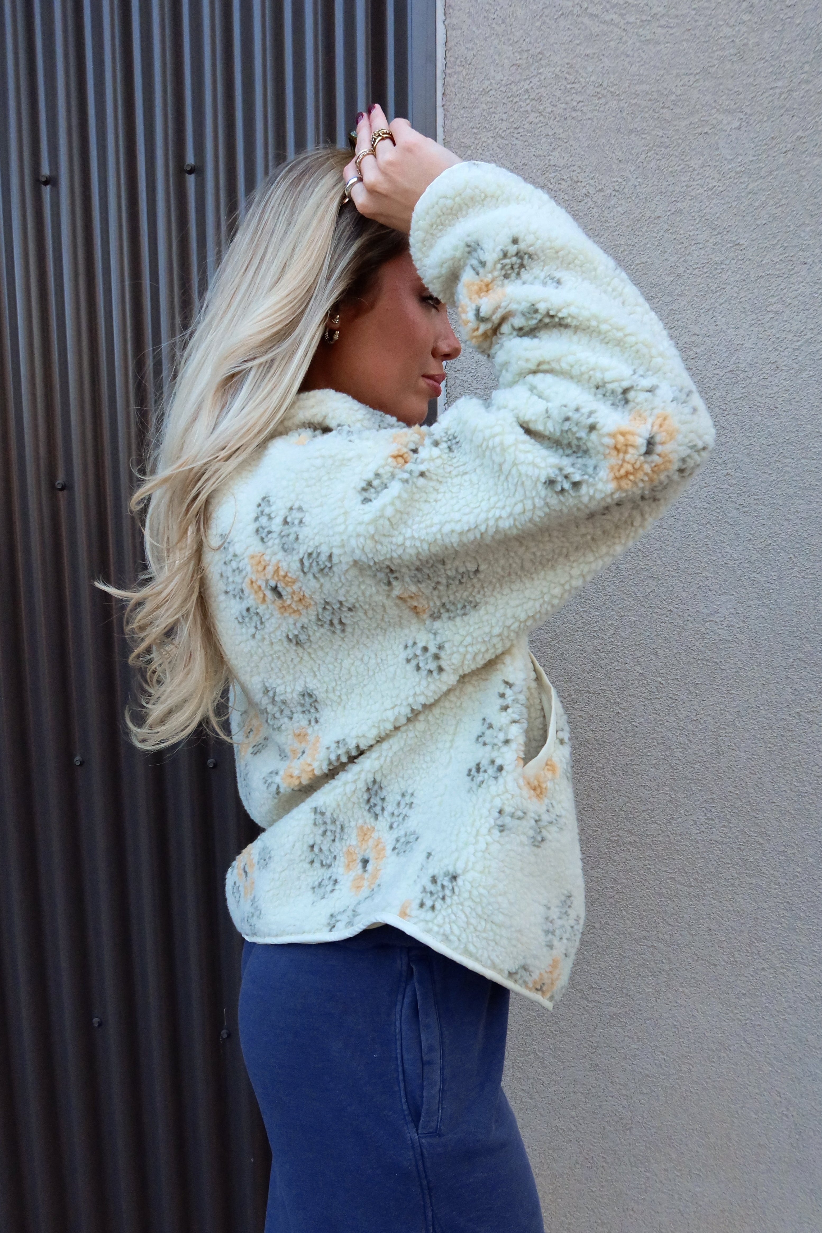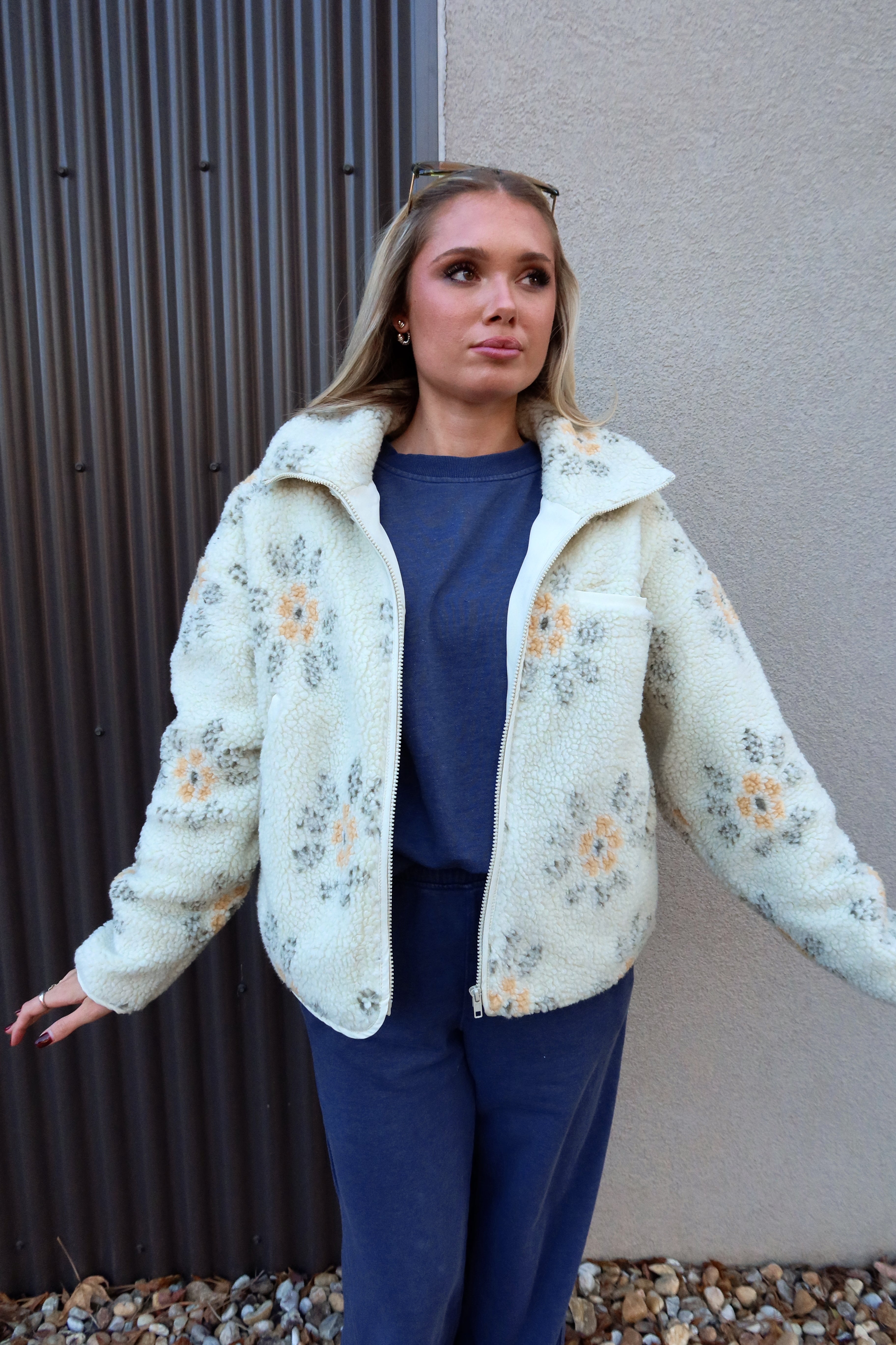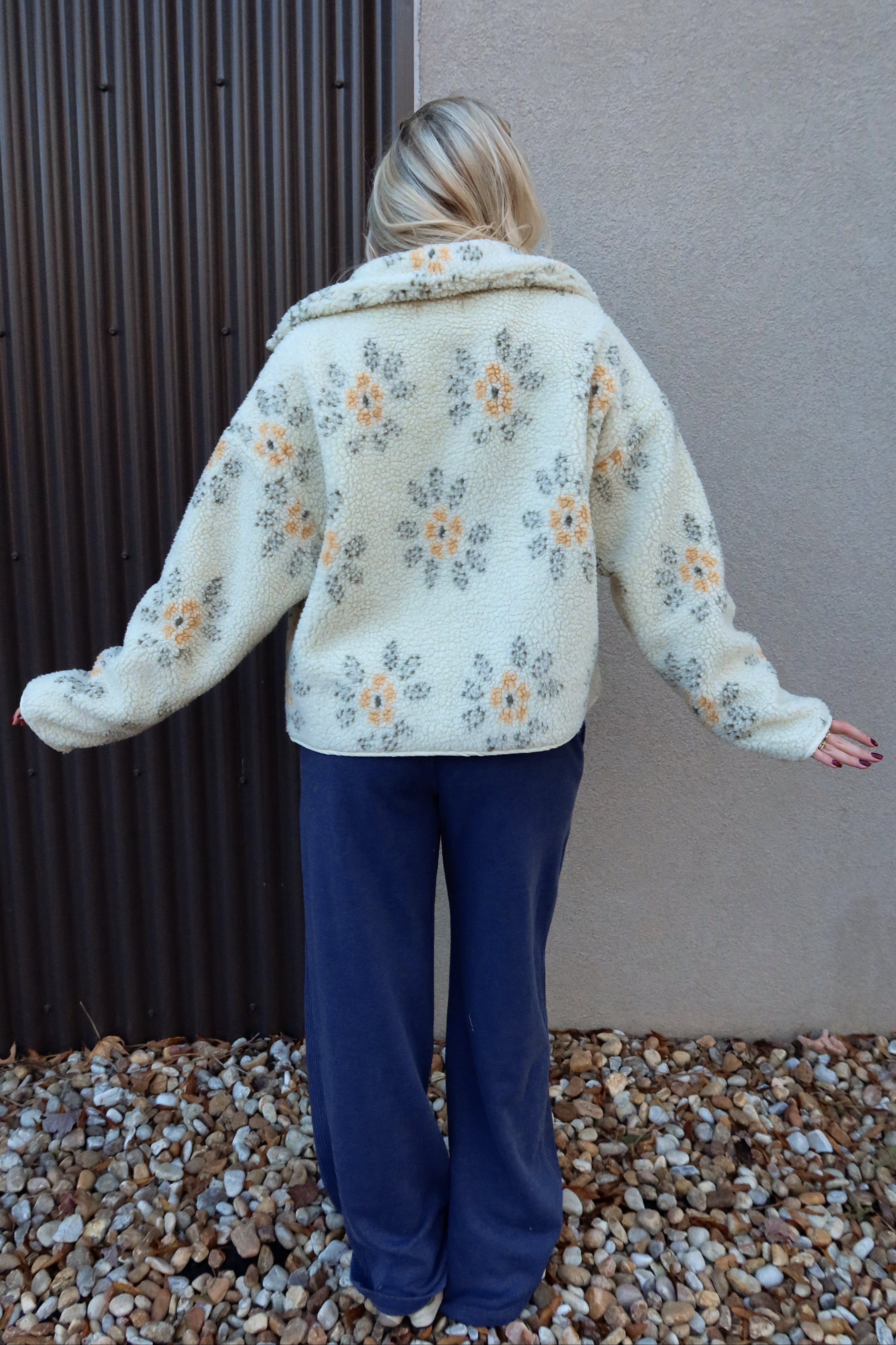 The Esther Cream Multi Floral Sherpa Jacket brings cozy charm and a touch of whimsy to your cool-weather wardrobe. Made from ultra-soft sherpa fabric in cream, olive, and yellow tones, this jacket features a playful floral print that adds personality while still remaining effortless to style. The high neckline and long sleeves keep you warm and comfortable, making it an easy grab-and-go layer for chilly days.