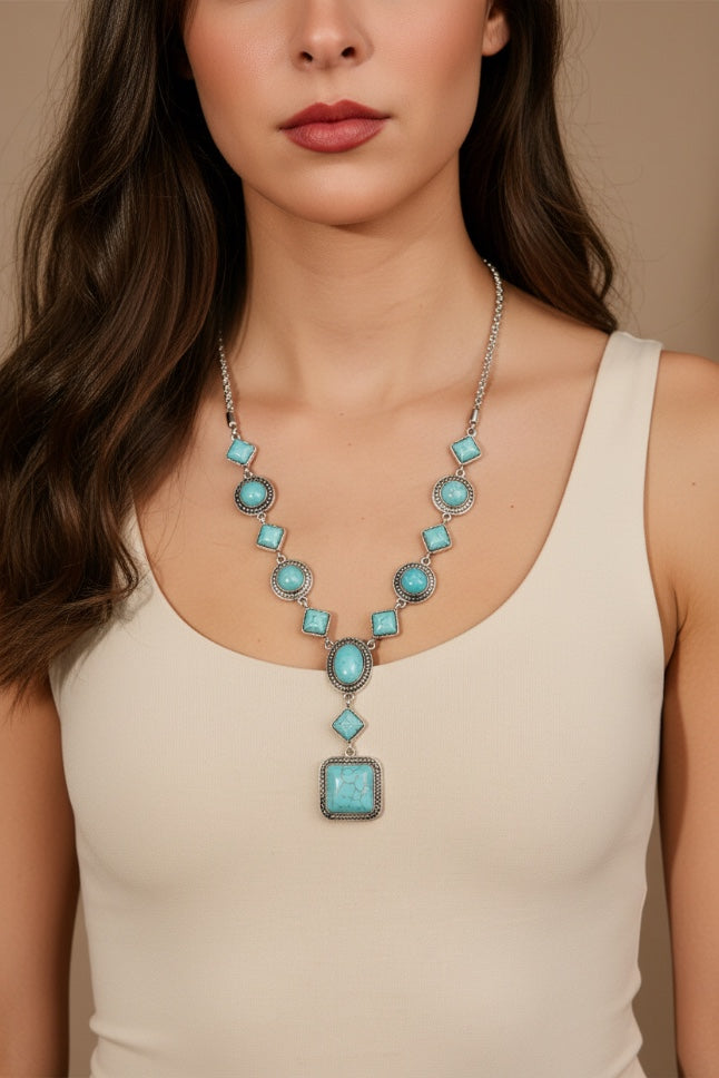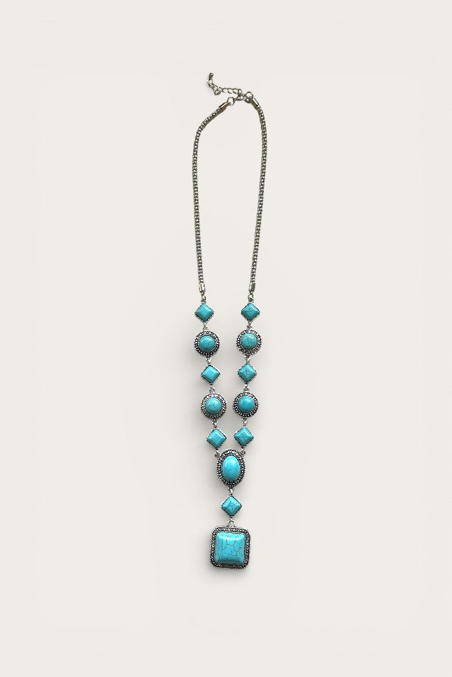 The Evelyn Silver Turquoise Necklace makes a bold yet timeless statement with its mix of crackle turquoise stones set in silver hardware. Featuring a combination of circular and diamond-shaped stones. This piece brings a western-inspired feel while still remaining polished and wearable for everyday or dressed-up looks. The vibrant turquoise adds the perfect pop of color against neutral and denim-heavy outfits.