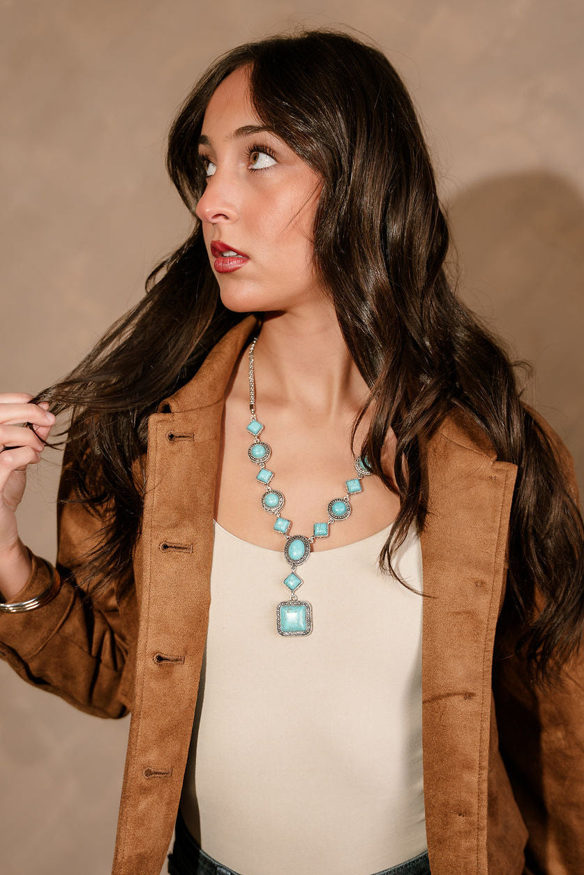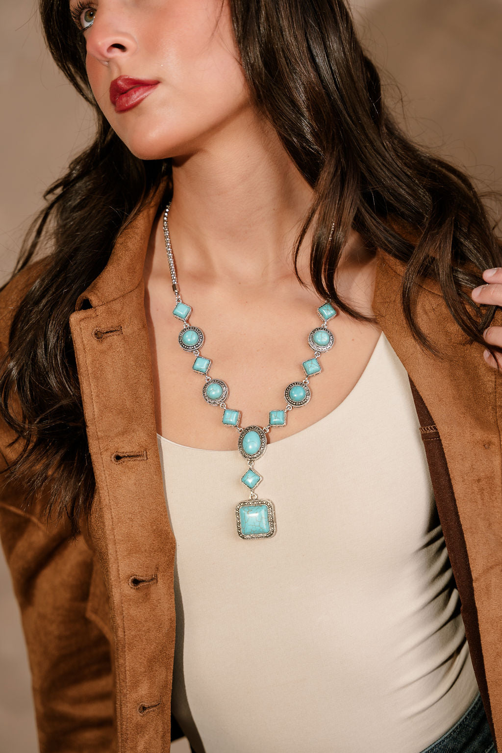 The Evelyn Silver Turquoise Necklace makes a bold yet timeless statement with its mix of crackle turquoise stones set in silver hardware. Featuring a combination of circular and diamond-shaped stones, this piece brings a western-inspired feel while still remaining polished and wearable for everyday or dressed-up looks. The vibrant turquoise adds the perfect pop of color against neutral and denim-heavy outfits.