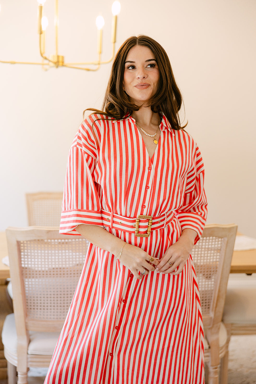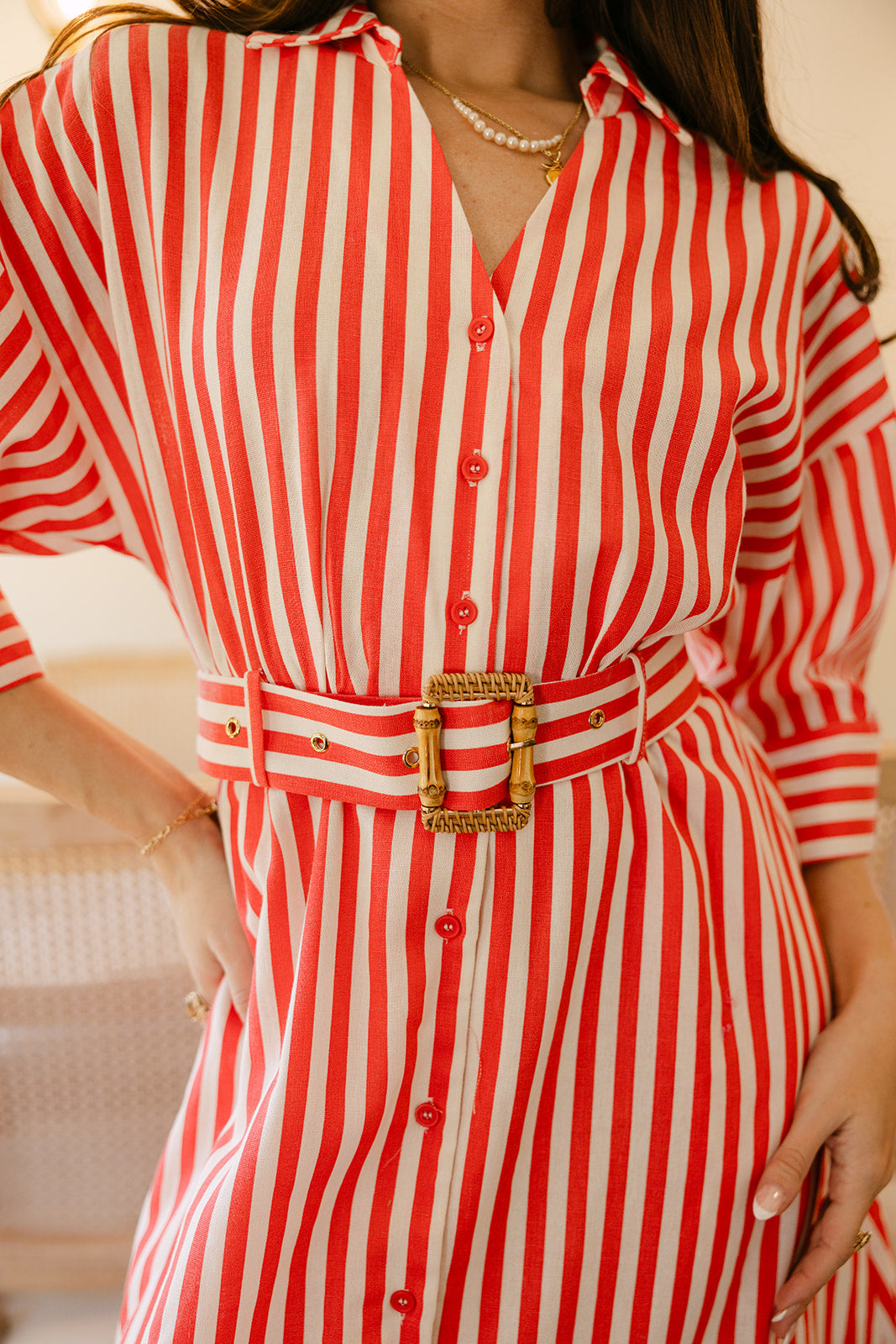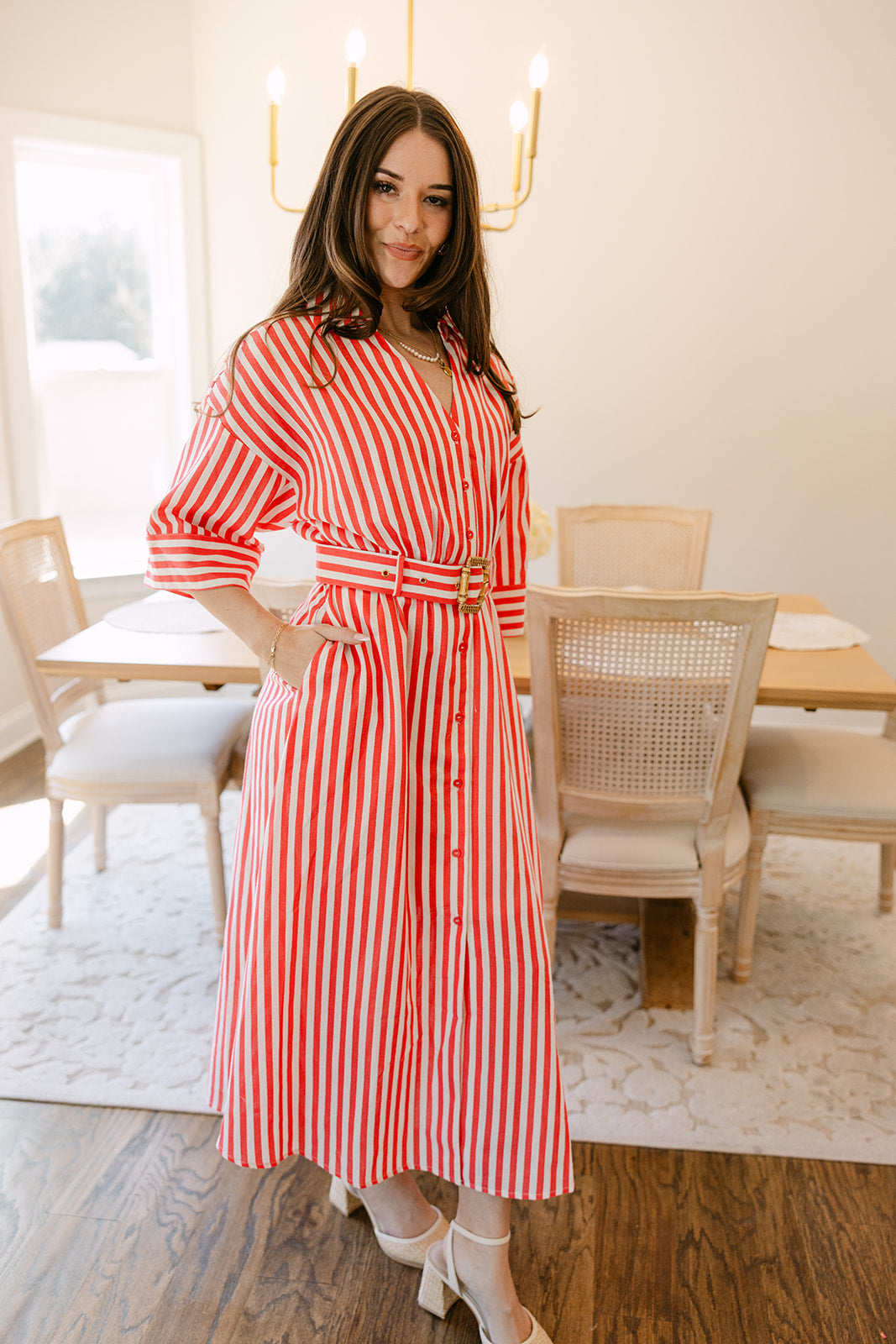 Everly Coral Red & Ivory Linen Stripe Belt Dress