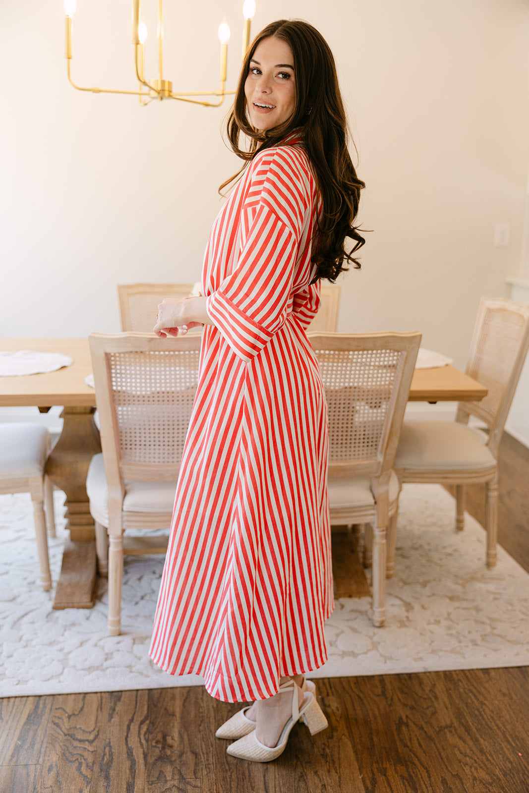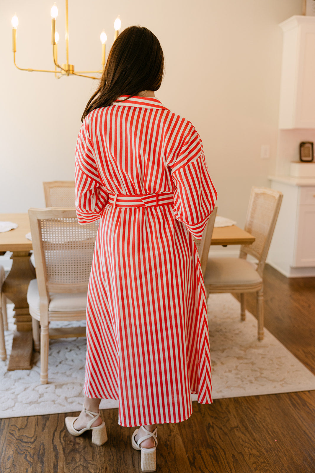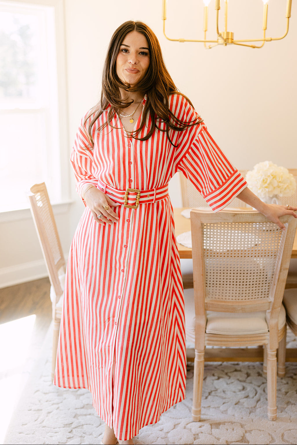 Everly Coral Red & Ivory Linen Stripe Belt Dress