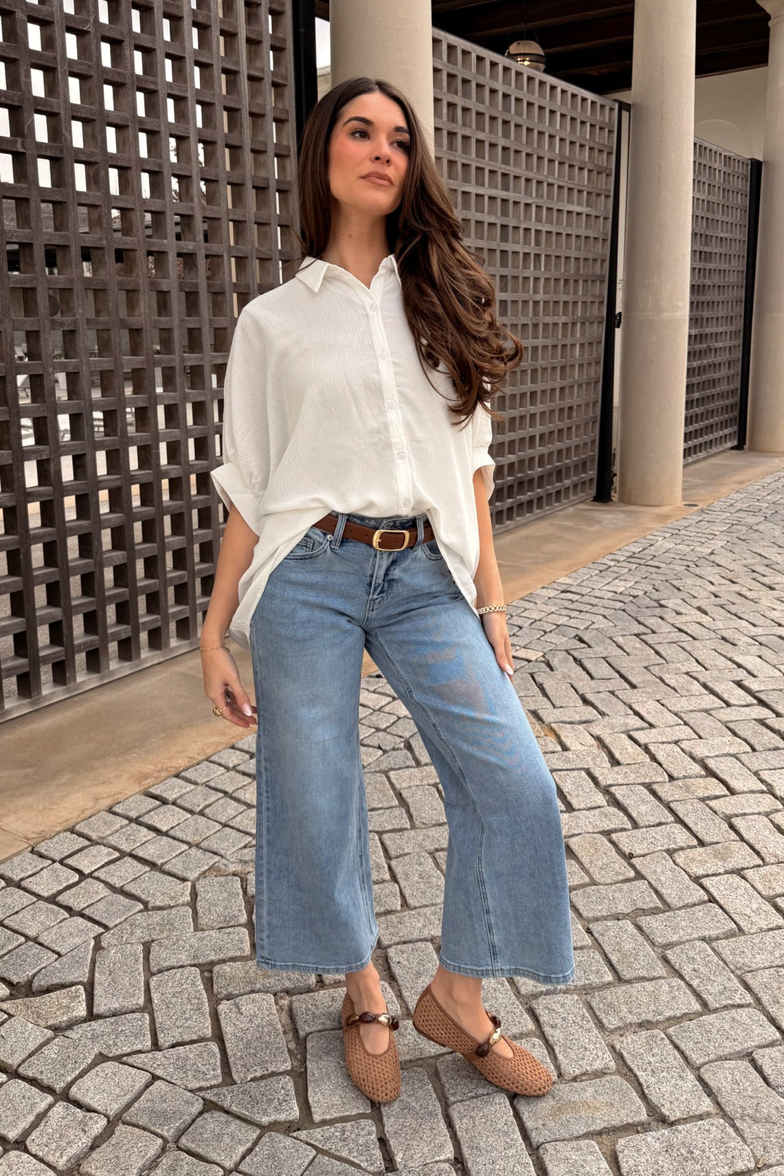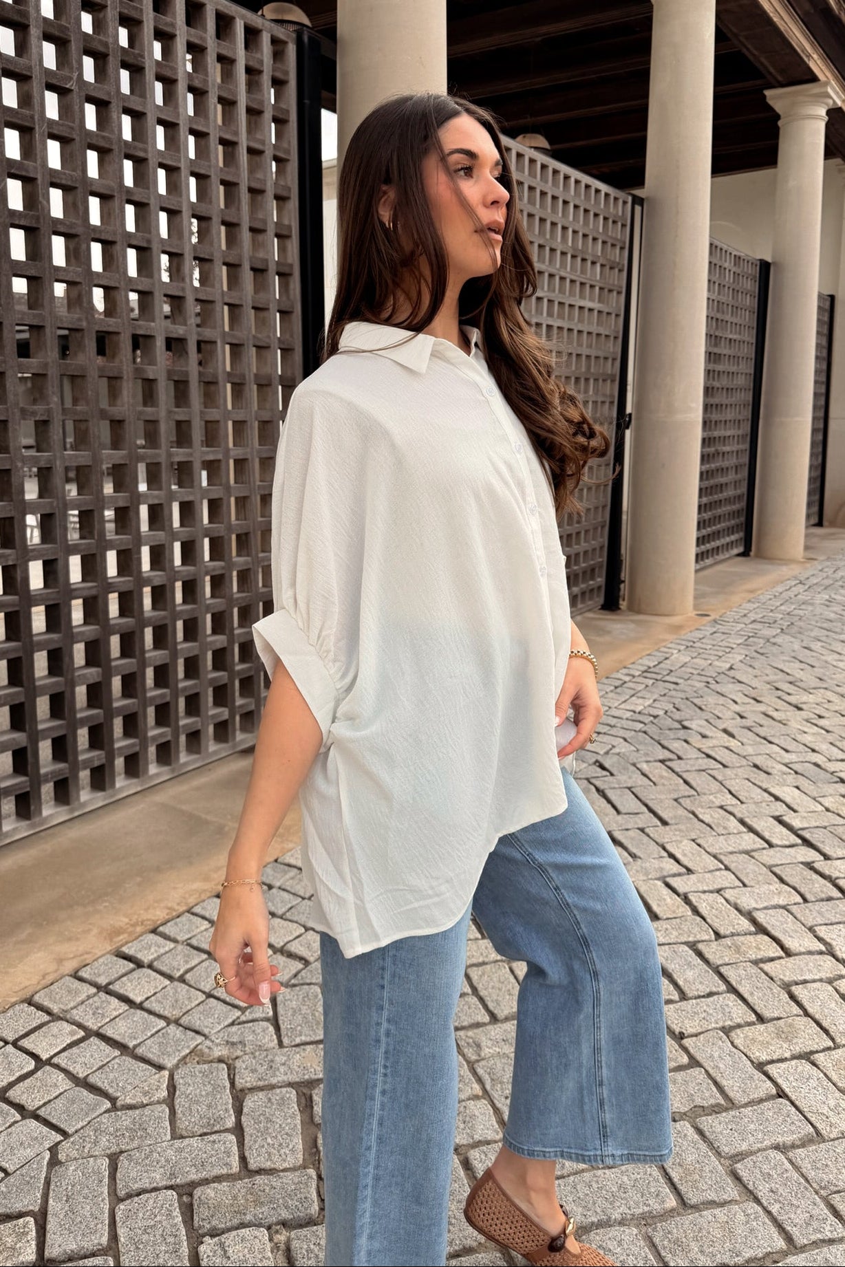 Timeless and effortlessly versatile, the Evie Off White Button-Up Top is a wardrobe essential. Crafted from lightweight off-white fabric, this top features a classic collar neckline and a clean front button-up closure for a polished look. Short sleeves keep the design fresh and easy to wear, making it perfect for layering or styling on its own. Whether paired with tailored trousers, denim, or skirts, the Evie Top offers a chic, elevated touch to both casual and professional outfits.