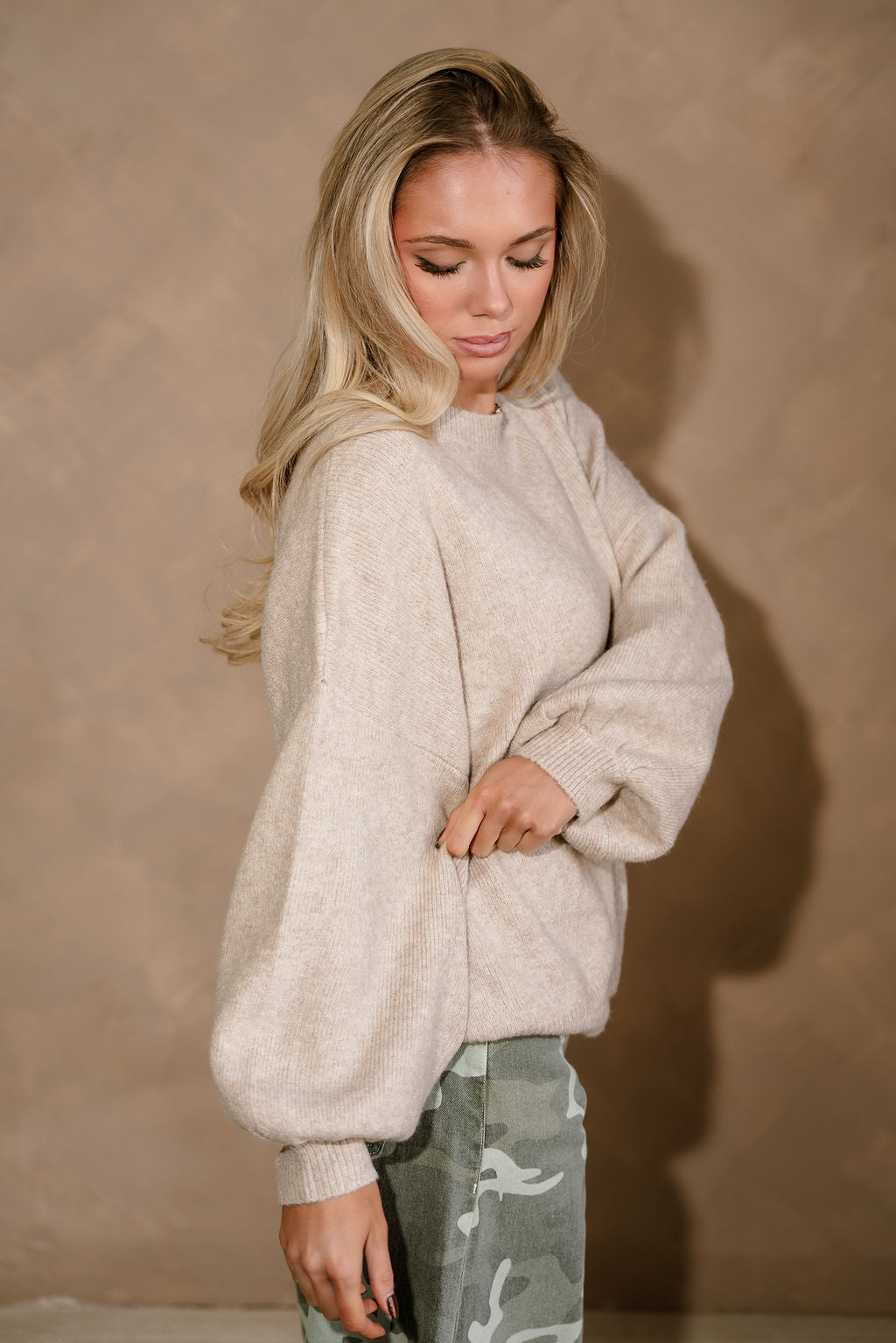 The Farrah Beige Balloon Sleeve Sweater is a cozy neutral with a modern, fashion-forward silhouette. Made from soft beige knit fabric, this sweater features a classic round neckline and dropped shoulders for a relaxed, effortless fit. The ribbed hem adds subtle structure while keeping the look comfortable and easy to wear.
