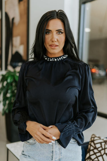 A must-have Navy Satin Long Sleeve Top for your elevated looks