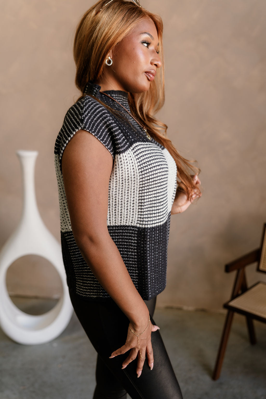 Whether you're dressing for the office or putting together a chic weekend outfit, the Fiona Black & Cream Colorblock Sleeveless Sweater brings versatility and style in one easy piece. Its structured yet comfortable fit gives you a refined look that transitions smoothly from season to season.