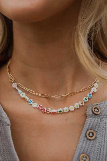 The Flower Power Necklace features double strands: 1 short gold link chain, and 1 gold chain with smaller links and white and multi flower beads along the bottom.