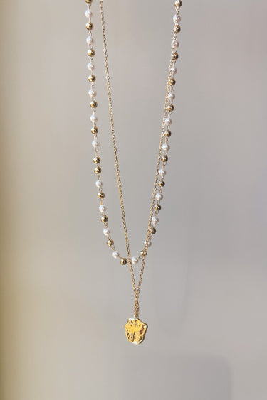 The Forget Me Not Layered Necklace features double gold layer necklace with gold and white pearls and hammered gold attachment.