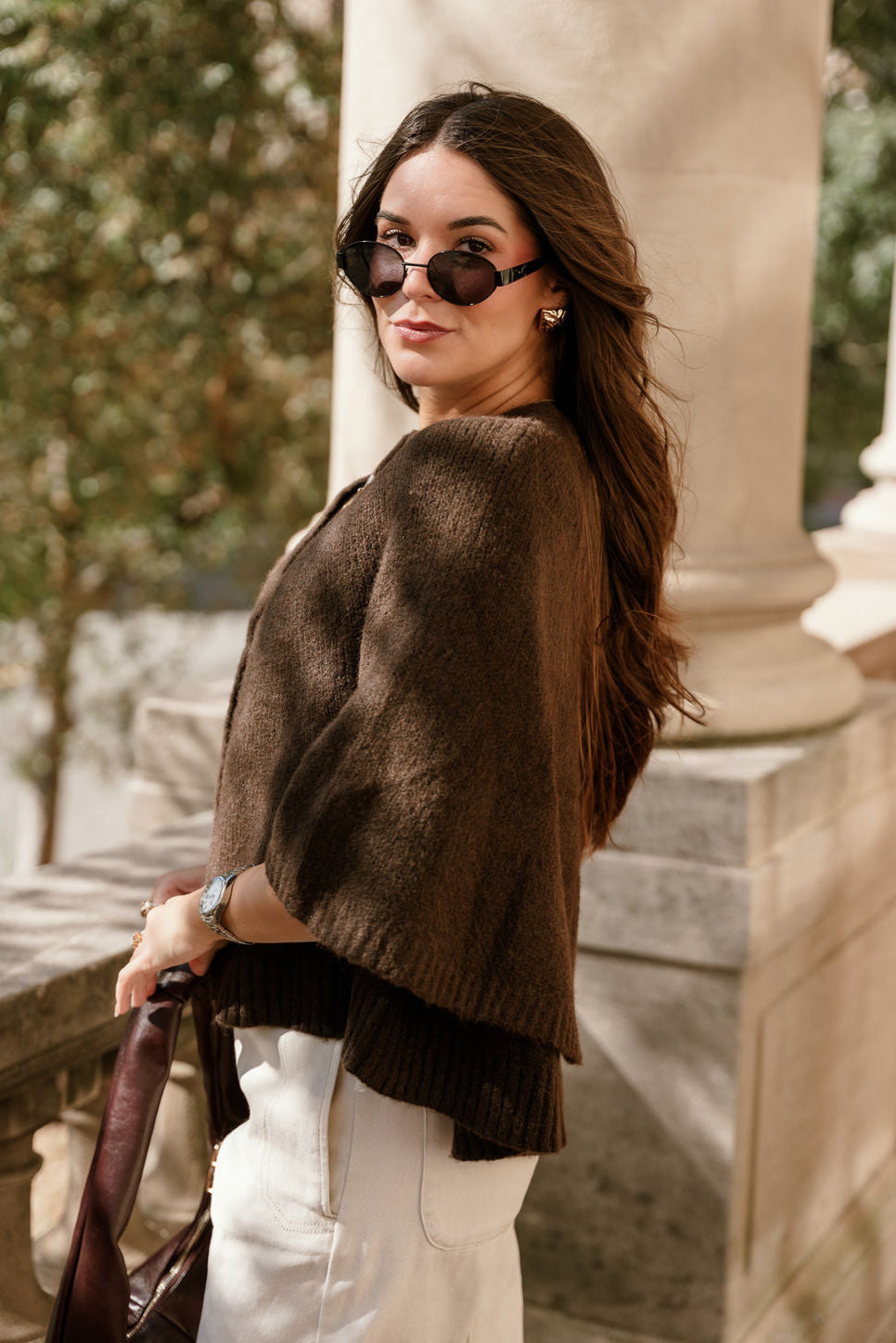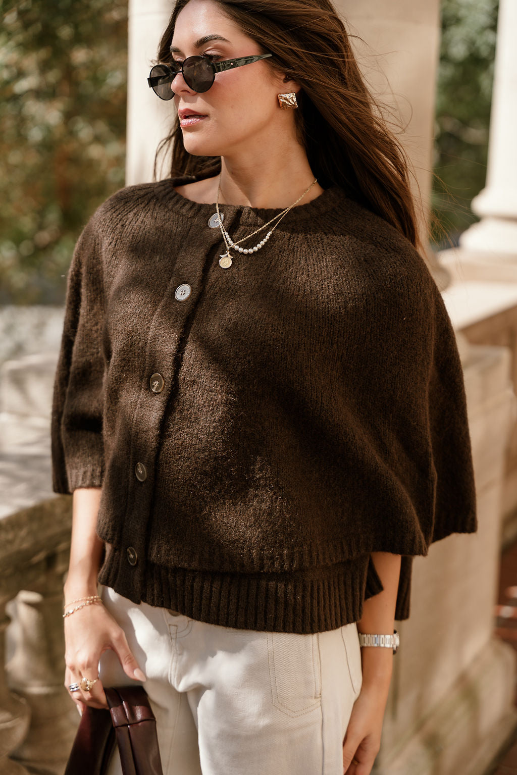 The Freya Dark Brown Knit Cape Cardigan brings timeless elegance to your layering collection. Made from soft dark brown knit fabric, this sleeveless design features a graceful cape overlay that drapes effortlessly over the shoulders. The tortoise button-up front and round neckline offer classic detailing, while the ribbed hem adds a touch of structure. Perfect for transitioning between seasons, the Freya cardigan combines cozy texture with sophisticated style.