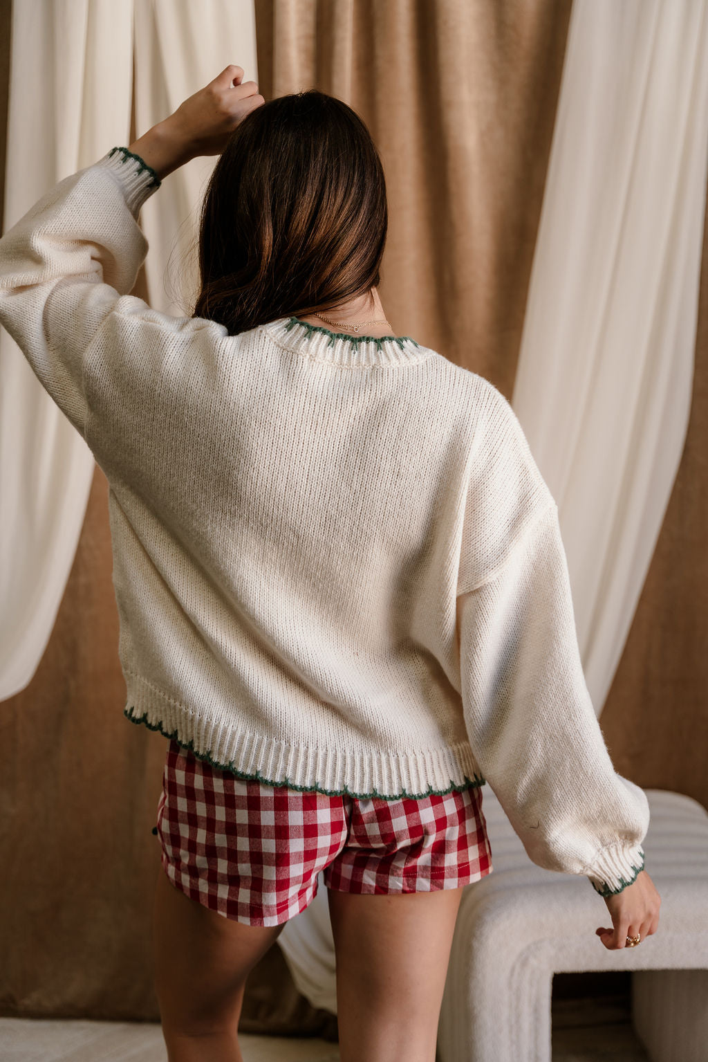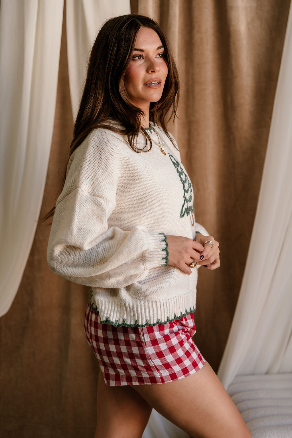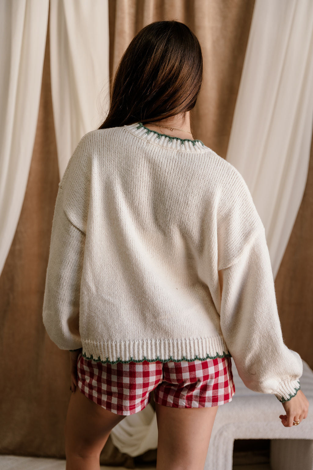 Cozy up in festive charm with the Freya Green & Cream Christmas Tree Stitch Sweater. Crafted from soft cream and green knit fabric, this cheerful sweater blends comfort and seasonal style with ease. The playful tree stitch graphic adds a whimsical holiday touch, while the ribbed scallop trim brings a sweet, elevated finish. Designed with a classic round neckline, relaxed dropped shoulders, and long sleeves, it offers a cozy, laid-back fit perfect for chilly days. Pair it with your favorite denim, leggings, or a satin skirt for a spirited look that’s merry, bright, and effortlessly cute.