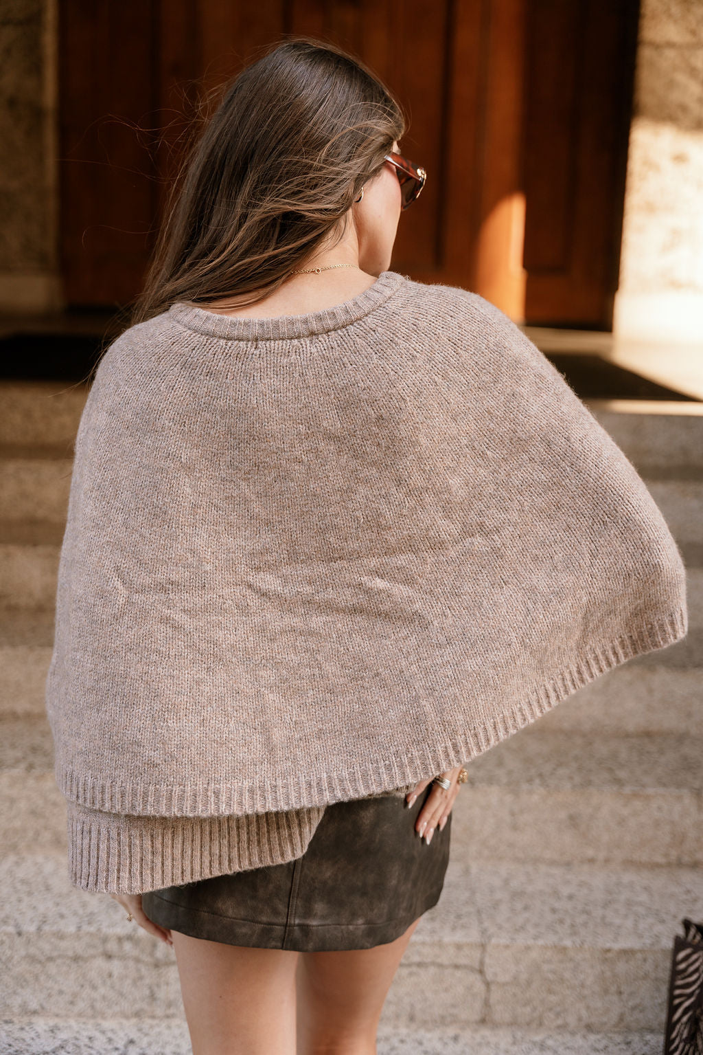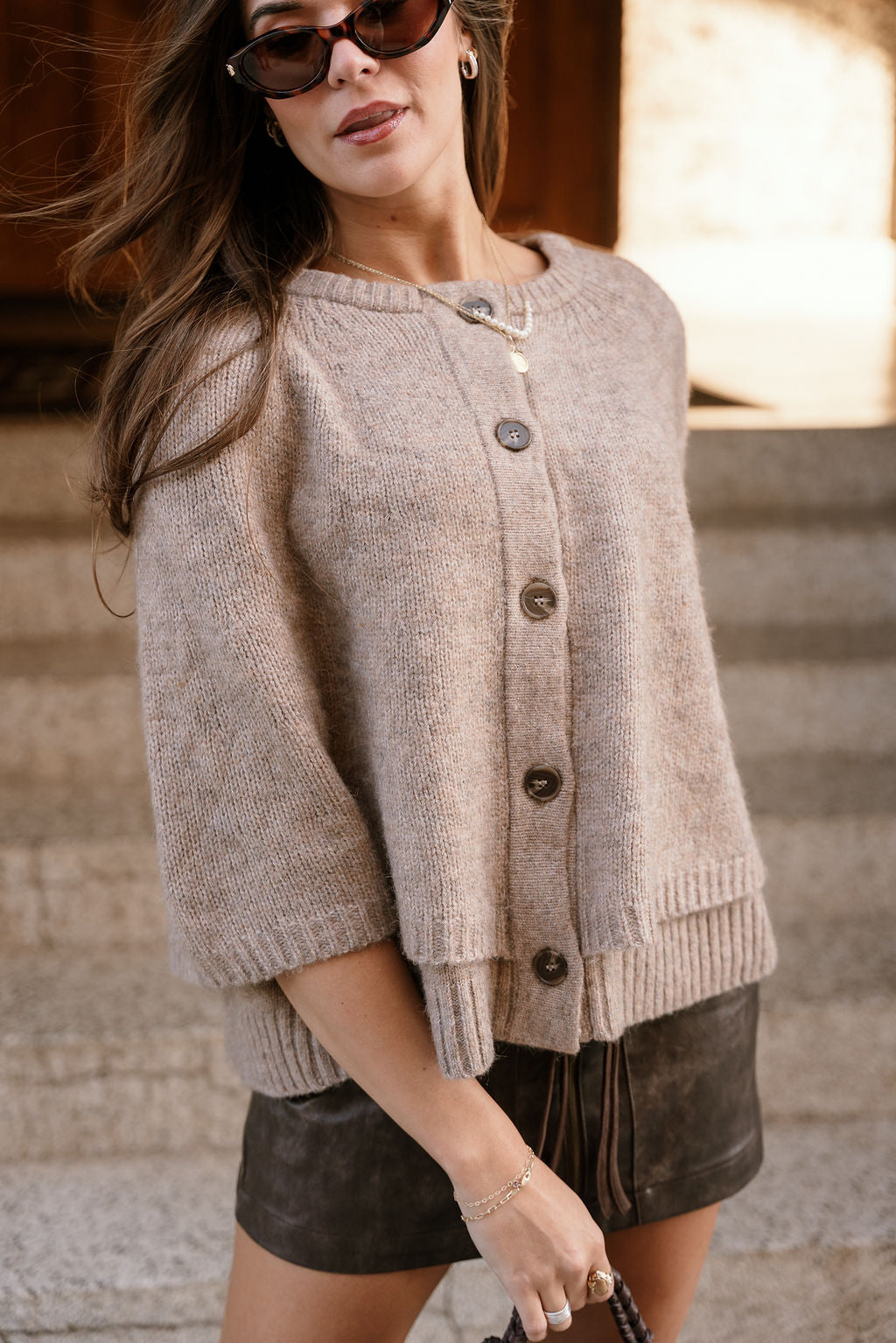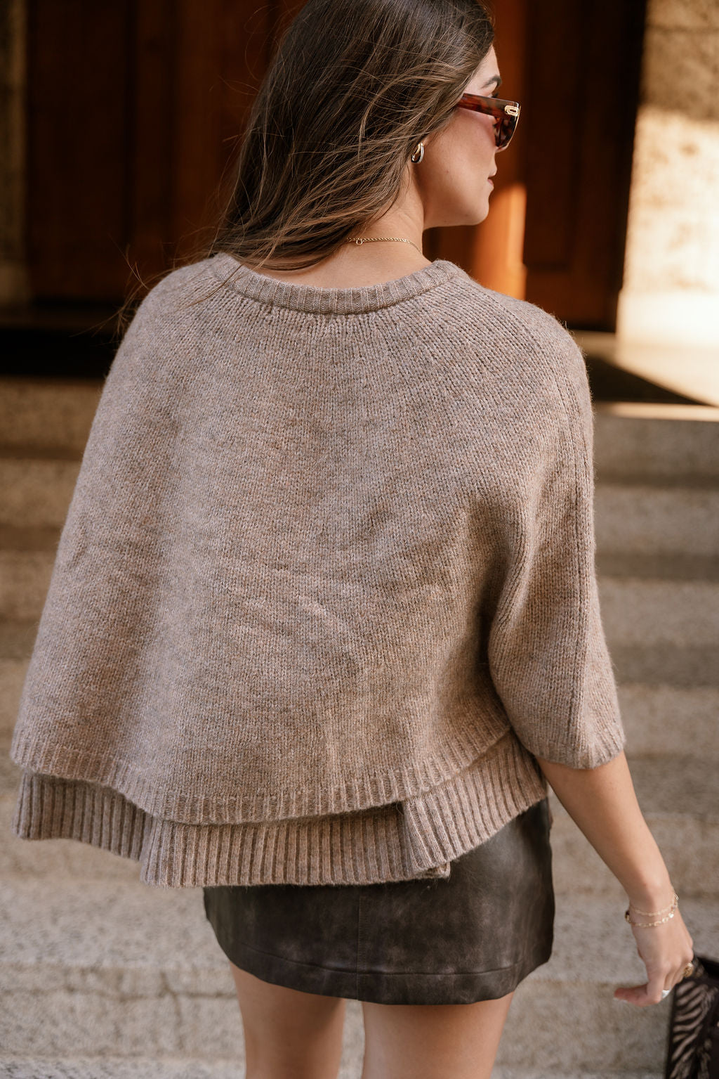 The Freya Taupe Knit Cape Cardigan brings effortless sophistication to your cold-weather style. Crafted from soft taupe knit fabric, this sleeveless design features a chic cape overlay that drapes beautifully over the shoulders. The tortoise button-up front and round neckline add classic charm, while the ribbed hem provides a polished finish. Perfect for layering over blouses or fitted tops, this cardigan offers a cozy yet elevated look for any occasion.