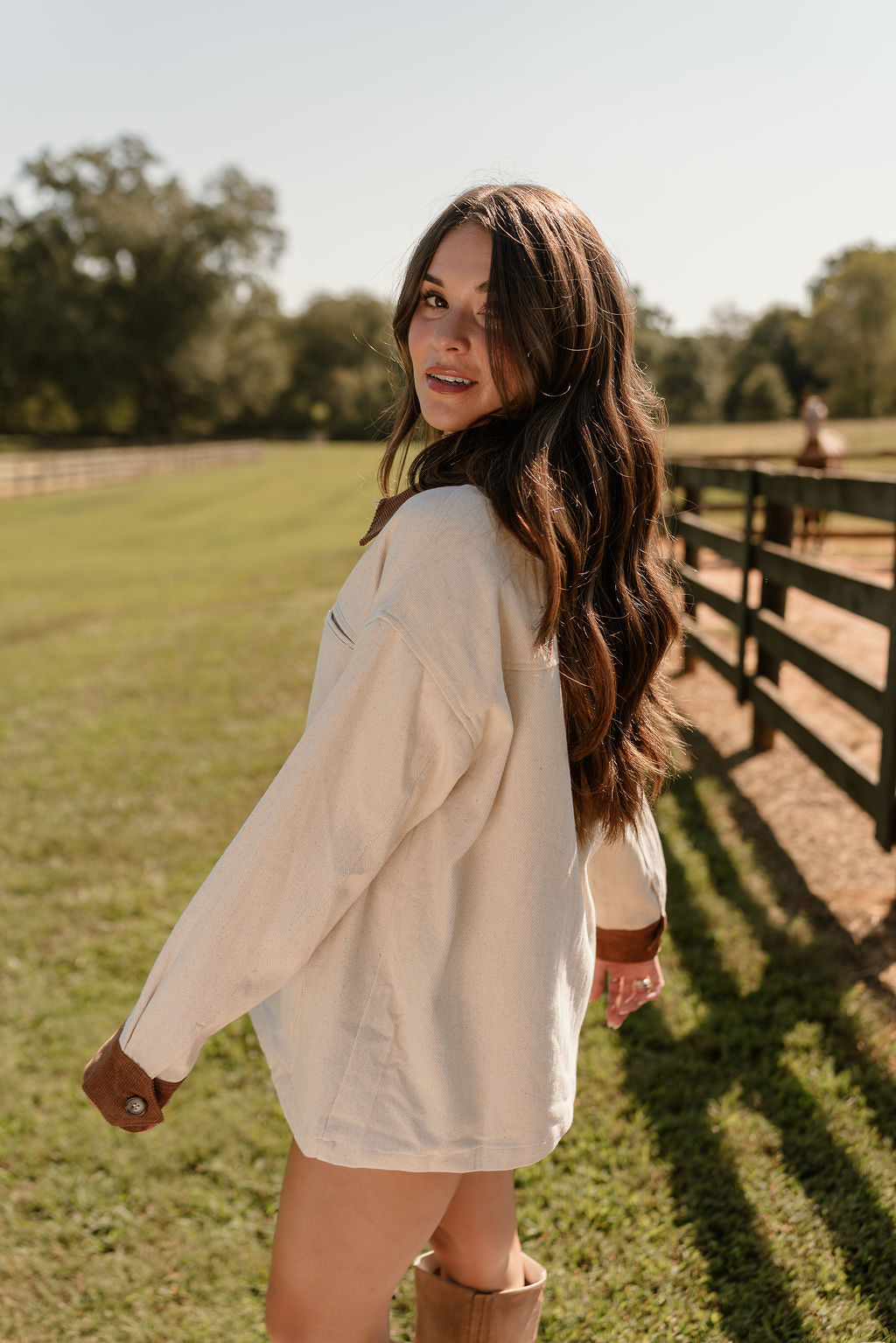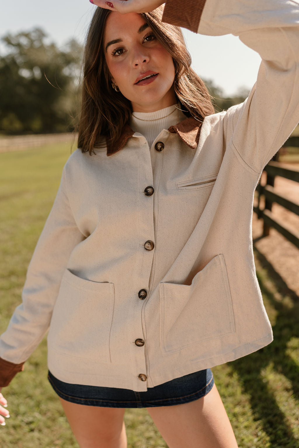 The Georgia Cream & Brown Barn Jacket is a timeless layering piece that beautifully blends classic details with a modern fit. Crafted from soft cream fabric, this jacket exudes understated elegance, while the brown corduroy accents on the collar and wrists add a nostalgic touch of vintage charm. The tortoise button-up front gives the jacket an elevated, refined finish, making it as stylish as it is functional.
