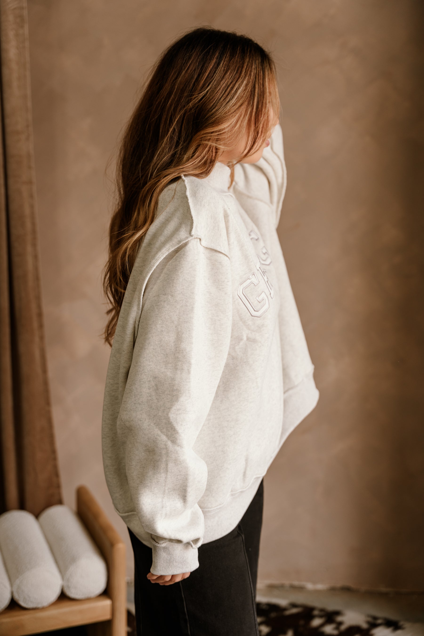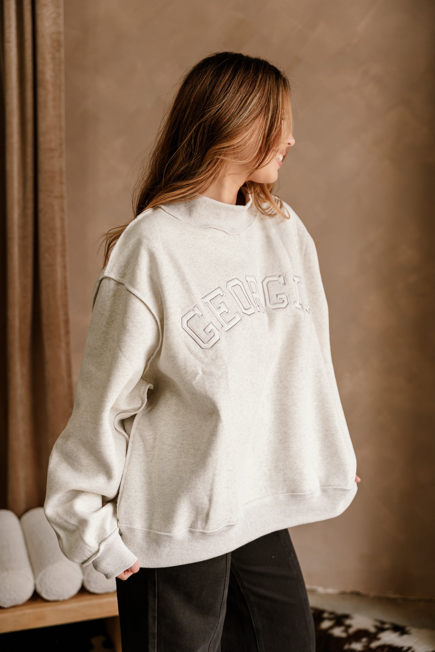 The Georgia Heather Grey High Neck Sweatshirt offers a cozy, collegiate-inspired look. Crafted from lightweight heather grey cotton, it features a high neckline and long sleeves for comfort and warmth. Finished with ribbed hem detailing and subtle "GEORGIA" lettering in matching grey, this sweatshirt is perfect for layering or wearing on its own for an effortlessly stylish, laid-back vibe.