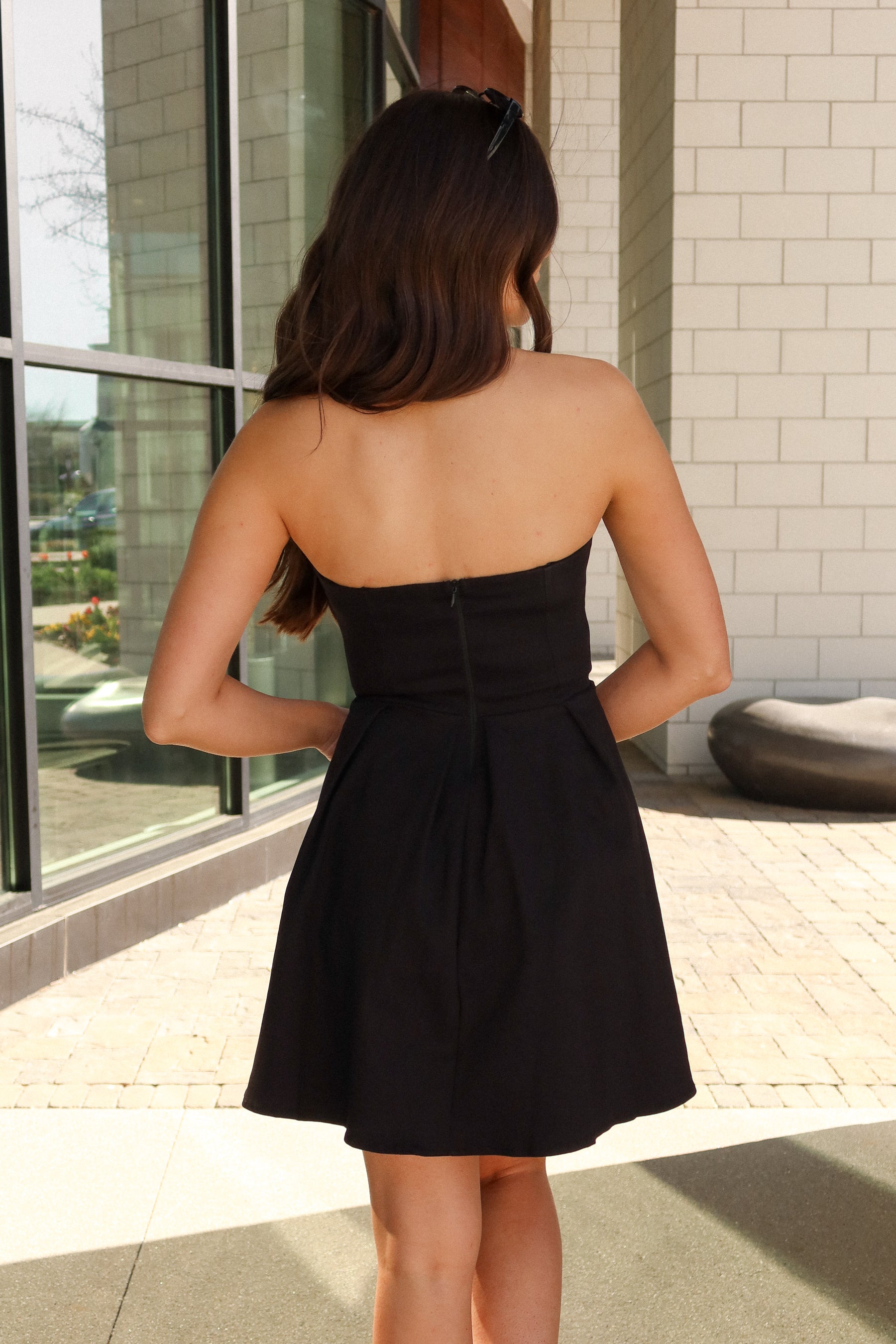Featuring a strapless neckline, the Gia dress highlights the shoulders and neckline for a timeless, sophisticated silhouette. The pleated details add texture and movement, while the flared hem creates a playful, feminine shape. Finished with a flattering mini length and a back zipper closure for a secure fit, this dress is perfect for nights out, parties, or special events.