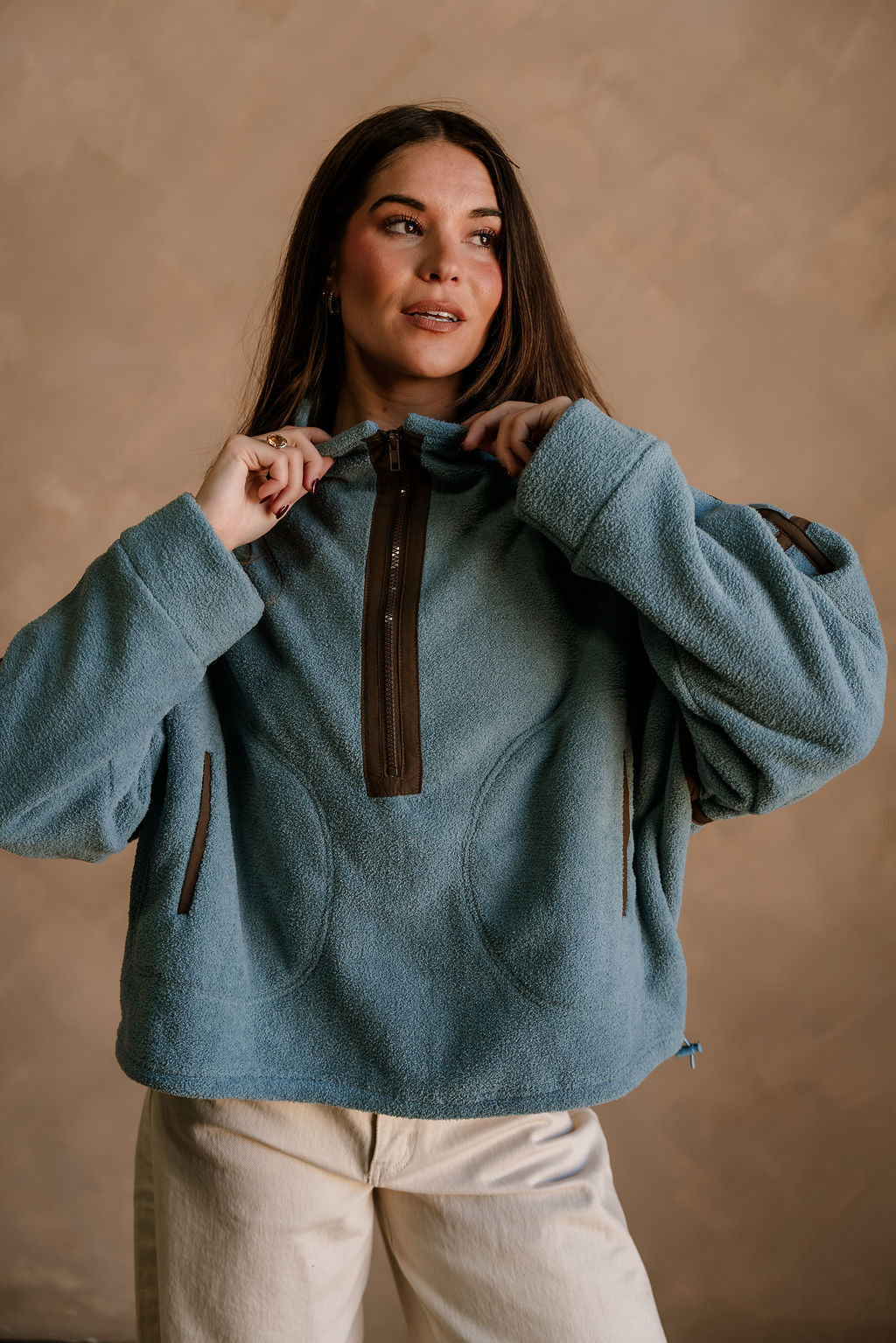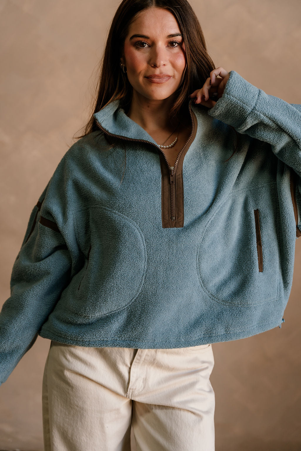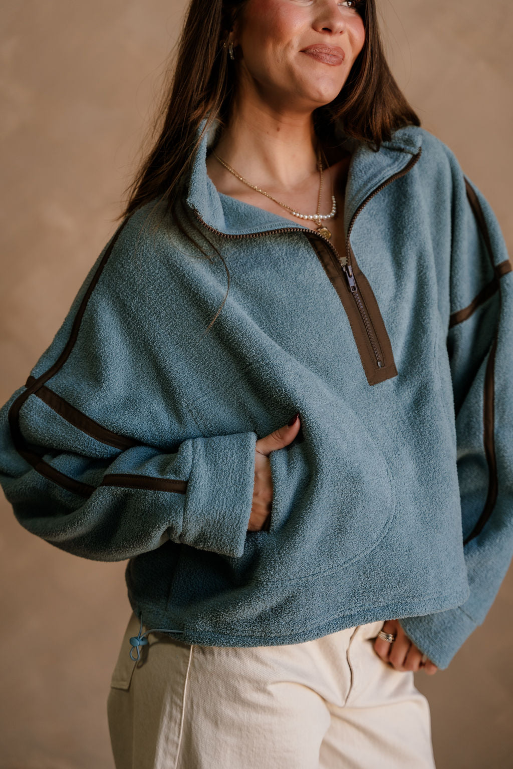 The Gia Blue & Brown Quarter Zip Pullover delivers warm, cozy comfort with a stylish color contrast. Crafted from soft slate blue fleece fabric, this pullover feels plush and lightweight while offering plenty of warmth. Brown trim details and a coordinating brown quarter zip-up add a rich, earthy accent that elevates the look. The high neckline, dropped shoulders, and long sleeves create that relaxed, easygoing fit perfect for everyday wear.